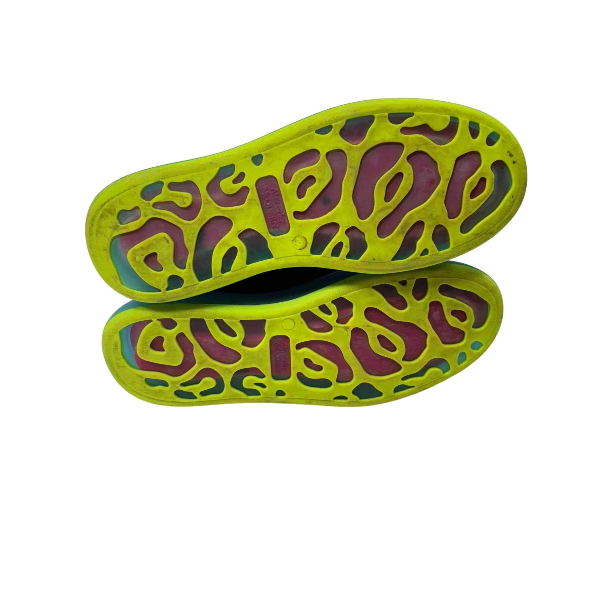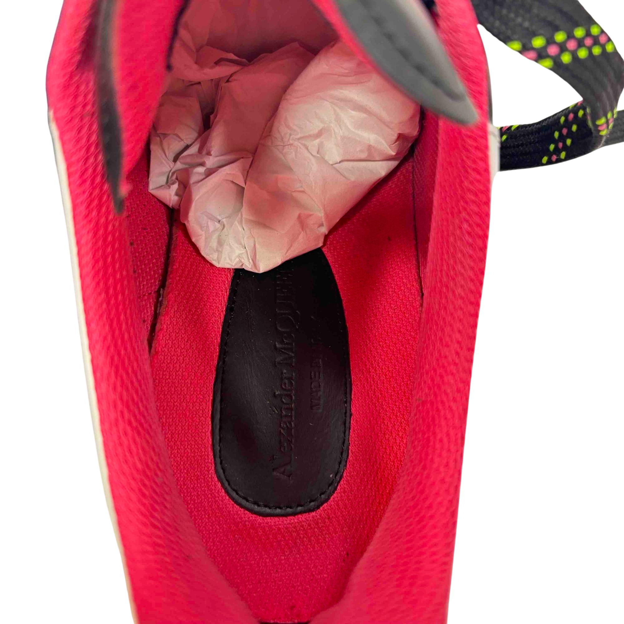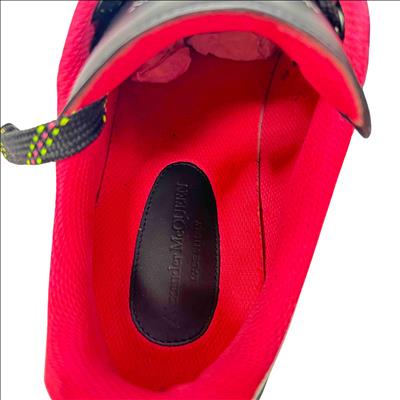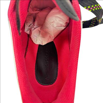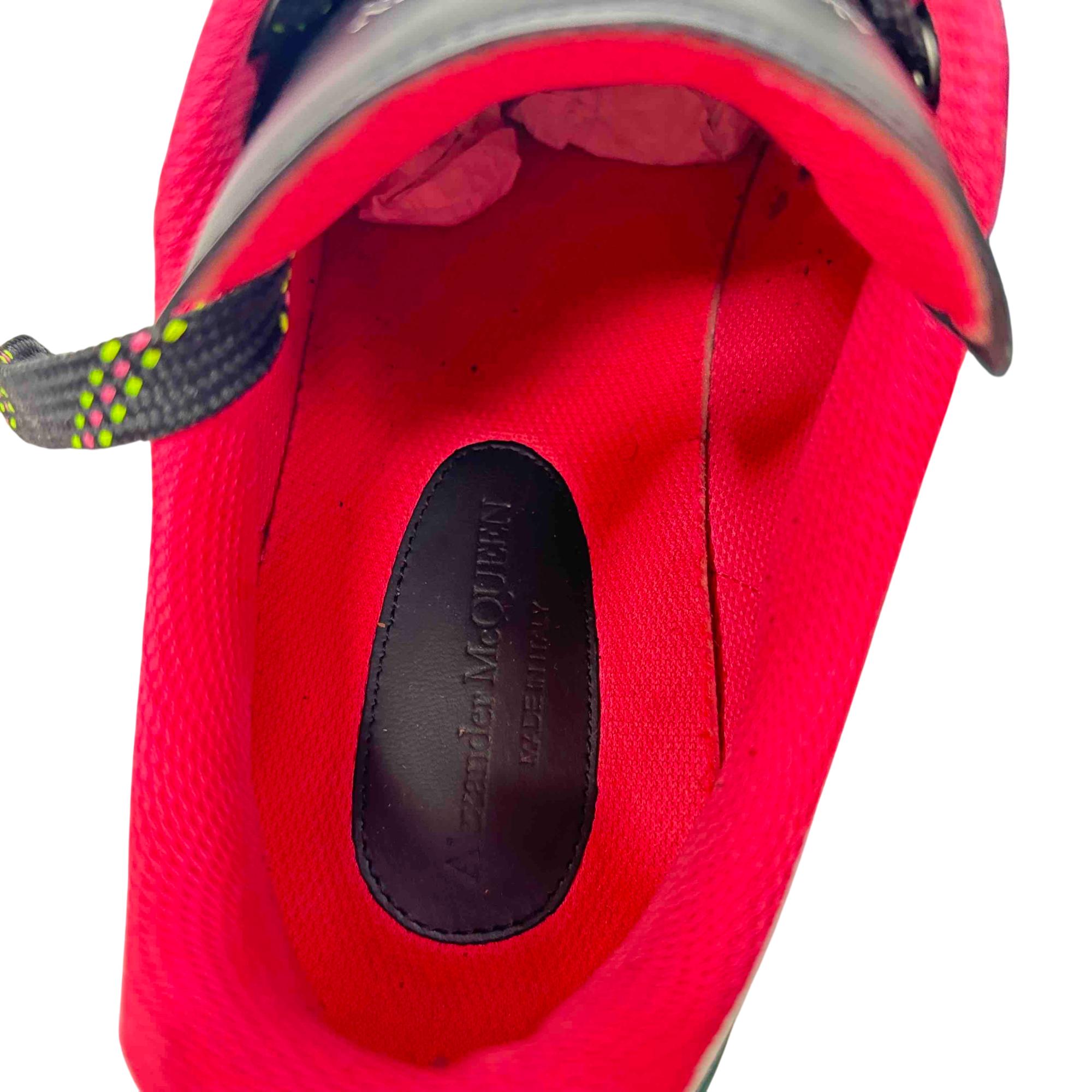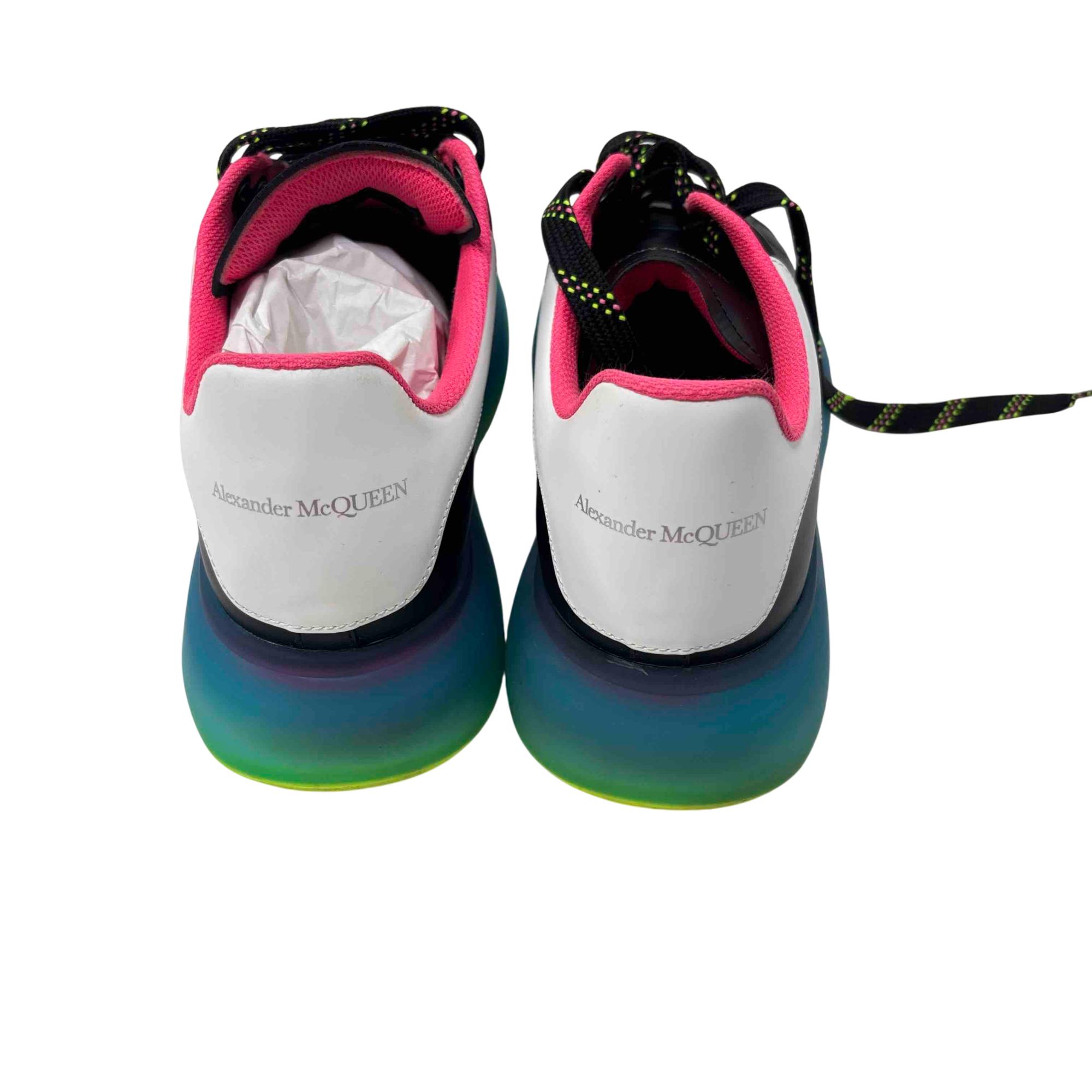 Alexander McQueen Oversized Sneakers - Black with Transparent Multicolor Sole, Pink Trim feature a sleek black leather upper with lace-up closure and a distinctive transparent sole accented with vibrant multicolor and pink trim. These designer sneakers combine high fashion with comfort, making them ideal for stylish everyday wear and outdoor activities.