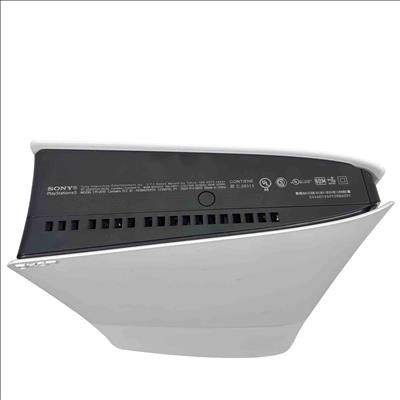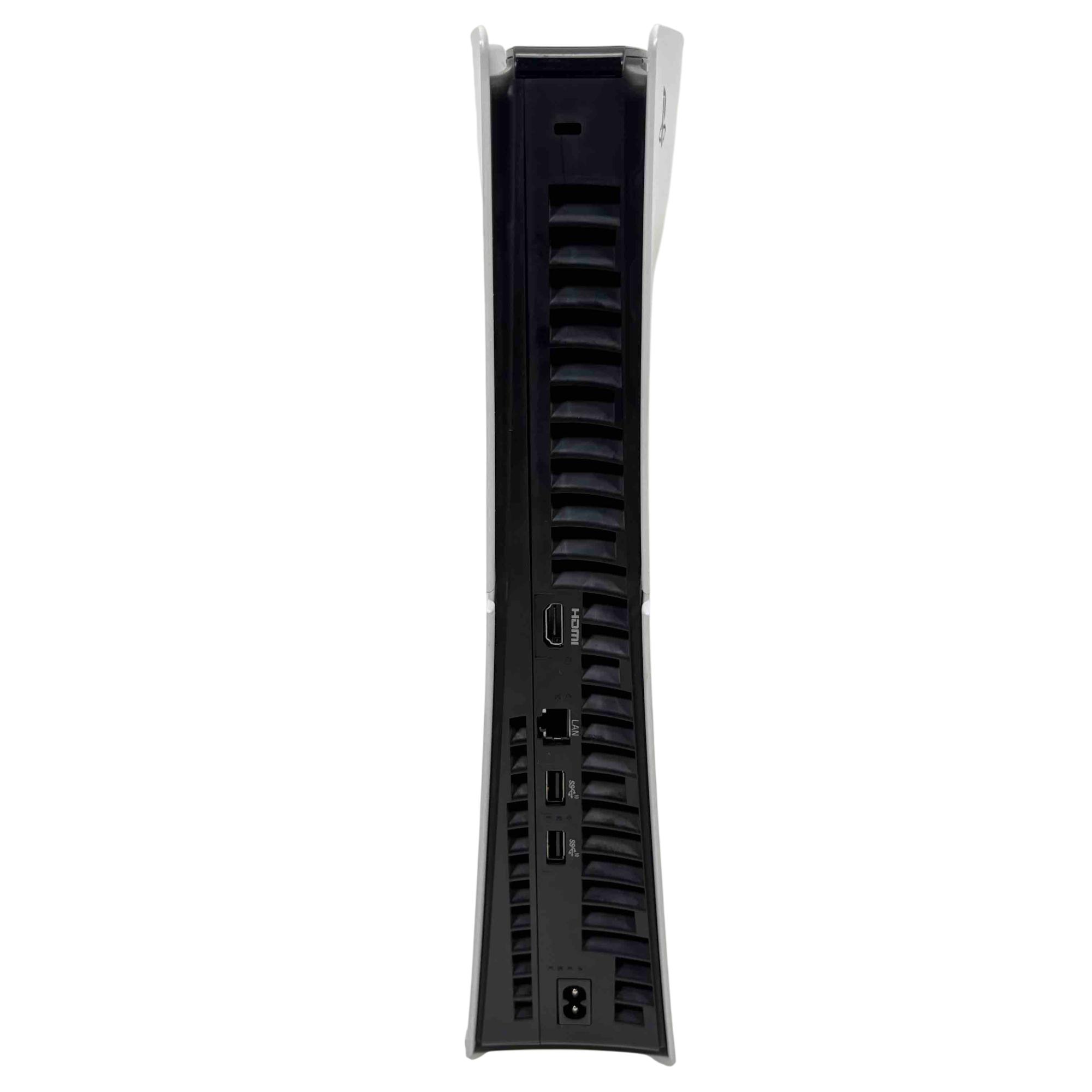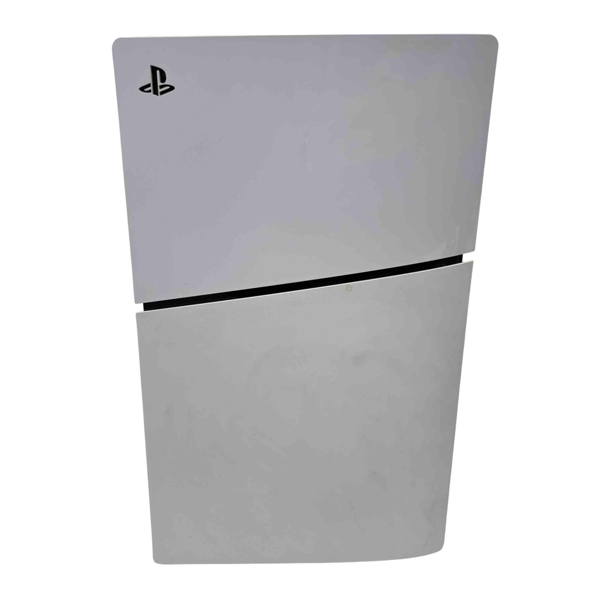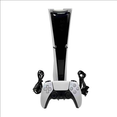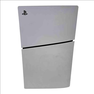 Sony PlayStation 5 Digital Edition Slim (Model CFI-2015) Console Bundle features a sleek white and black design with a streamlined rectangular shape and a black strip accent. This next-generation gaming console includes a powerful 1TB SSD and supports digital-only gameplay, offering fast load times and high-fidelity graphics for an immersive gaming experience.