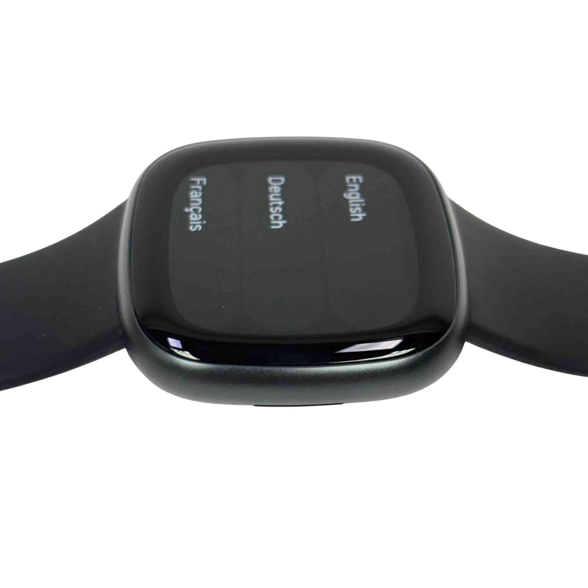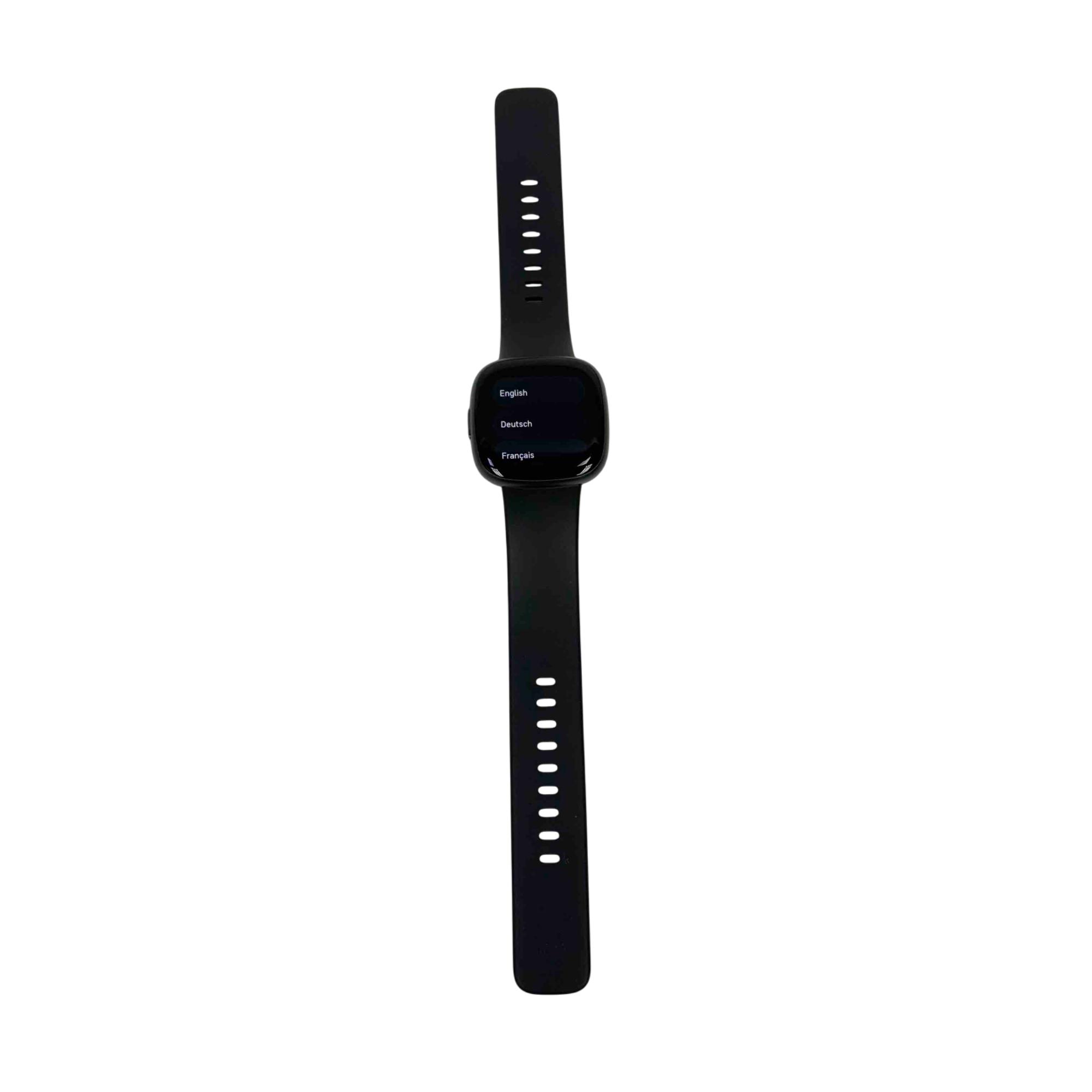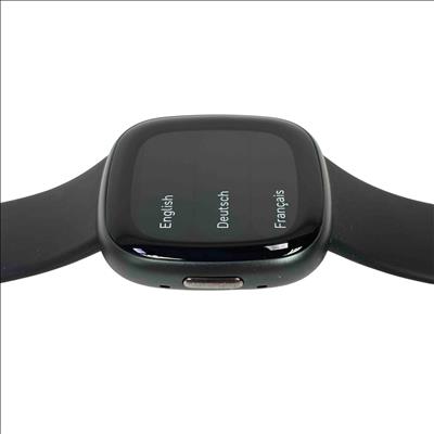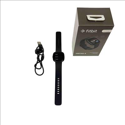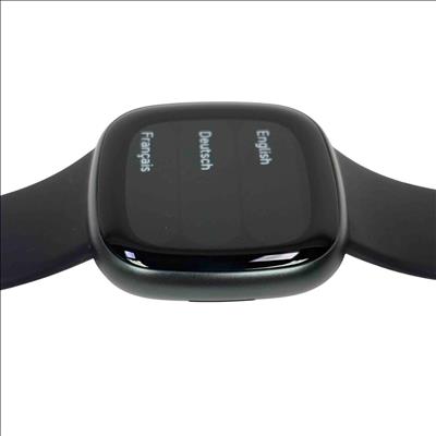 The Fitbit Versa 4 FB523 Fitness Activity Tracker is a sleek black fitness smartwatch designed to track your health and activity with precision. Featuring a vibrant screen and comprehensive fitness monitoring tools, it supports multiple languages including English, Deutsch, and Français for a versatile user experience.