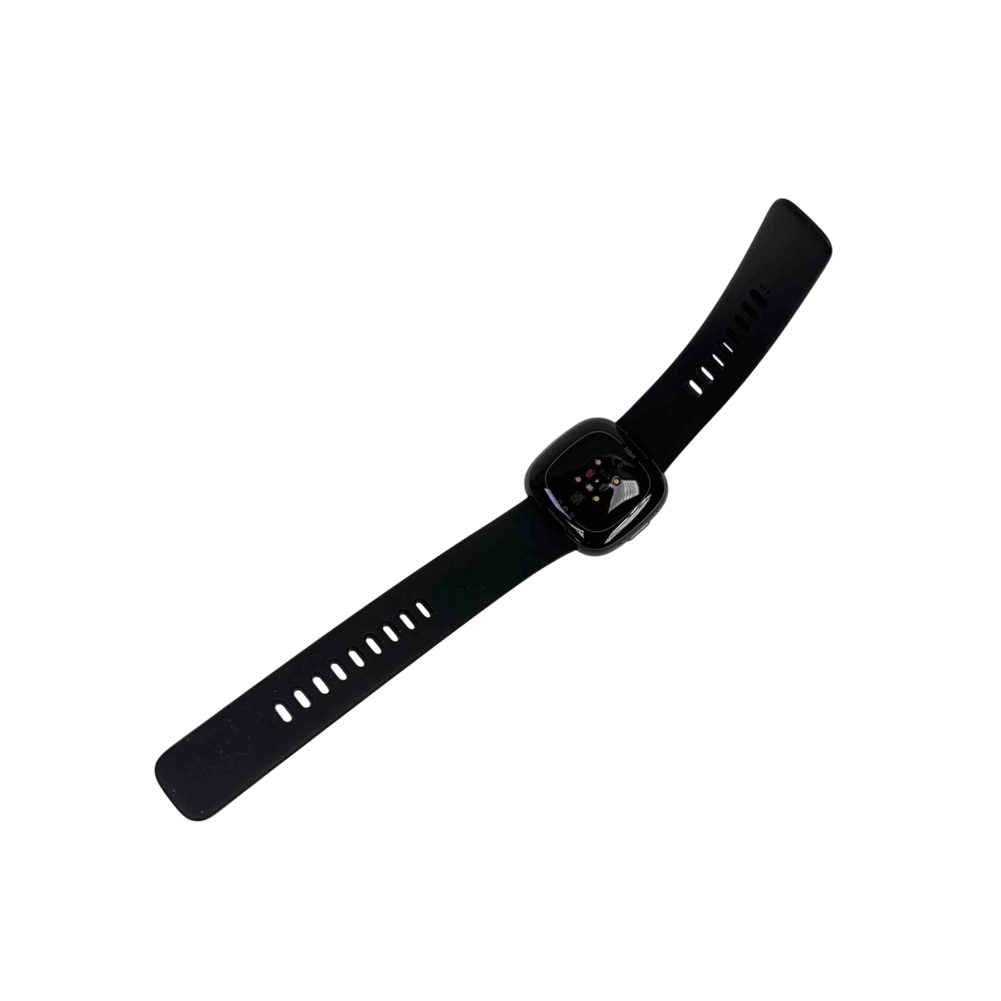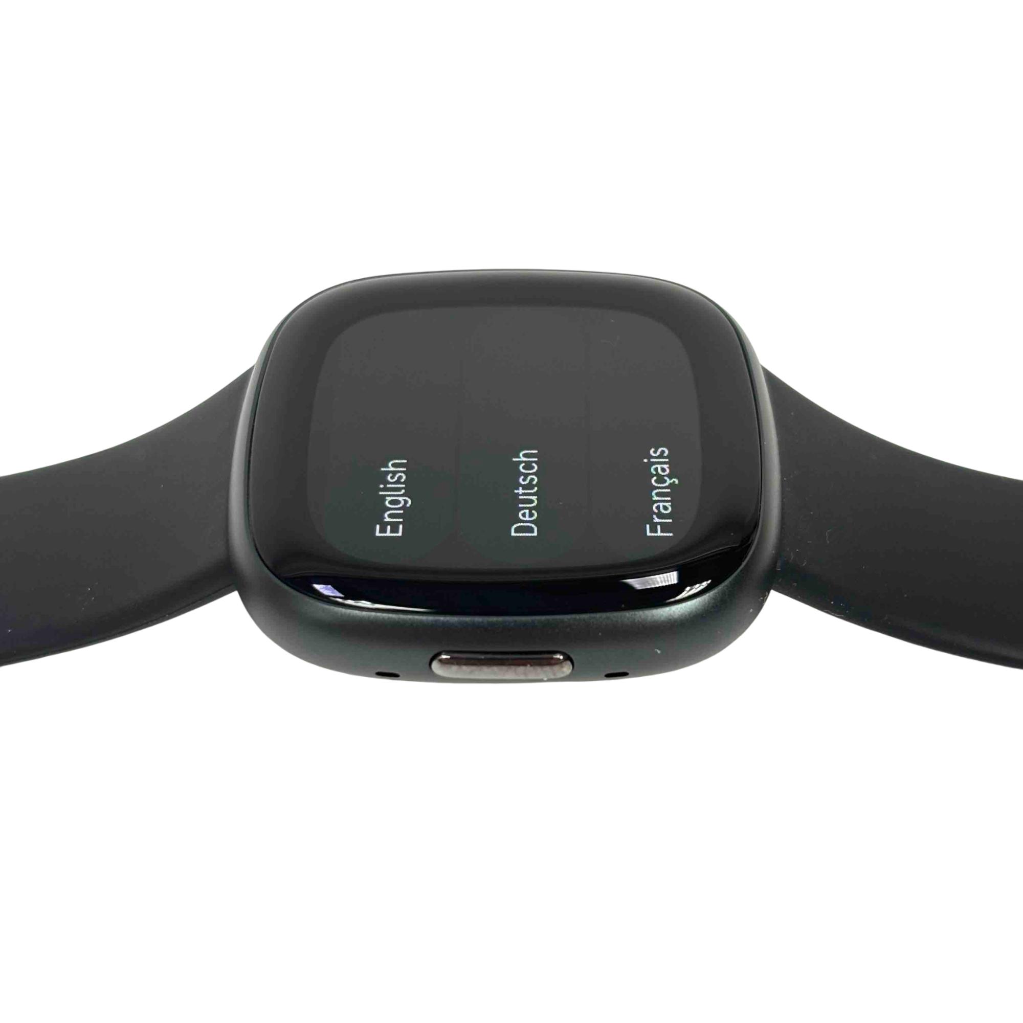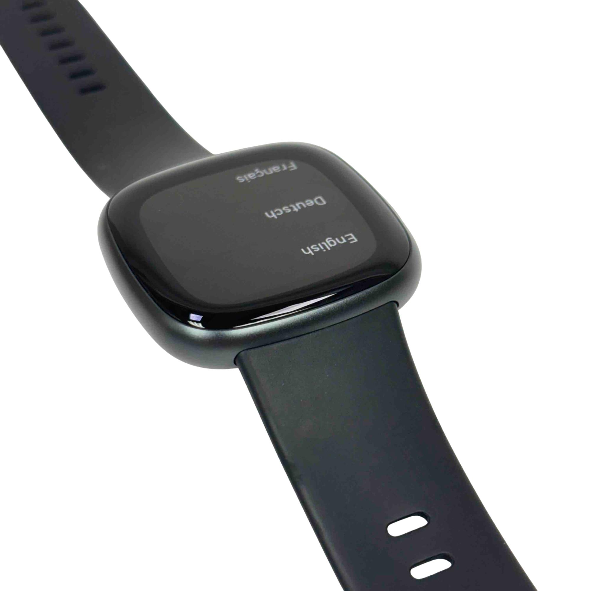 The Fitbit Versa 4 FB523 Fitness Activity Tracker is a sleek black fitness smartwatch designed to track your health and activity with precision. Featuring a vibrant screen and comprehensive fitness monitoring tools, it supports multiple languages including English, Deutsch, and Français for a versatile user experience.