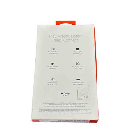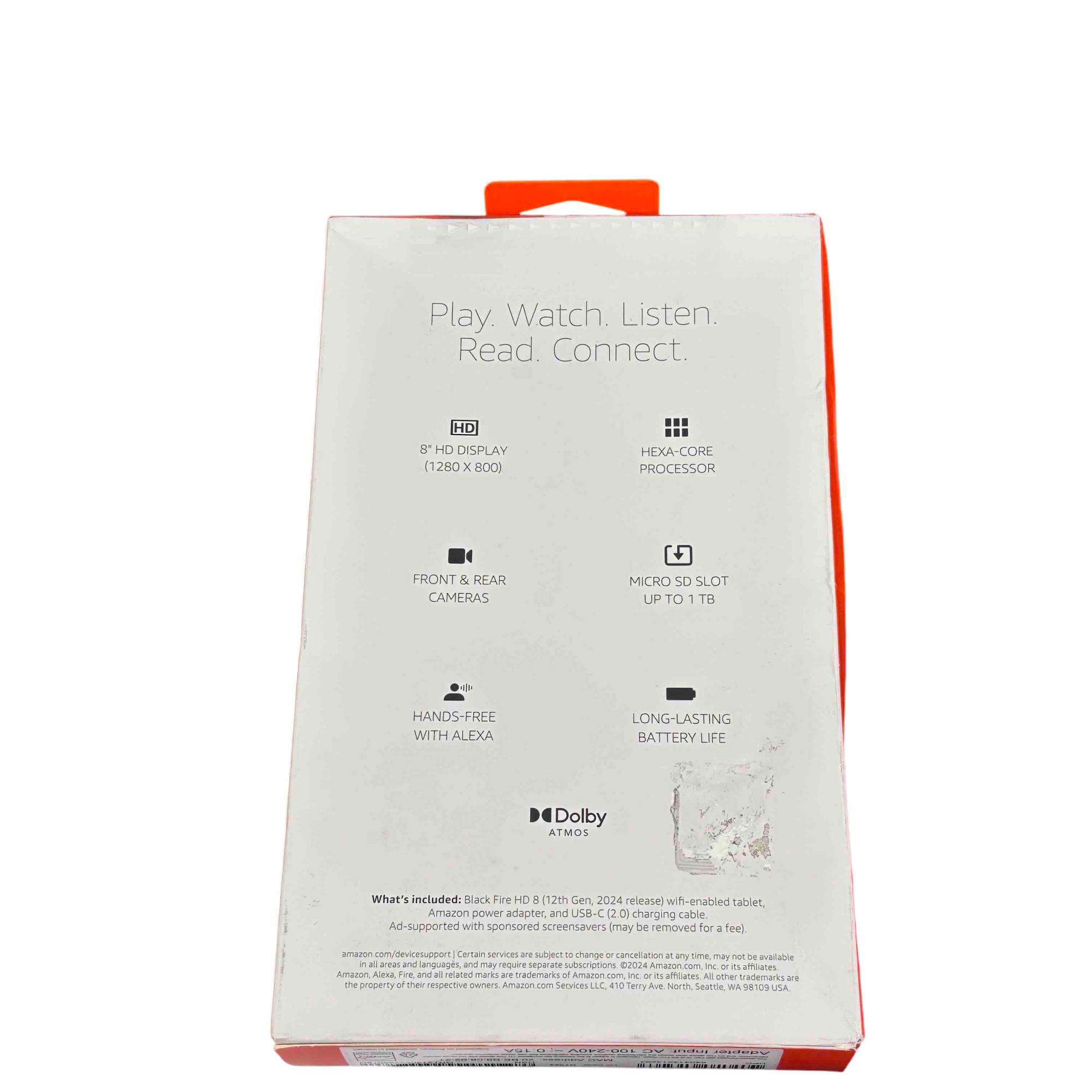 Amazon Fire HD 8 Tablet (12th Gen, 2024 Release) features an 8-inch HD display with a resolution of 1280 x 800, powered by a hexa-core processor and equipped with 3GB RAM and 32GB of internal storage expandable via microSD slot up to 1TB. This black, Wi-Fi enabled tablet supports front and rear cameras, hands-free Alexa, Dolby Atmos audio, and long-lasting battery life, making it ideal for streaming, reading, and browsing with ad-supported screensavers.