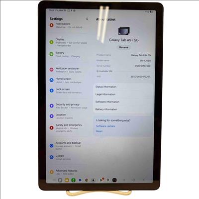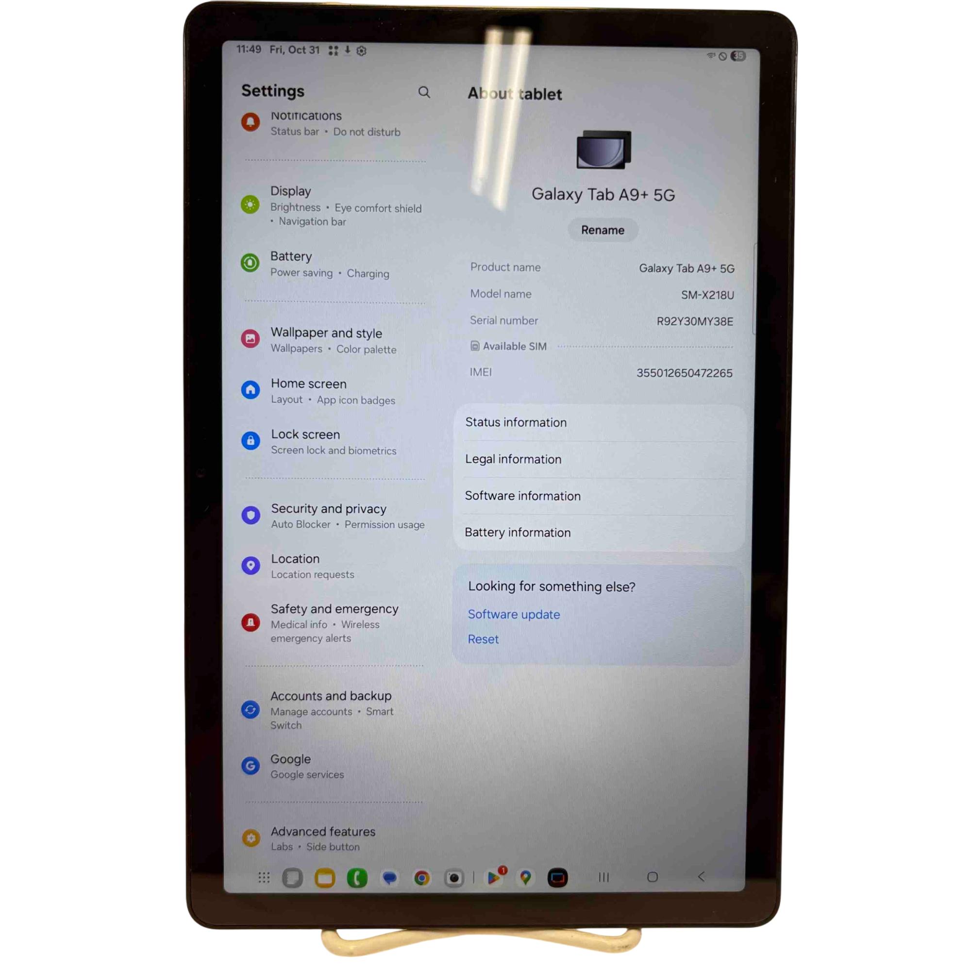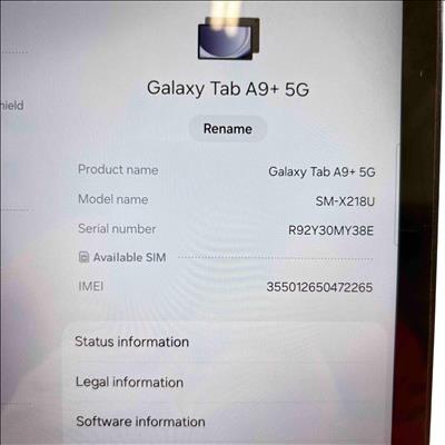 Samsung Galaxy Tab A9+ 5G Tablet - Model SM-X218U features a sleek design with a grey rectangular body and black border, offering a 5G-enabled portable computing experience. It comes equipped with 4GB RAM and 64GB storage, running on a user-friendly interface ideal for multimedia, gaming, and communication. This versatile tablet delivers enhanced brightness, eye comfort shield, and easy navigation for productivity and entertainment.