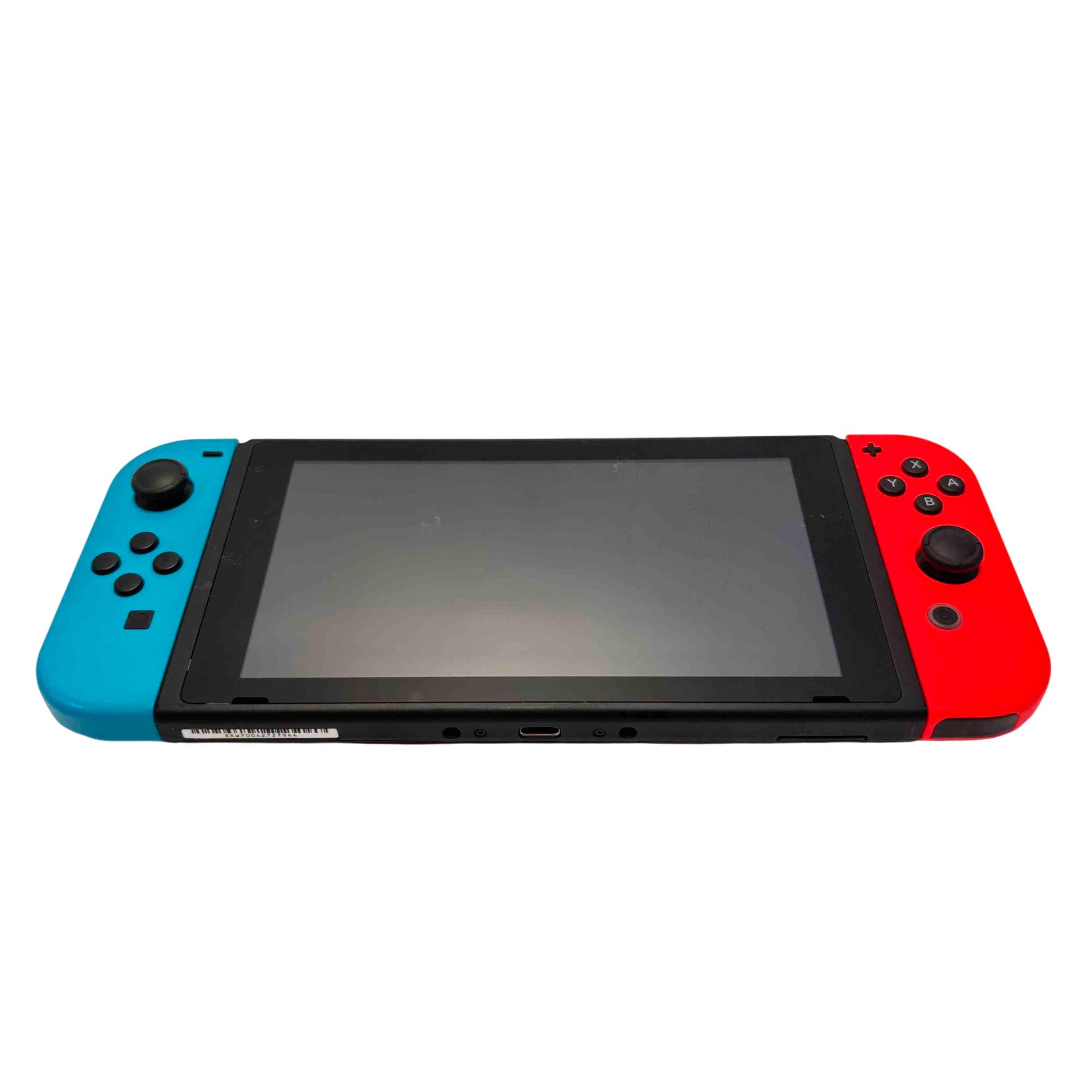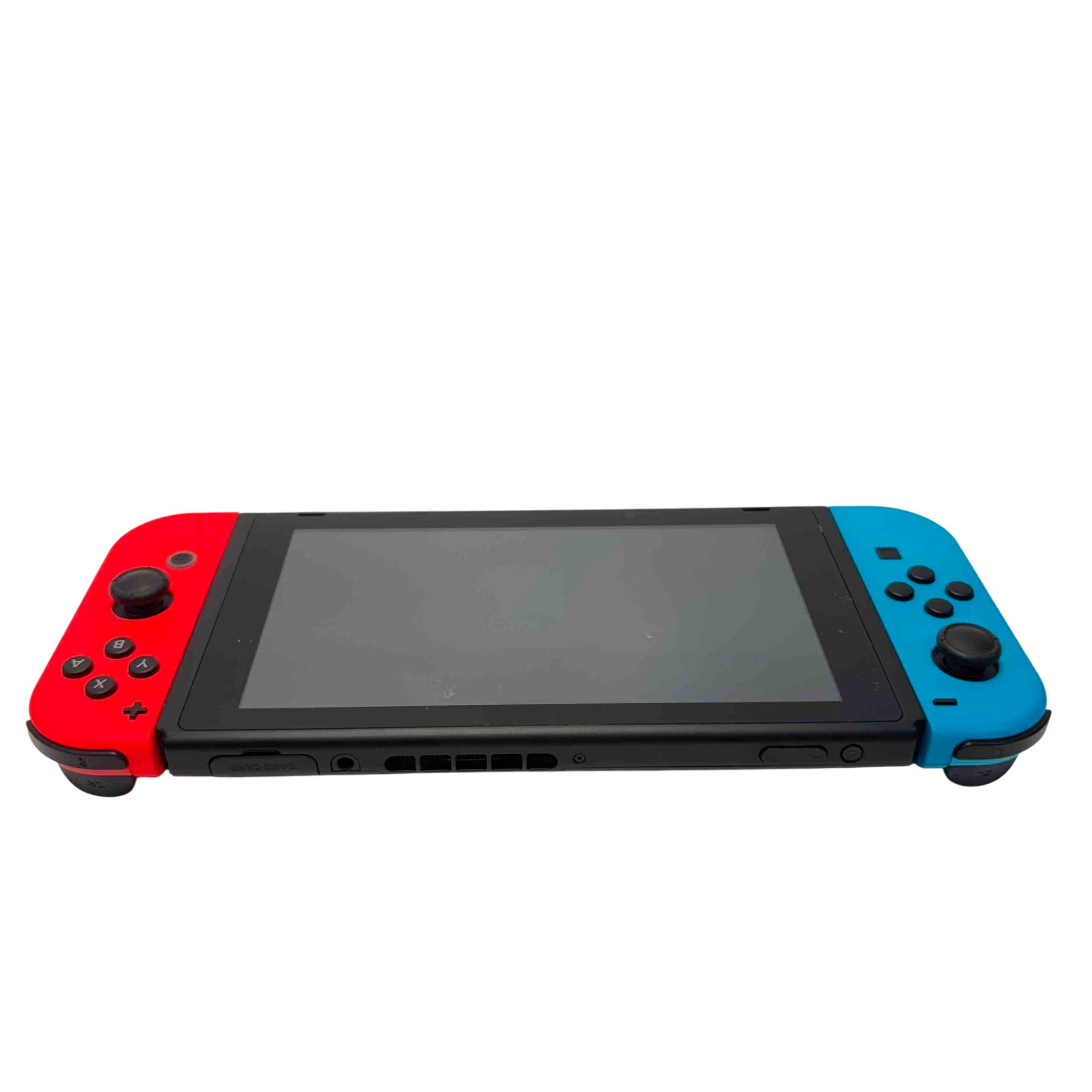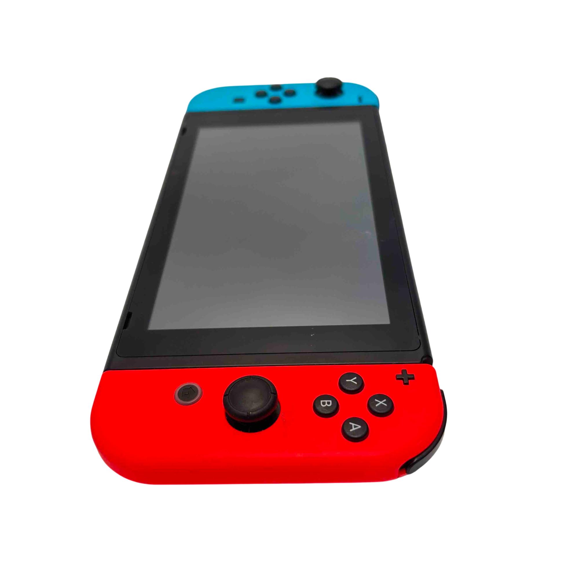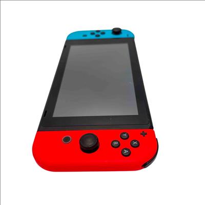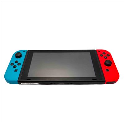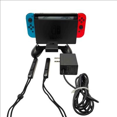 Nintendo Switch Console HAC-001(-01) with Neon Red/Blue Joy-Con, Dock, AC Adapter, Joy-Con Grip, and Straps is a versatile gaming system featuring a 32GB storage capacity and includes all essential accessories for handheld, tabletop, and TV mode play. This official Nintendo device offers seamless connectivity with the included dock station and AC power adapter for charging and TV output. Perfect for immersive gaming with flexible control options and vivid Neon Red and Blue Joy-Con controllers.