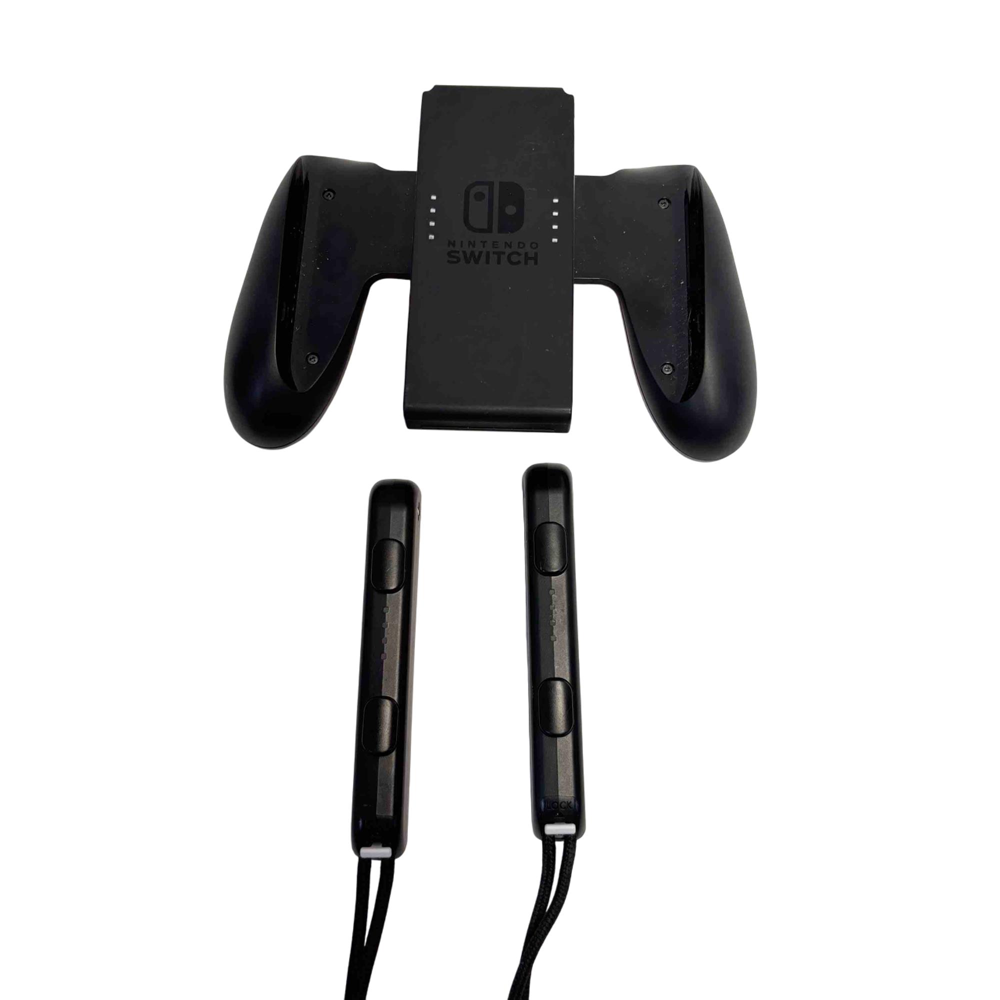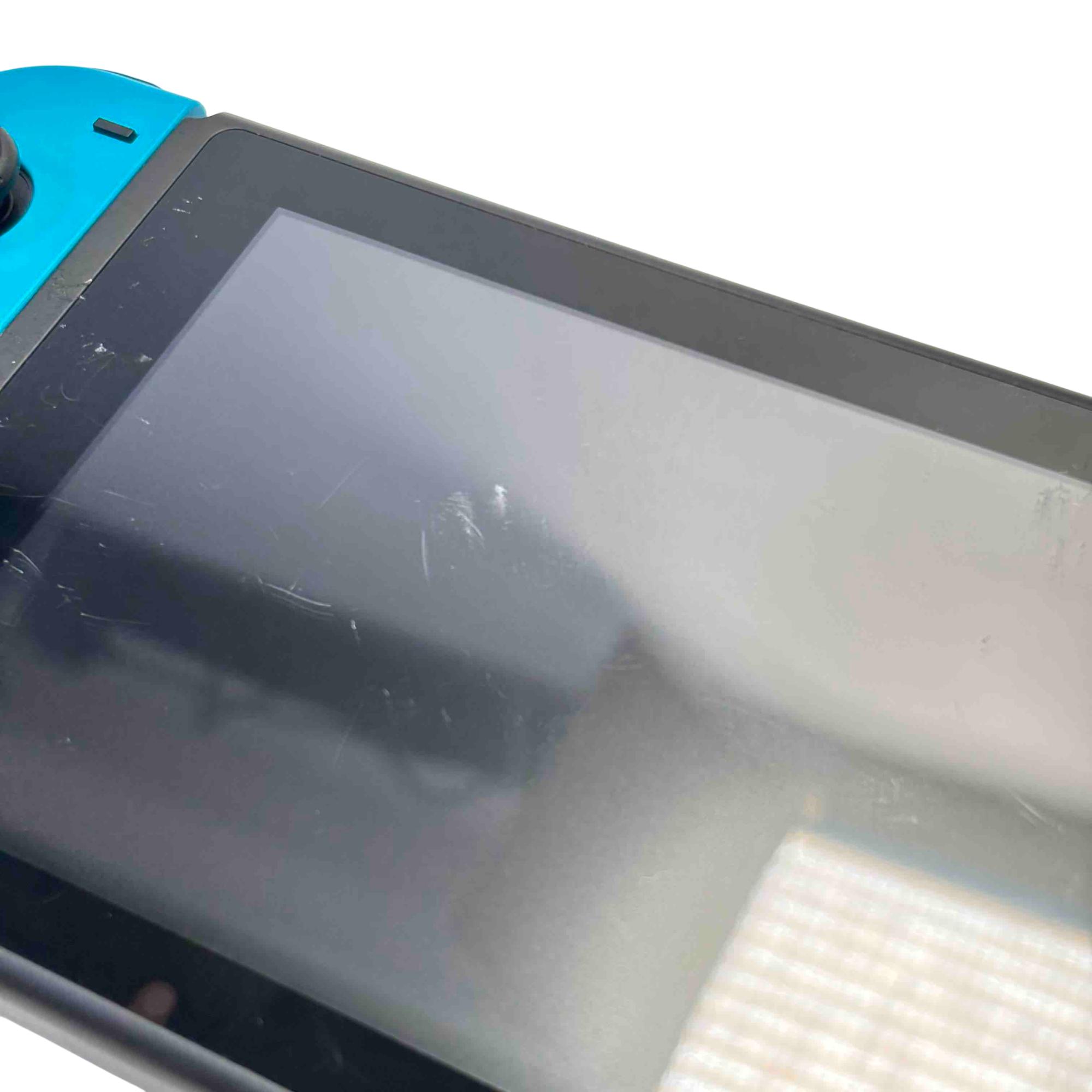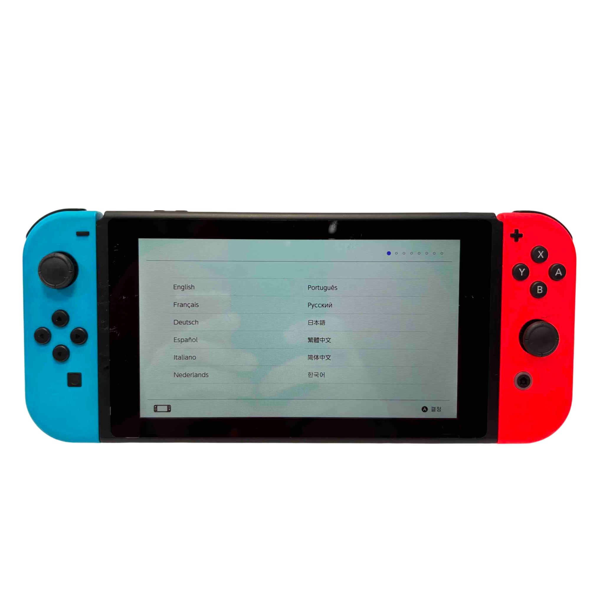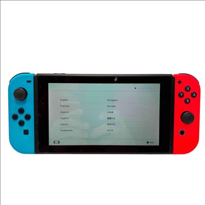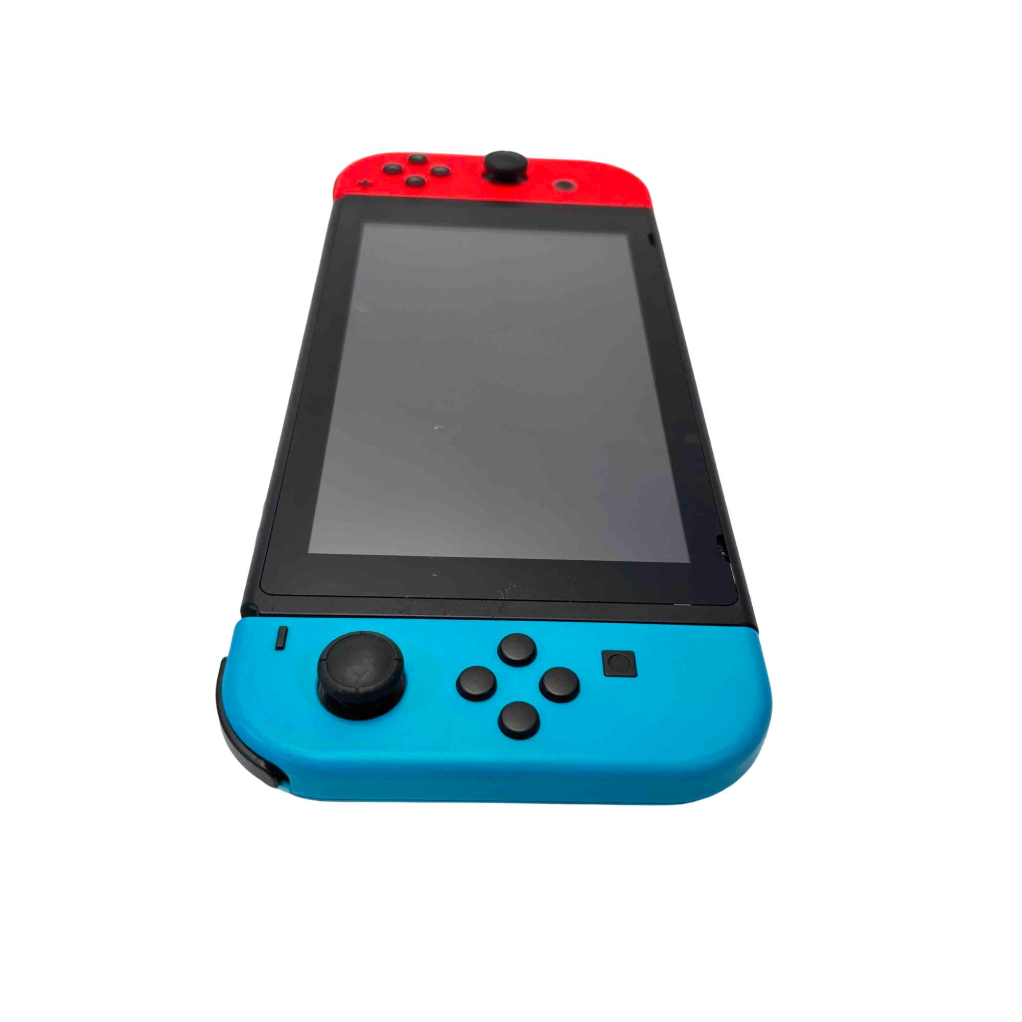 Nintendo Switch Console HAC-001(-01) with Neon Red/Blue Joy-Con, Dock, AC Adapter, Joy-Con Grip, and Straps is a versatile gaming system featuring a 32GB storage capacity and includes all essential accessories for handheld, tabletop, and TV mode play. This official Nintendo device offers seamless connectivity with the included dock station and AC power adapter for charging and TV output. Perfect for immersive gaming with flexible control options and vivid Neon Red and Blue Joy-Con controllers.