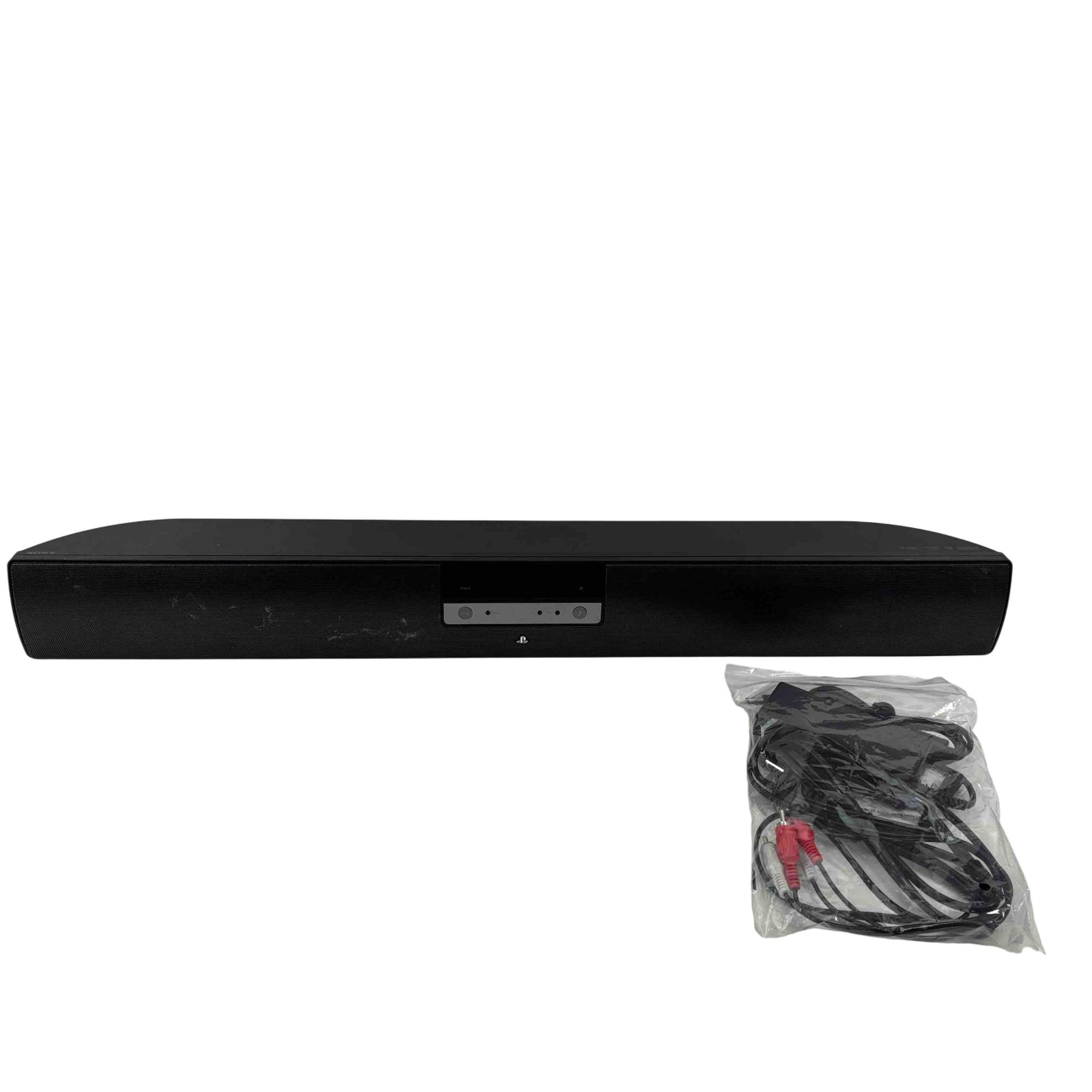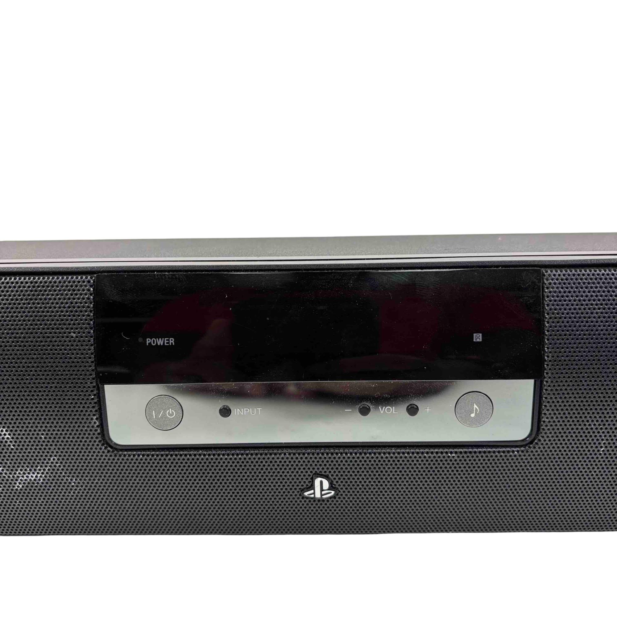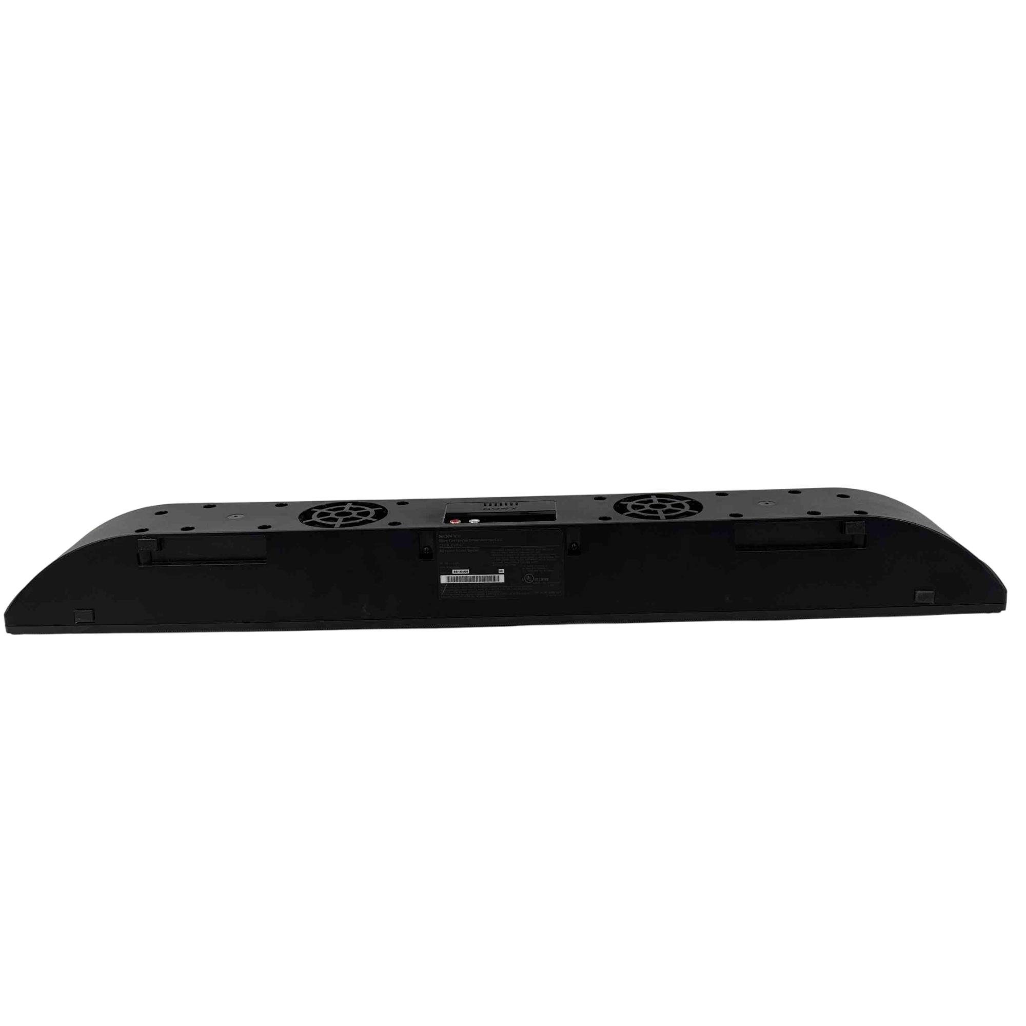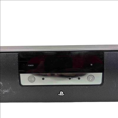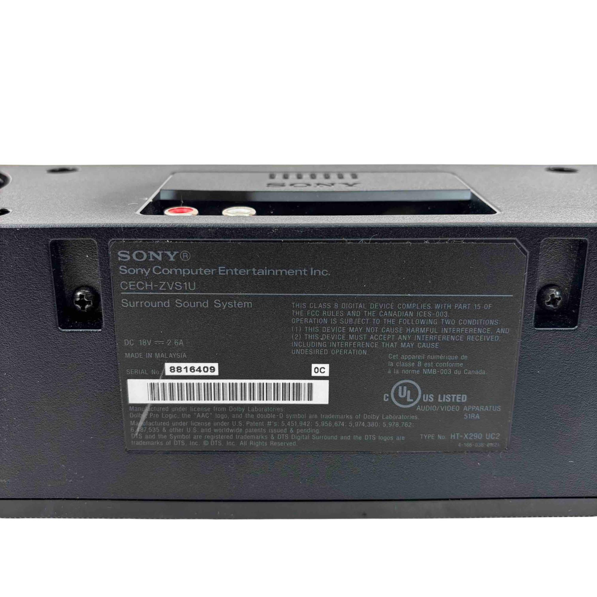 Sony CECH-ZVS1U PS3 Surround Sound System Soundbar delivers immersive audio designed specifically for PlayStation 3 consoles. Featuring Dolby Pro Logic and DTS Digital Surround technologies, this black rectangular soundbar enhances your gaming and multimedia experience with clear, powerful surround sound output. It includes a black power cord and is compatible with standard PS3 setups.