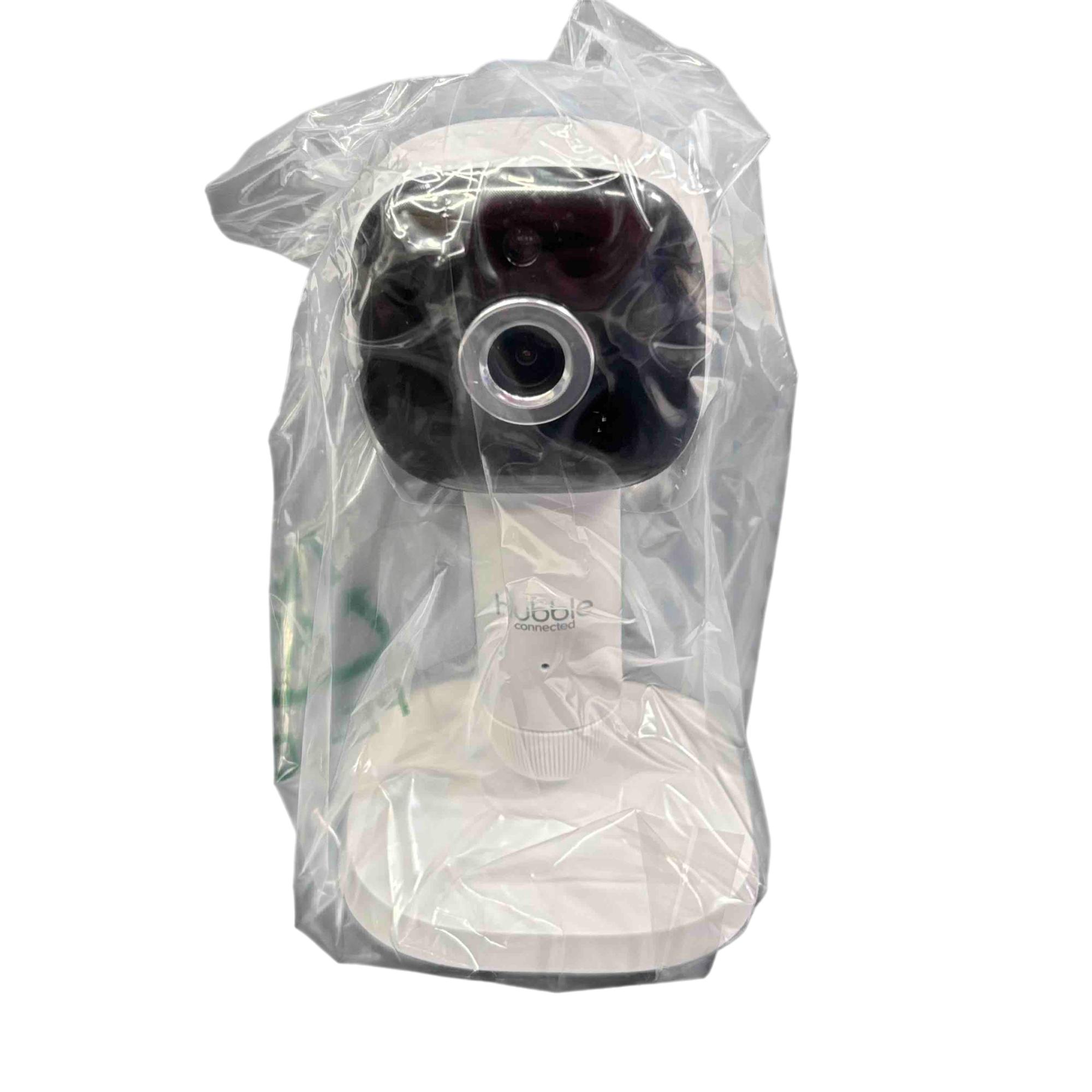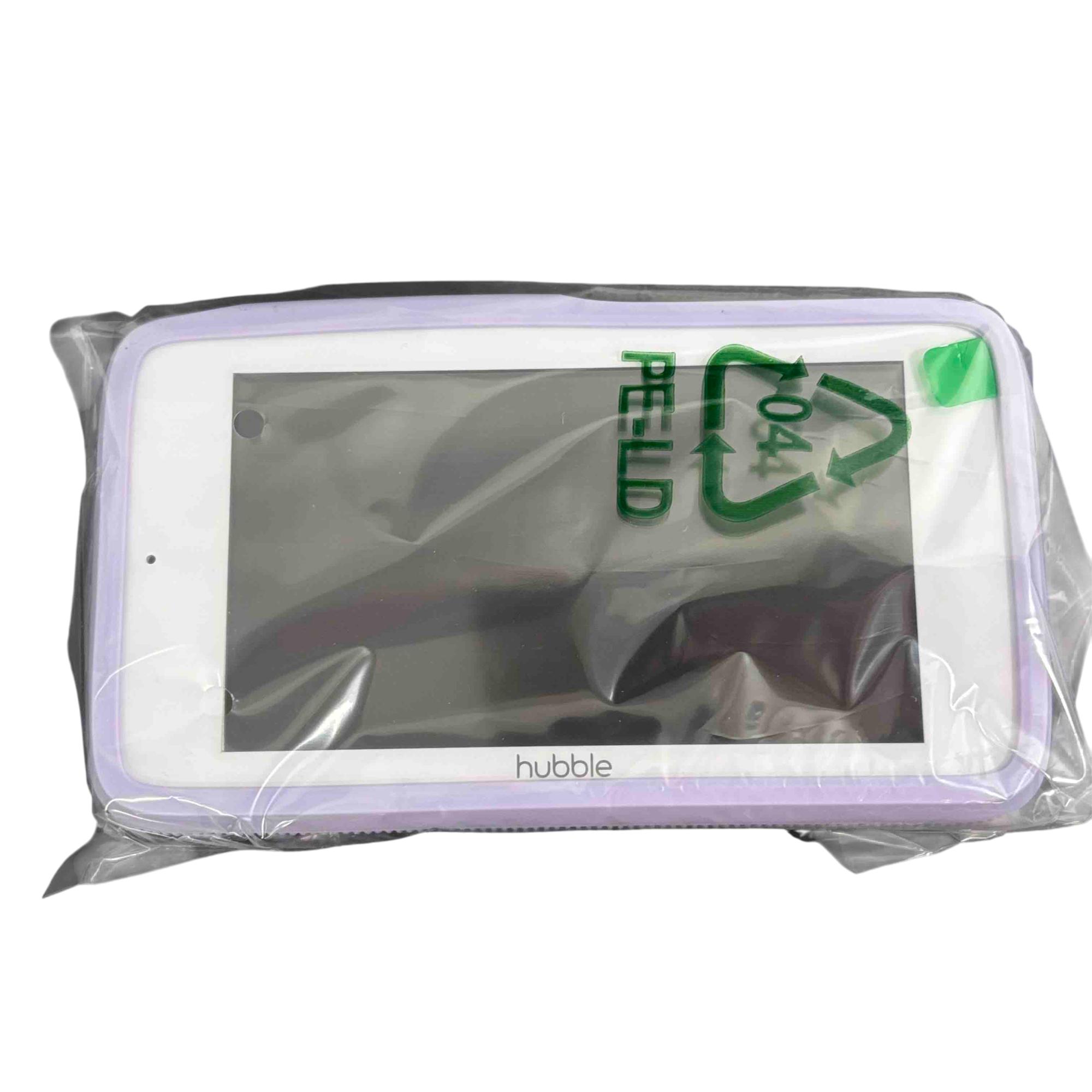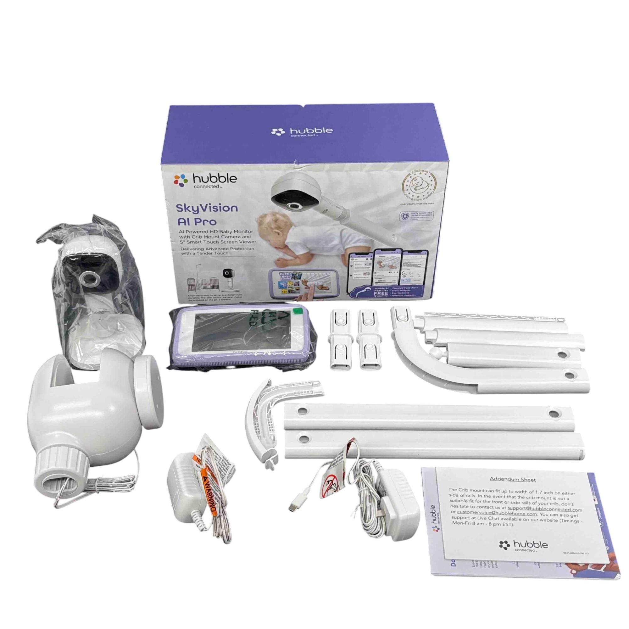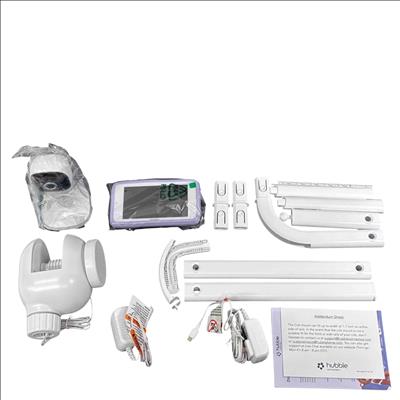 Hubble Connected HCTNSKYPRX Baby Monitor features a white electronic device designed for secure attachment to crib rails up to 1.7 inches wide. This baby monitor includes a rectangular screen and accessories, all neatly packaged with clear labeling and barcode identification, ensuring easy setup and reliable monitoring.