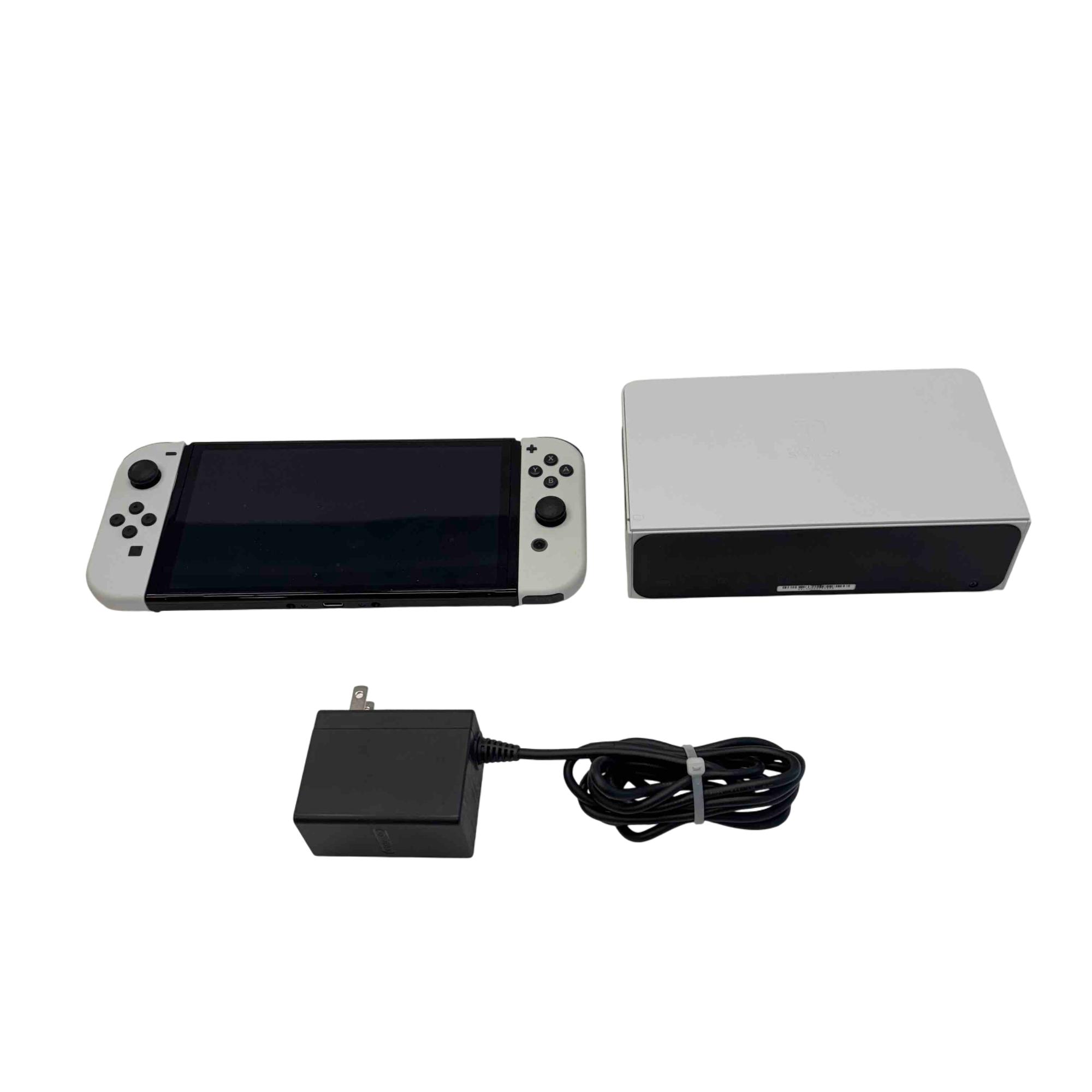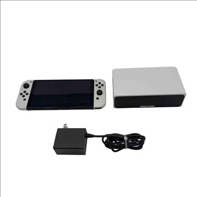 Nintendo Switch OLED Model HEG-001 64GB Handheld Console with White Joy-Con, Dock, and Charger features a vibrant 7-inch OLED screen for enhanced color and contrast. This model includes 64GB of internal storage, a sleek white Joy-Con controller set, and a dock for seamless TV connectivity. Ideal for versatile gaming both on-the-go and at home, it supports multiplayer and flexible play styles.