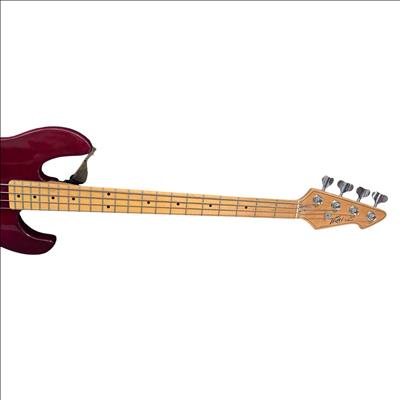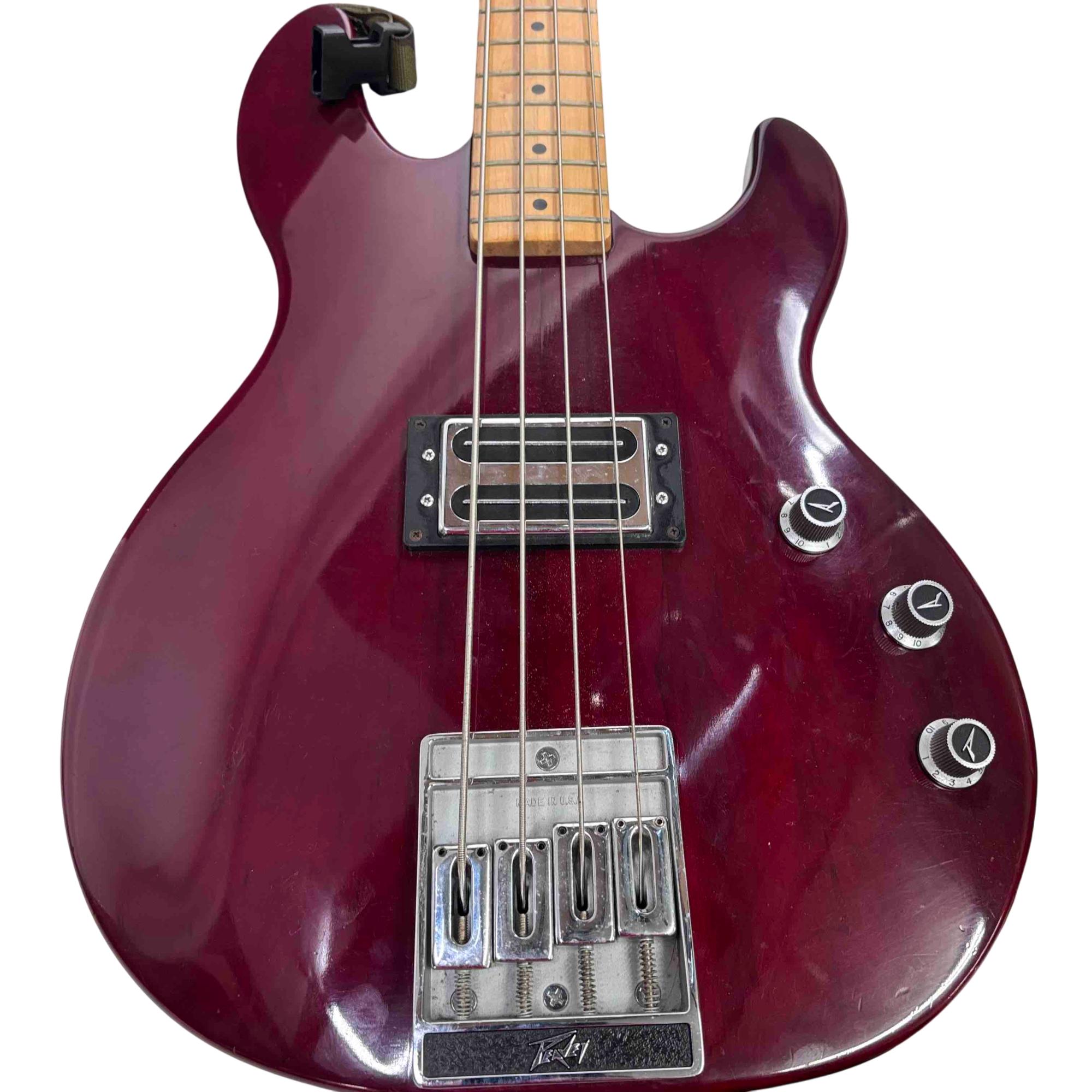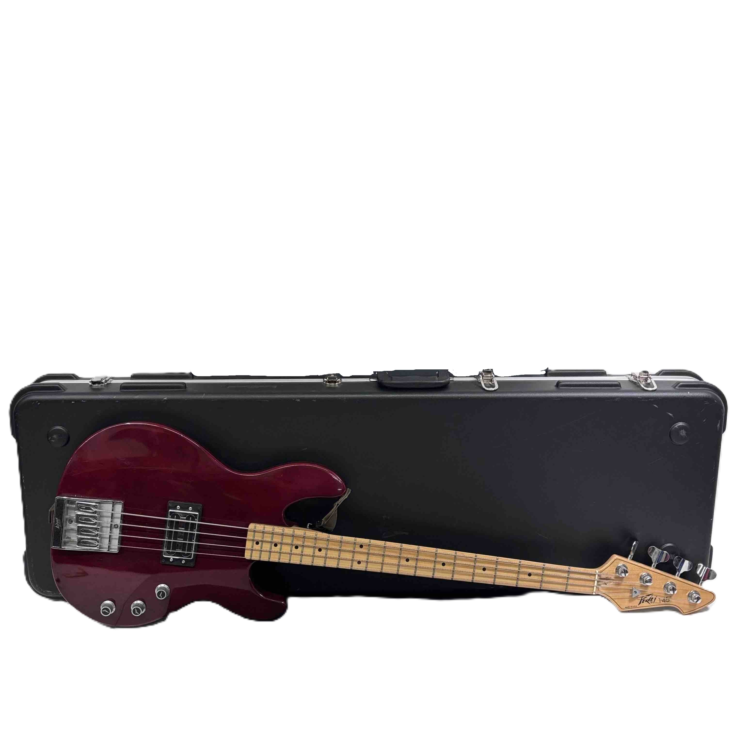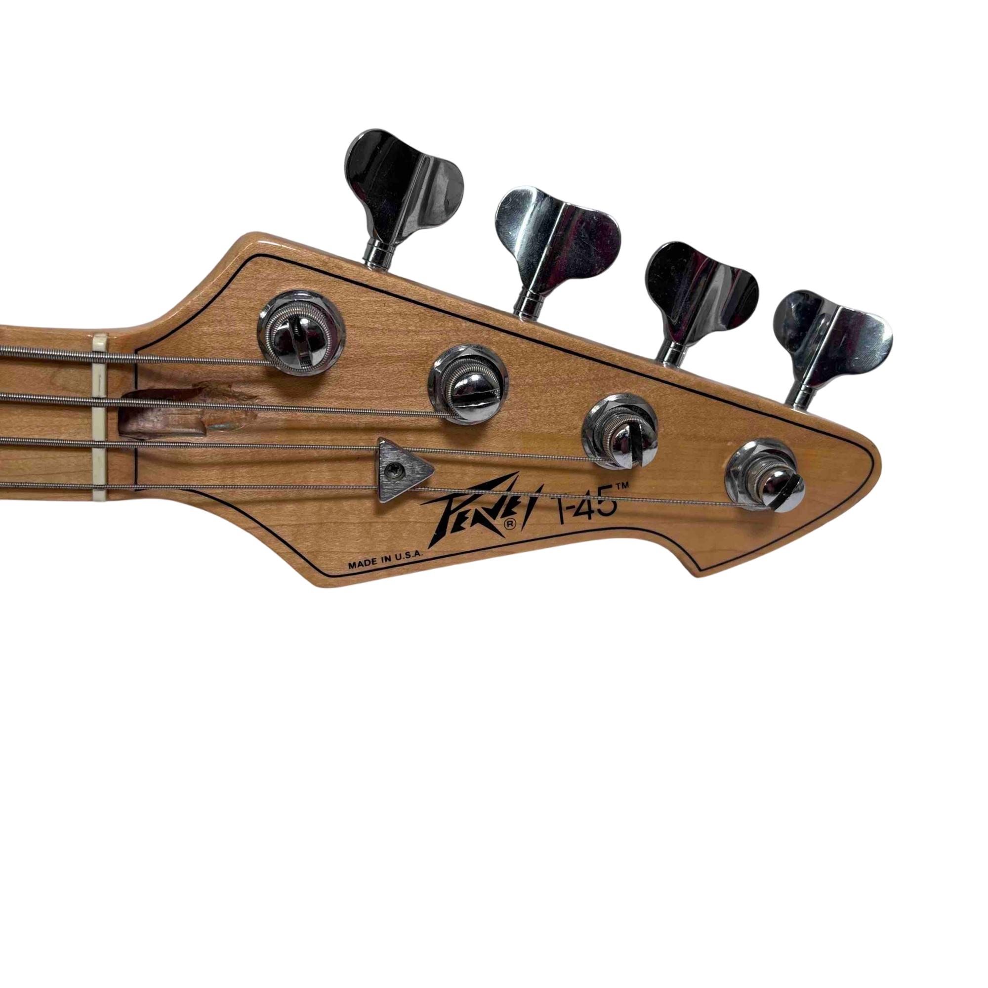 Peavey T-45 Electric Bass Guitar with Hard Case - Burgundy, Made in USA. This classic electric bass features a rich burgundy finish and is crafted in the USA, offering solid build quality and vintage tone. It comes with a protective hard case and showcases detailed craftsmanship including fine tuning hardware and a smooth playing neck ideal for professional musicians.