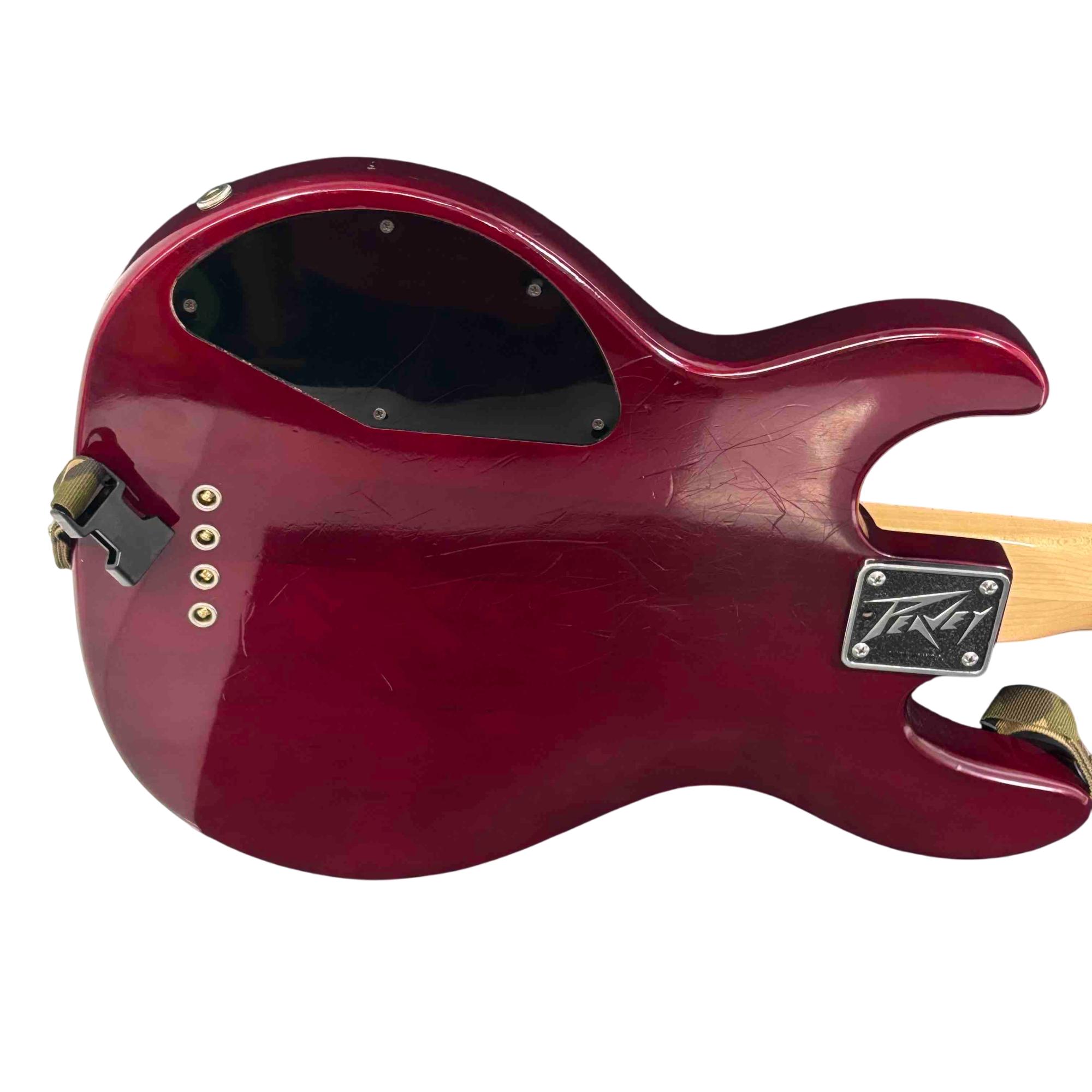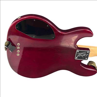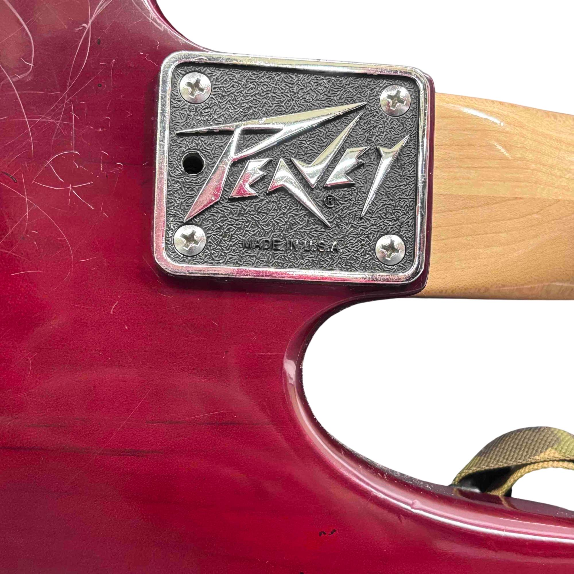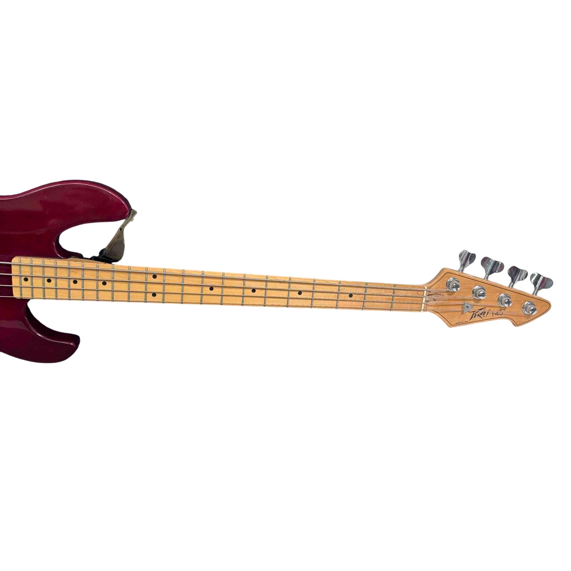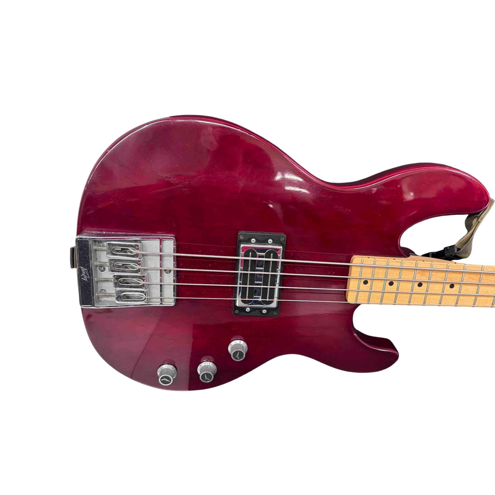 Peavey T-45 Electric Bass Guitar with Hard Case - Burgundy, Made in USA. This classic electric bass features a rich burgundy finish and is crafted in the USA, offering solid build quality and vintage tone. It comes with a protective hard case and showcases detailed craftsmanship including fine tuning hardware and a smooth playing neck ideal for professional musicians.