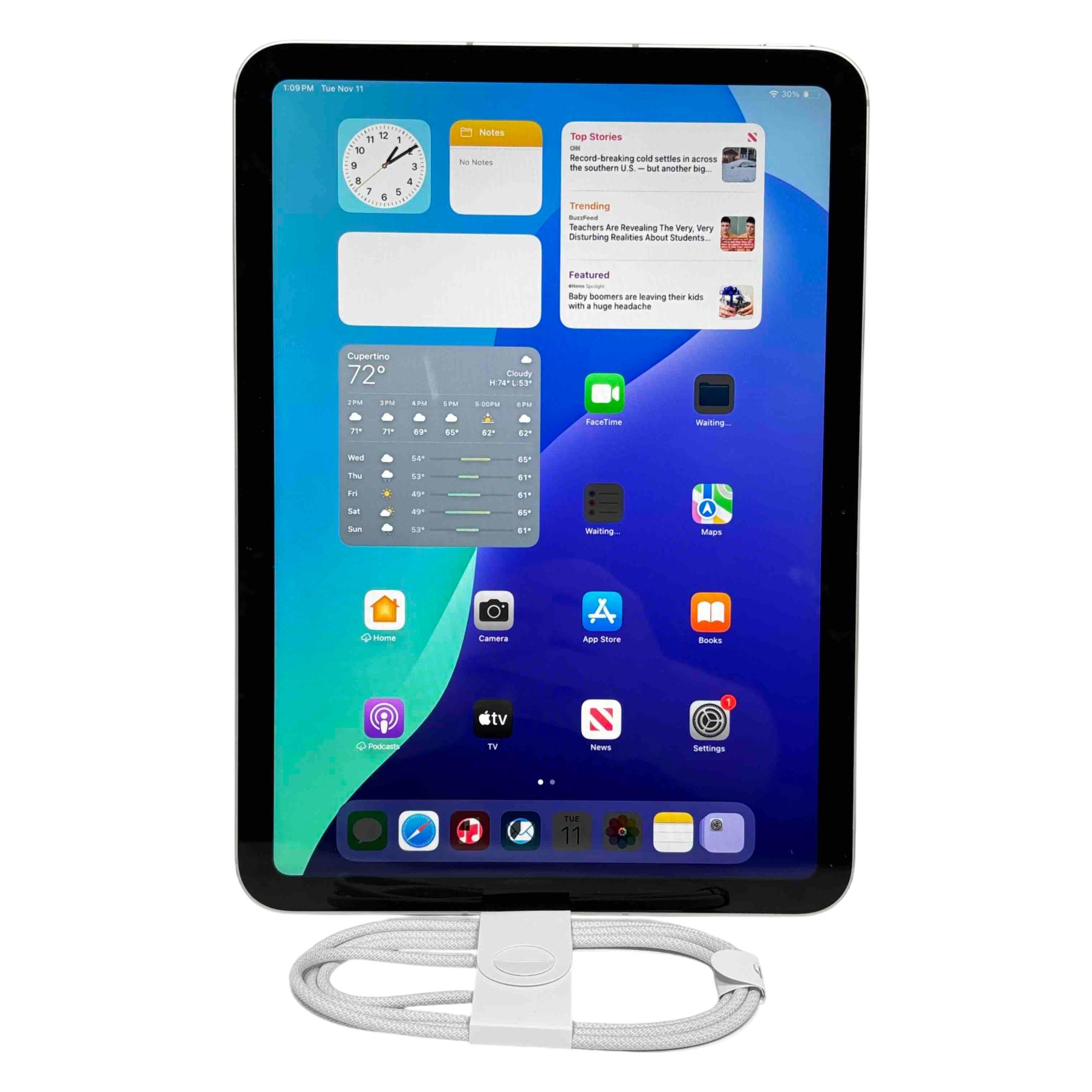 Features an 11" Liquid Retina touchscreen with a resolution of 2360 x 1640 and is powered by the A16 chip with a 5-core CPU, 4-core GPU, and 16-core Neural Engine. It includes 128GB of storage, a 12MP rear camera, and a 12MP landscape front-facing camera with Center Stage for improved video calls. Connectivity options include Wi-Fi 6, 5G, Bluetooth 5.3, and a USB-C 2.0 port that supports data transfer, DisplayPort, and charging. The system supports iPadOS and works with accessories like the Apple Pencil (USB-C) and Magic Keyboard Folio for expanded input and productivity capabilities. Audio is supported through built-in microphones and landscape stereo speakers.