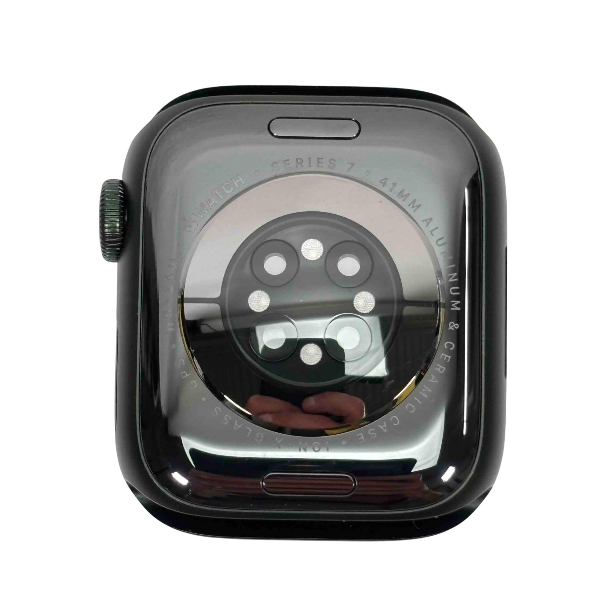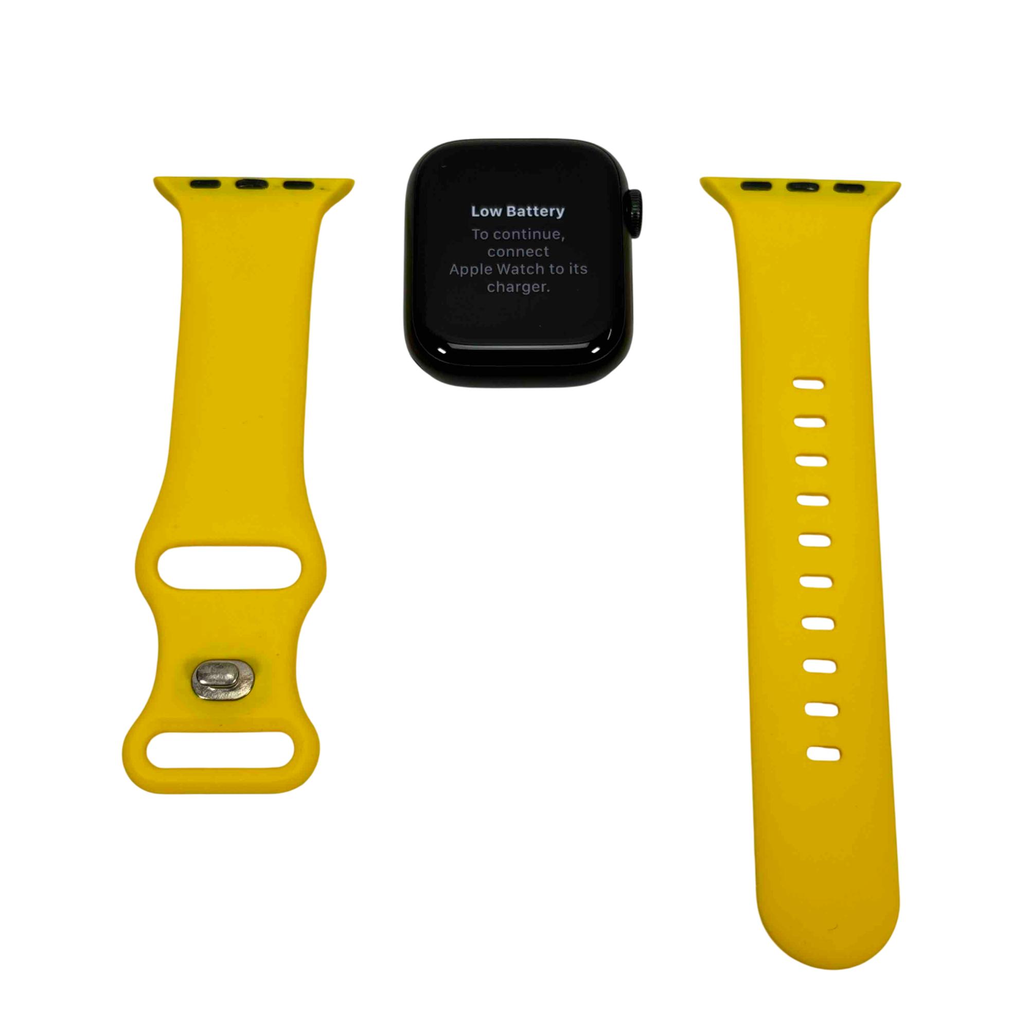 Apple Watch Series 7 41mm (A2473) Aluminum & Ceramic features a sleek black case paired with a vibrant yellow silicone sport band designed for comfort and durability. This GPS-enabled smartwatch offers advanced health and connectivity features, housed in a scratch-resistant glass display perfect for everyday use. Optimized for fitness tracking and seamless smartphone integration, it delivers reliable performance in a stylish, lightweight design.