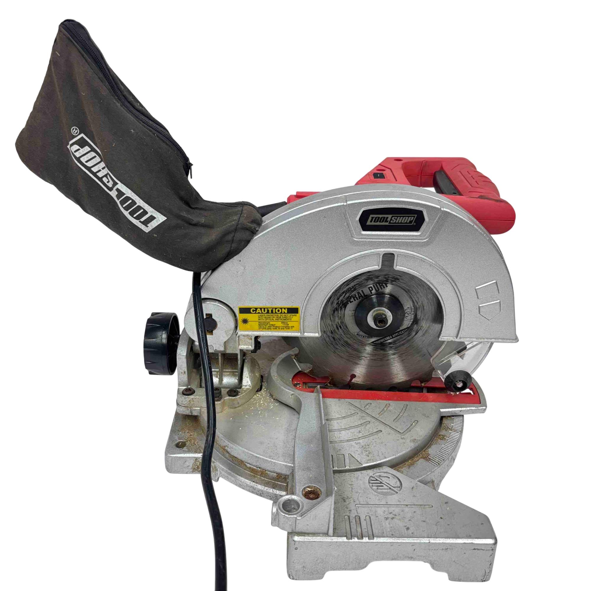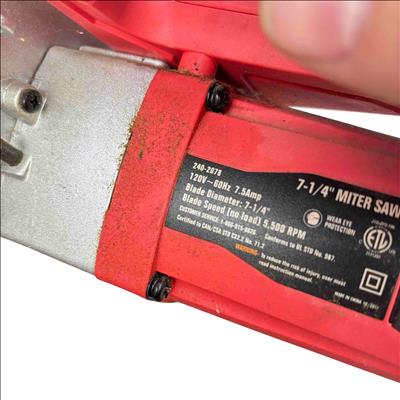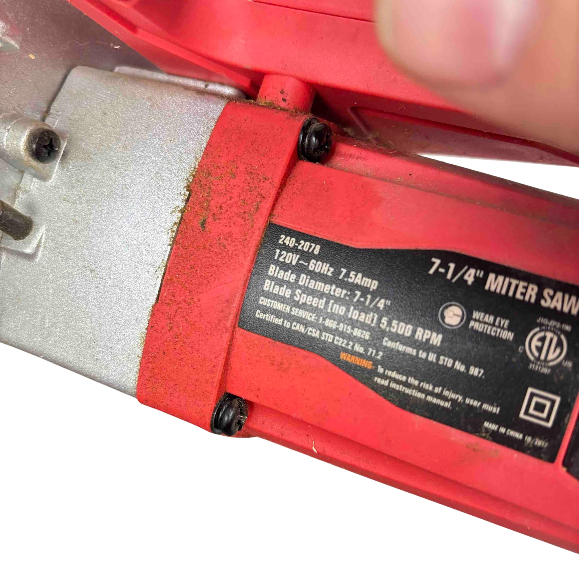 The Tool Shop 7-1/4" Miter Saw operates on 120V at 7.5 amps and features a 7-1/4 inch blade diameter capable of reaching 5,500 RPM no load speed. Designed with safety in mind, it displays caution warnings and conforms to UL and CSA safety standards. This powerful saw is ideal for precise crosscuts and angled cuts in various woodworking and construction projects.