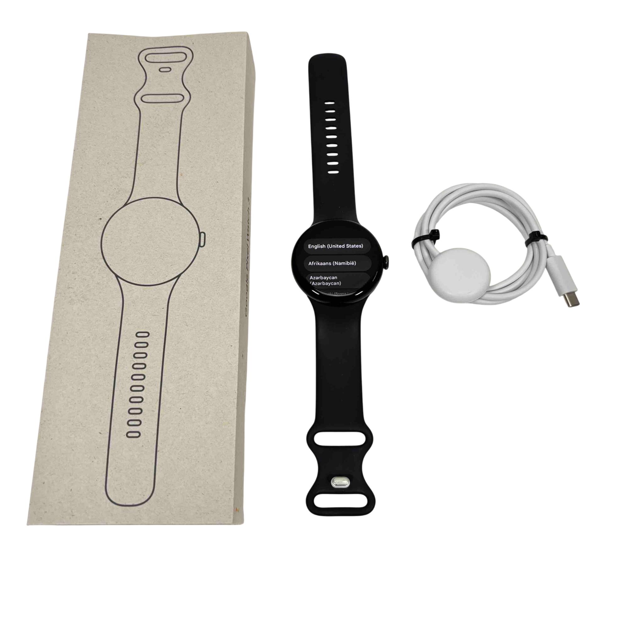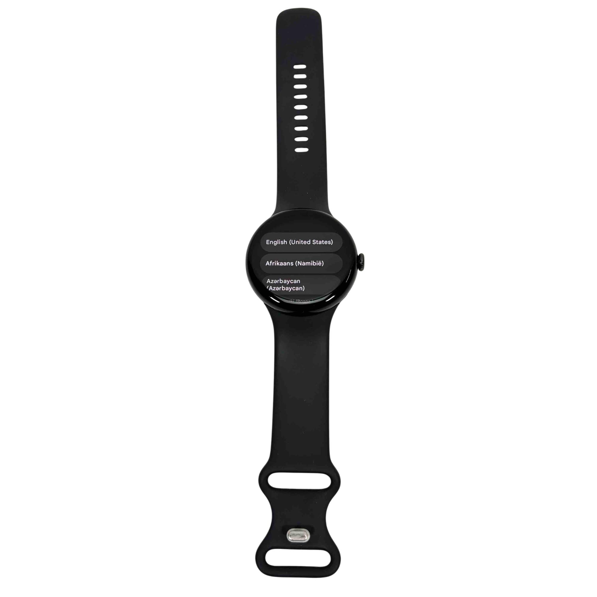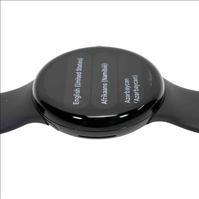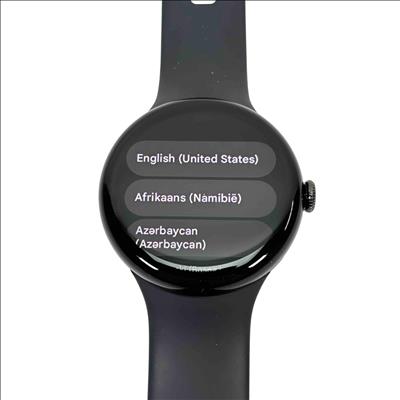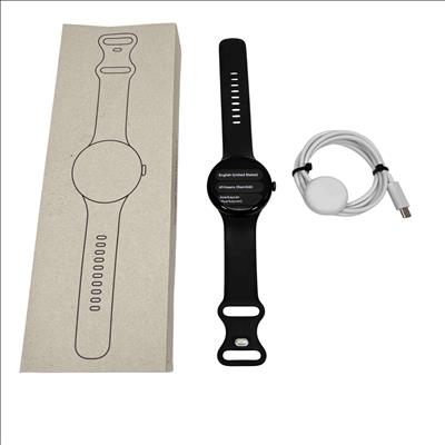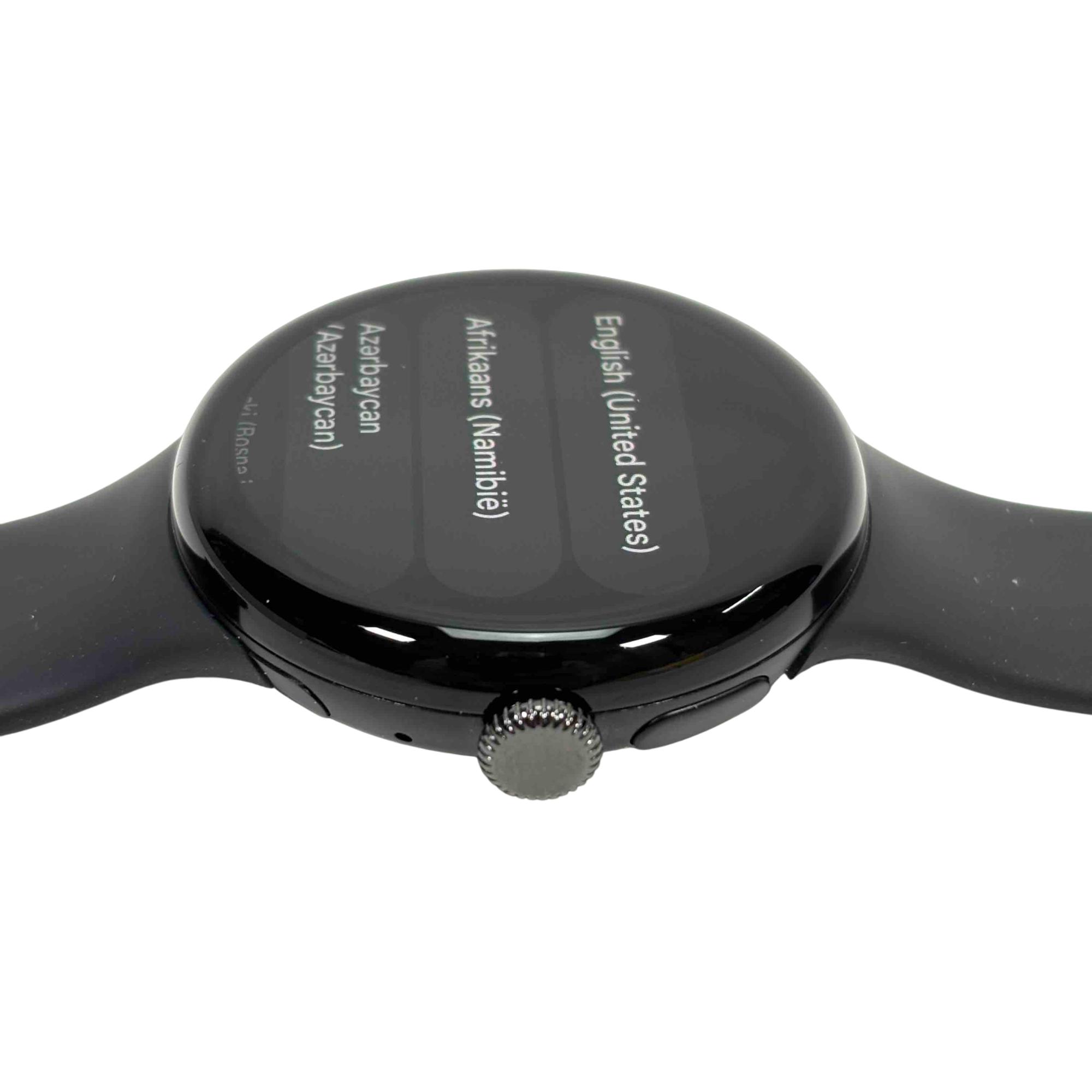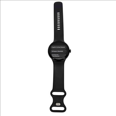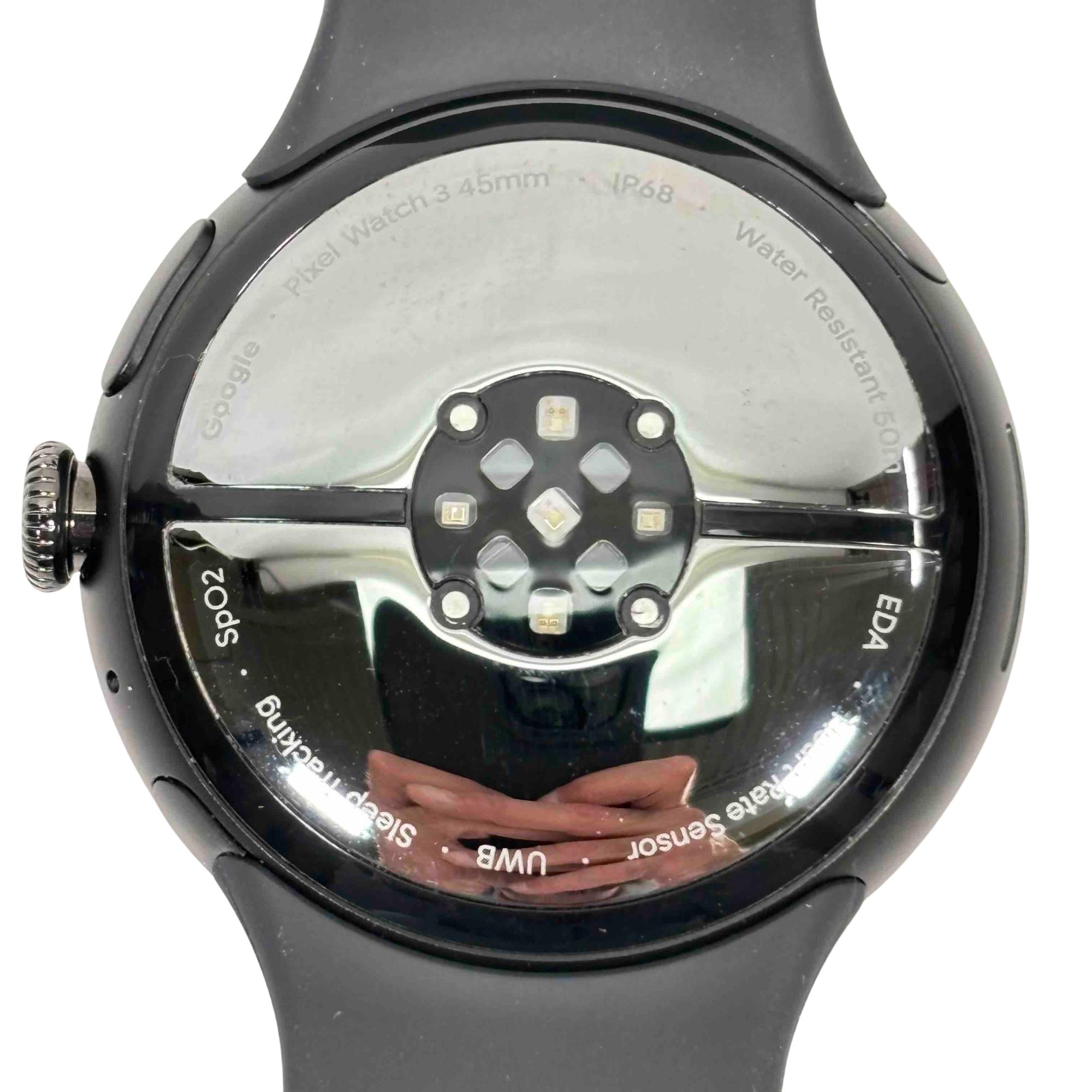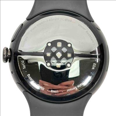 Google Pixel Watch 3 WiFi 45mm Obsidian Black features a sleek, round black design with a clear white text display that enhances readability. This smartwatch offers a high-resolution circular dial and a modern aesthetic, optimized for seamless integration with Android devices and advanced fitness tracking capabilities.