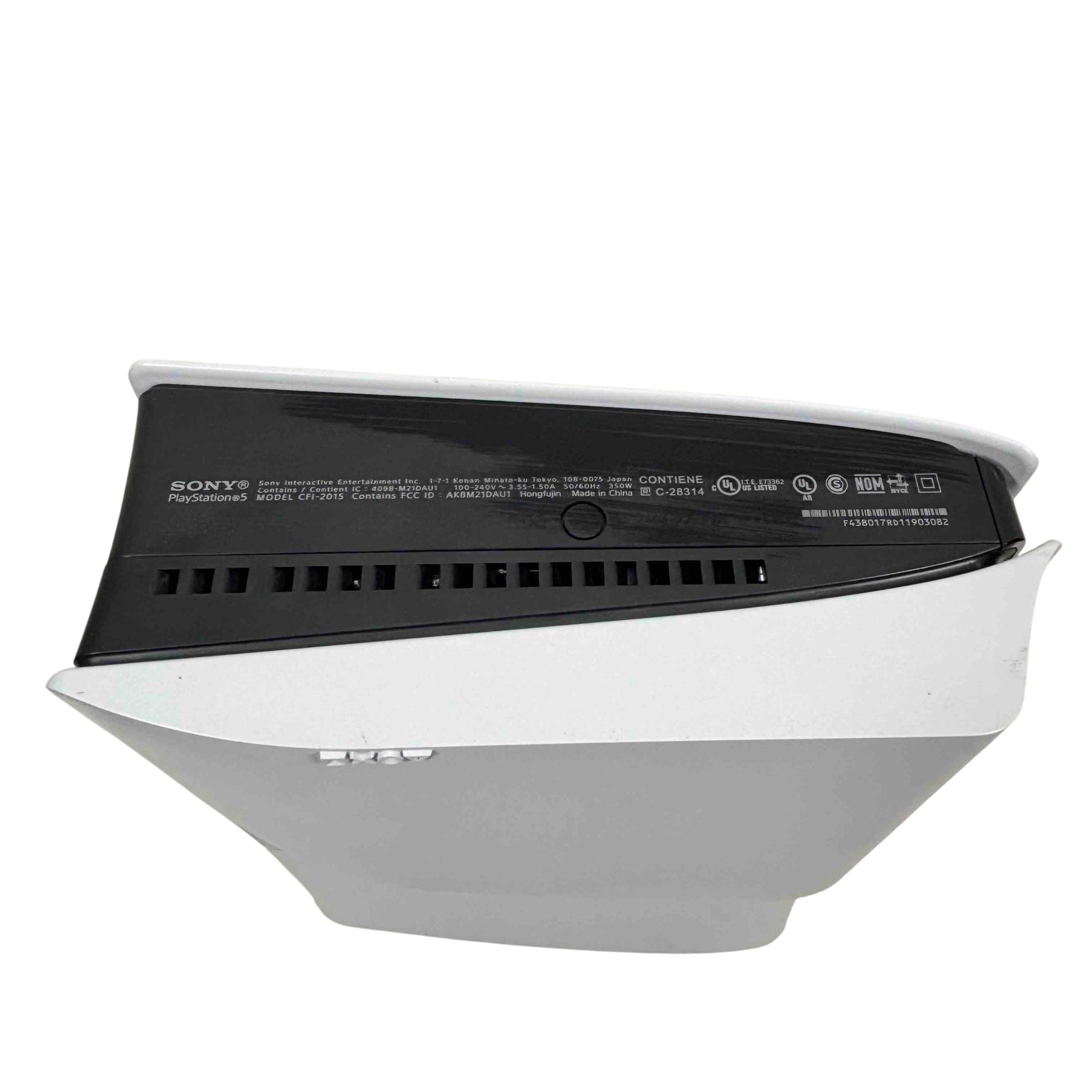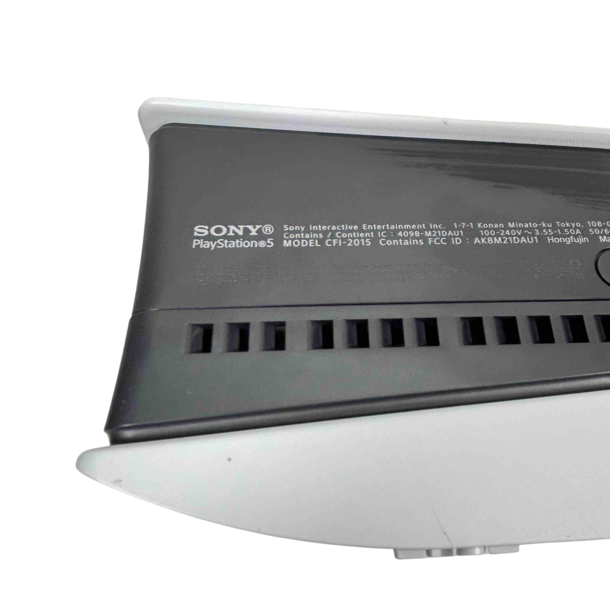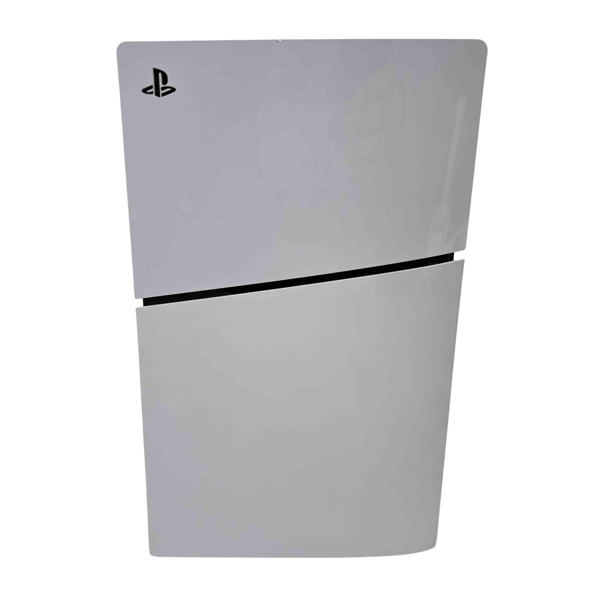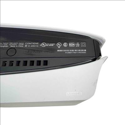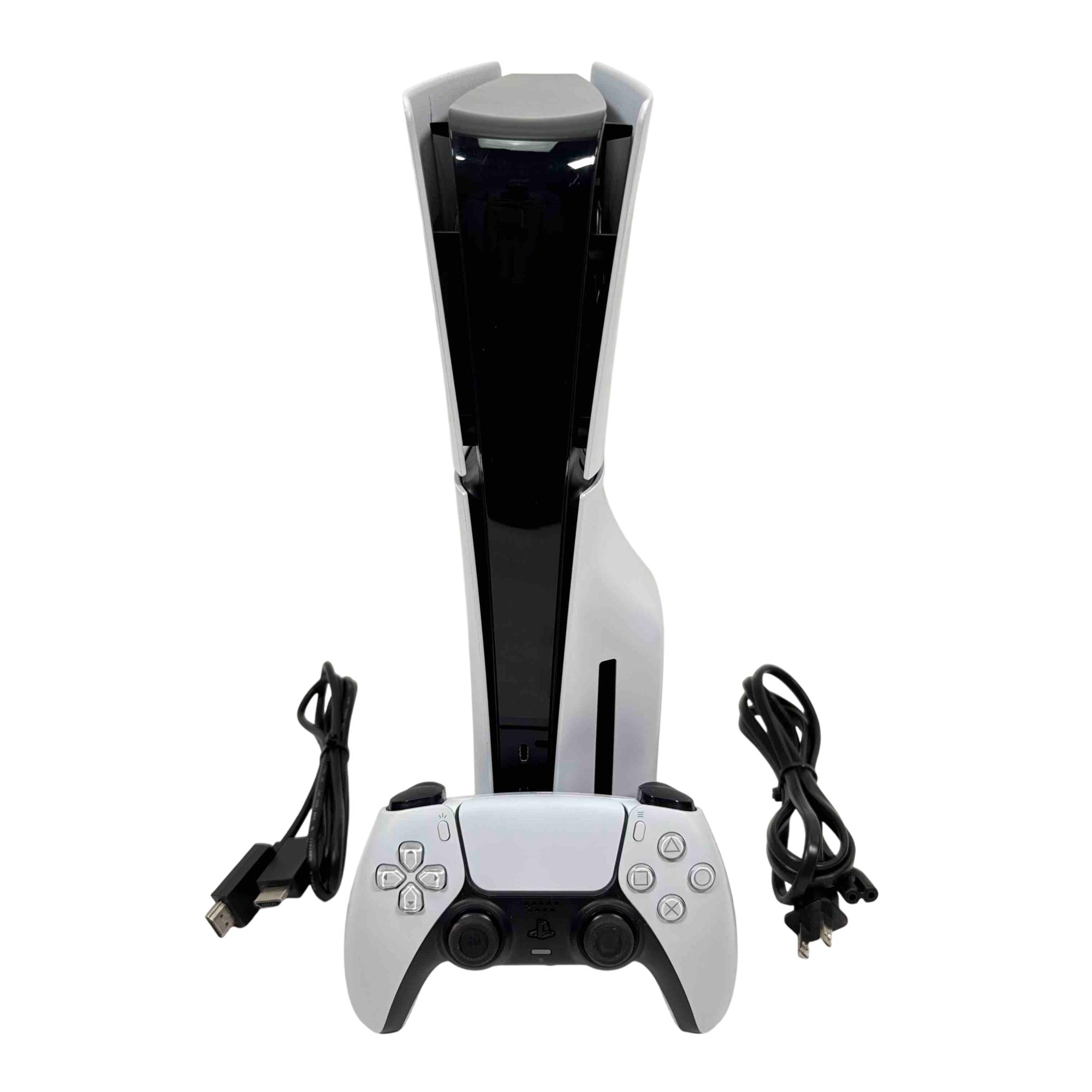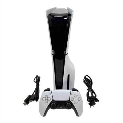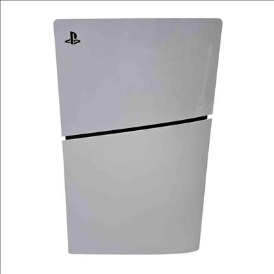 The Sony PlayStation 5 Slim Disc Edition 1TB (Model CFI-2015A) features a sleek white and black design with a compact rectangular form and a distinctive black strip. This gaming console delivers high-performance gameplay with a 1TB storage capacity and supports physical disc media. It is engineered to provide immersive entertainment with advanced graphics and responsive controls.