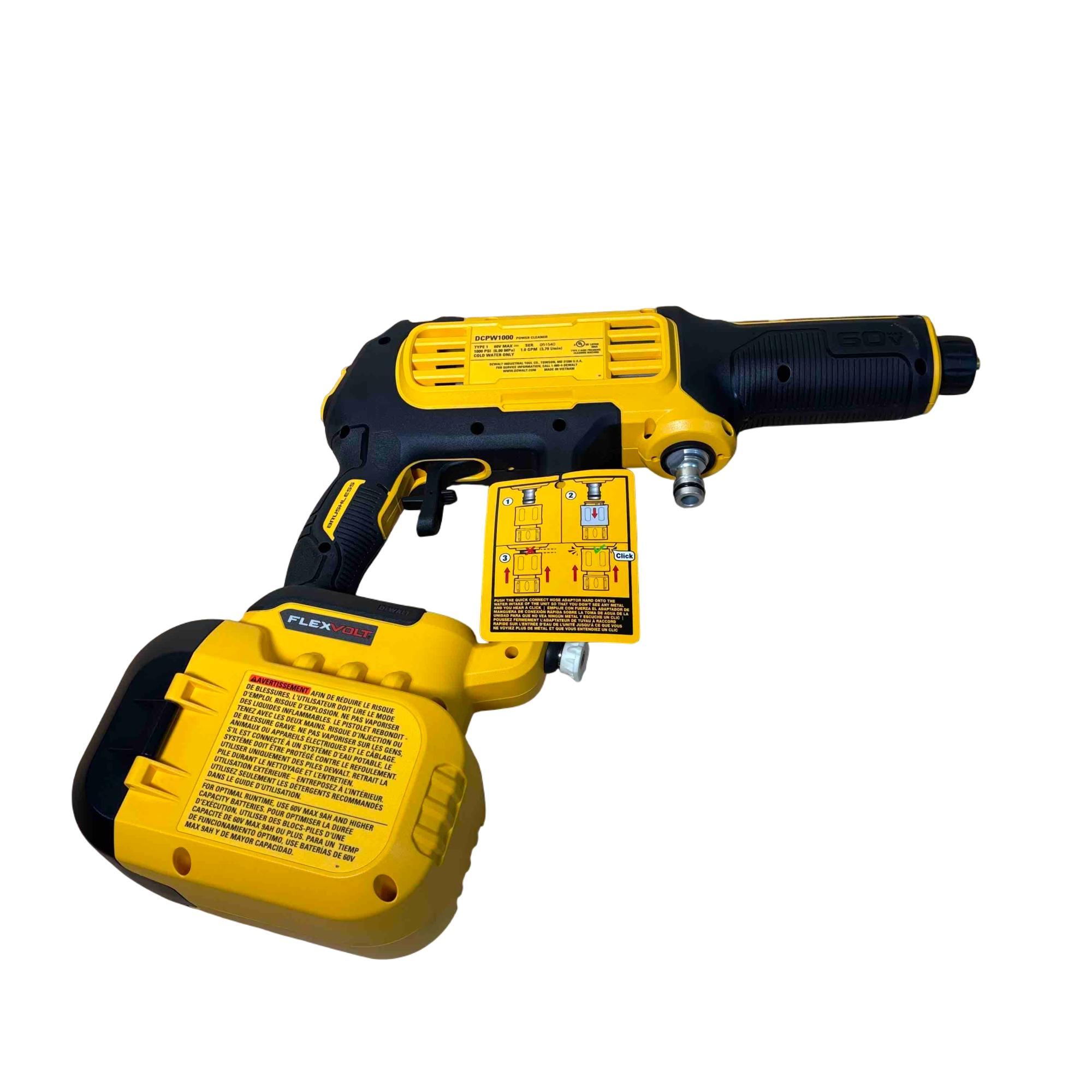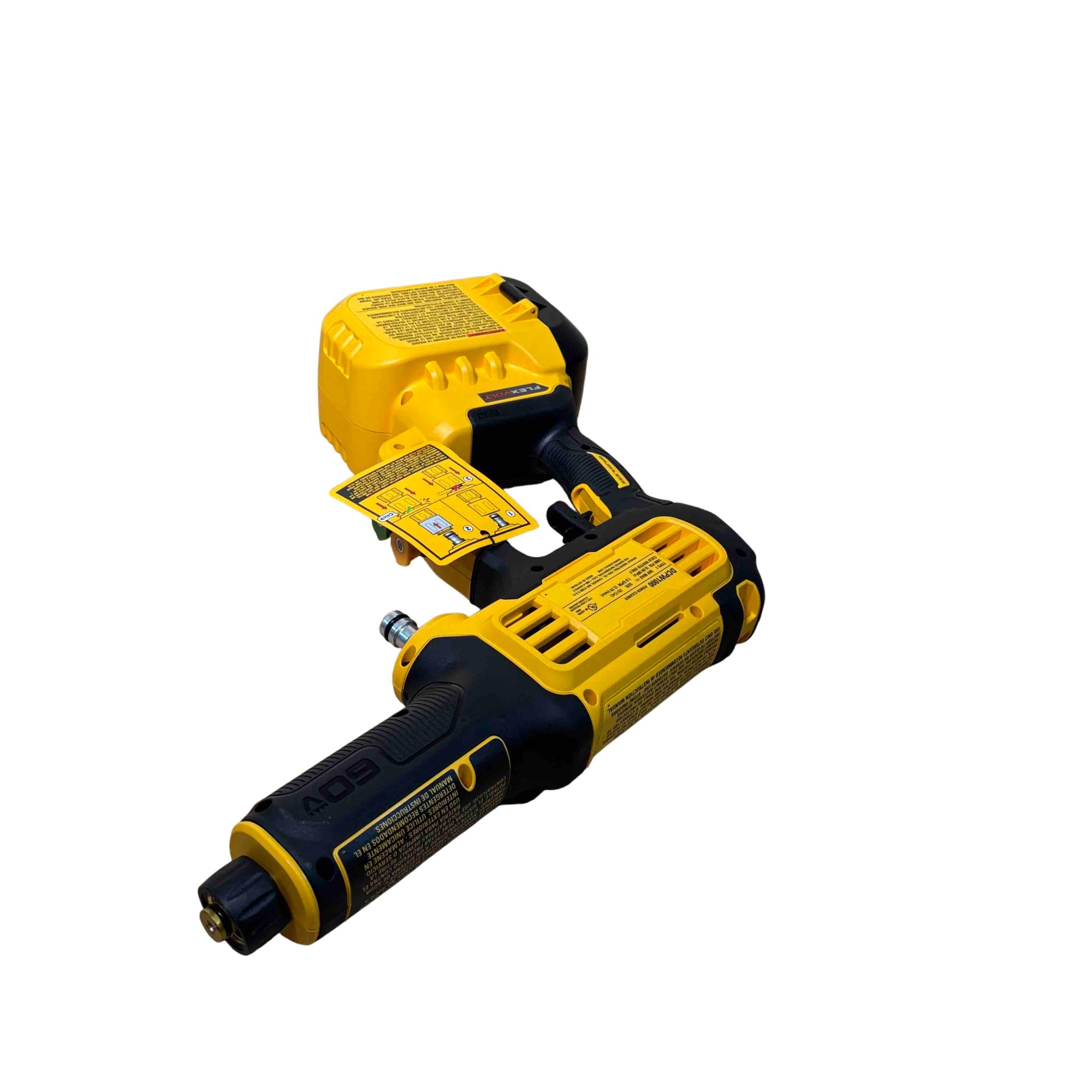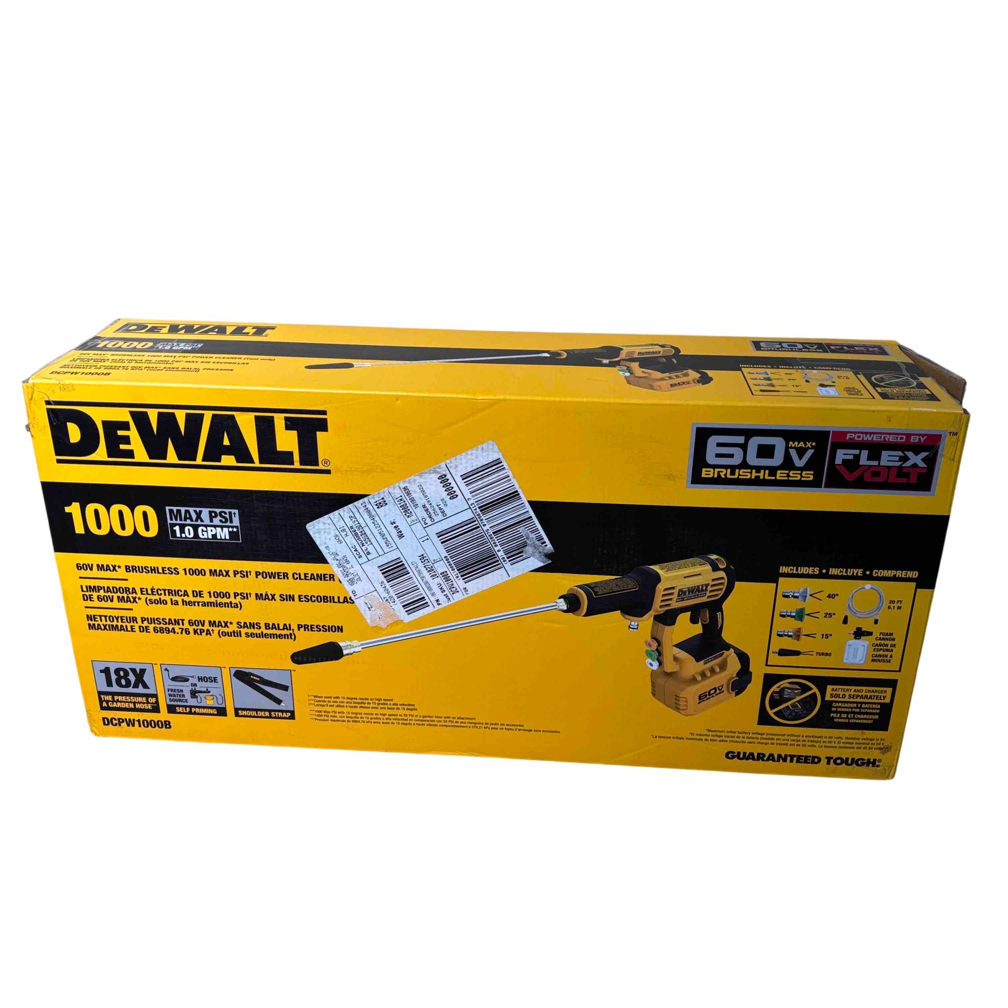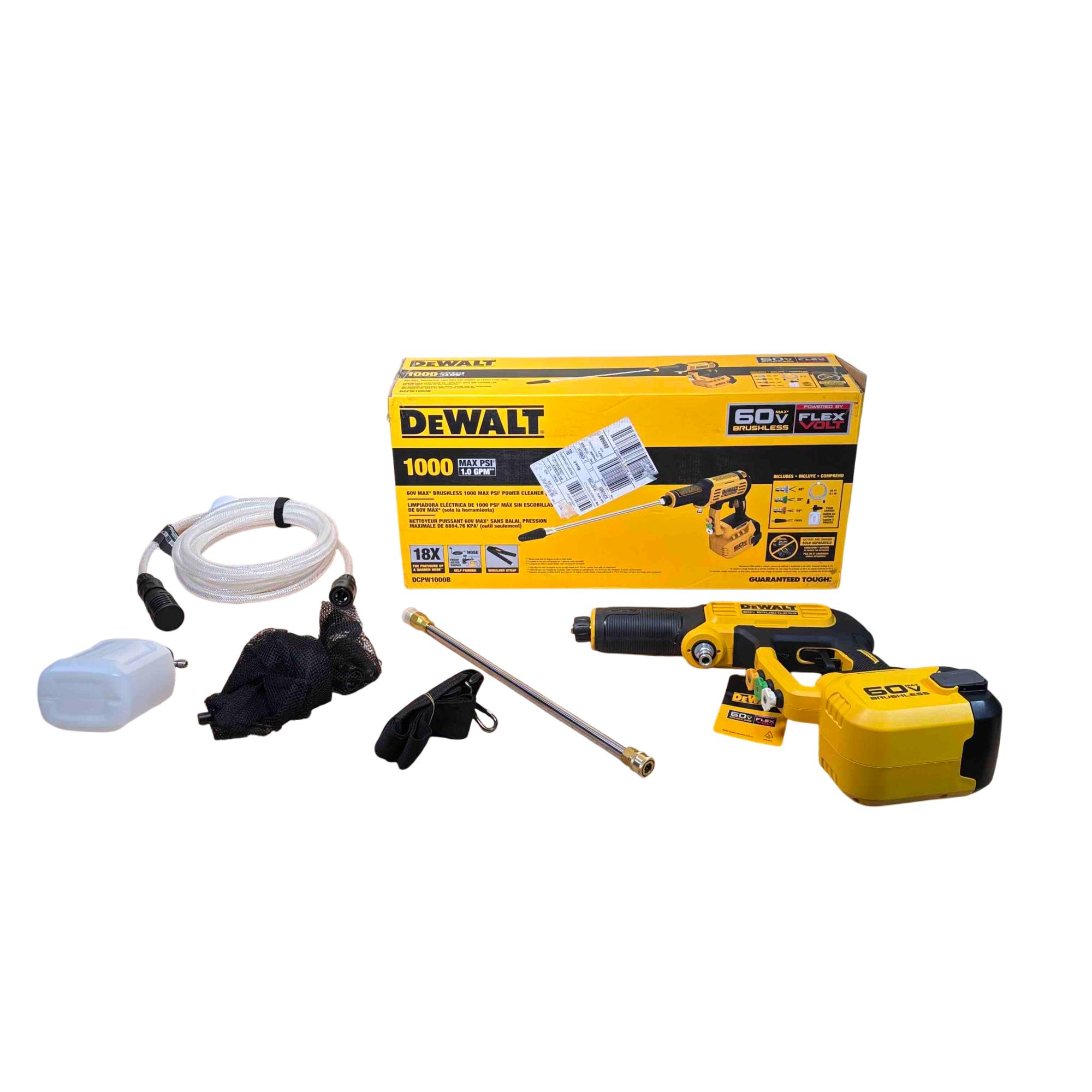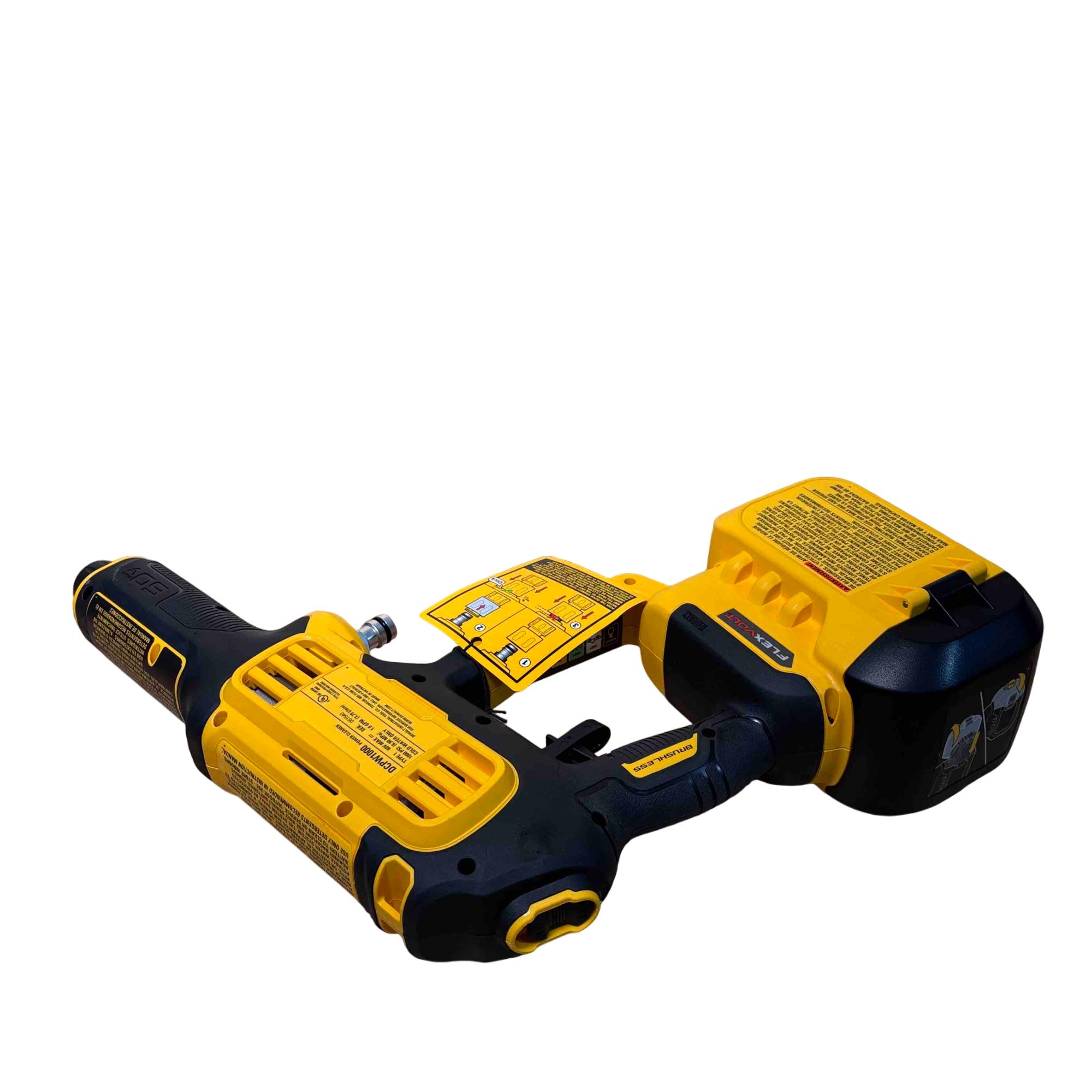 The DEWALT DCPW1000B FLEXVOLT 60V MAX 1000 PSI 1.0 GPM brushless power cleaner delivers powerful cold water cleaning performance with a maximum pressure of 1000 PSI and a flow rate of 1.0 gallons per minute. Featuring brushless motor technology and a FLEXVOLT battery platform, this cordless pressure cleaner offers enhanced efficiency and durability for tough cleaning tasks in various outdoor settings.