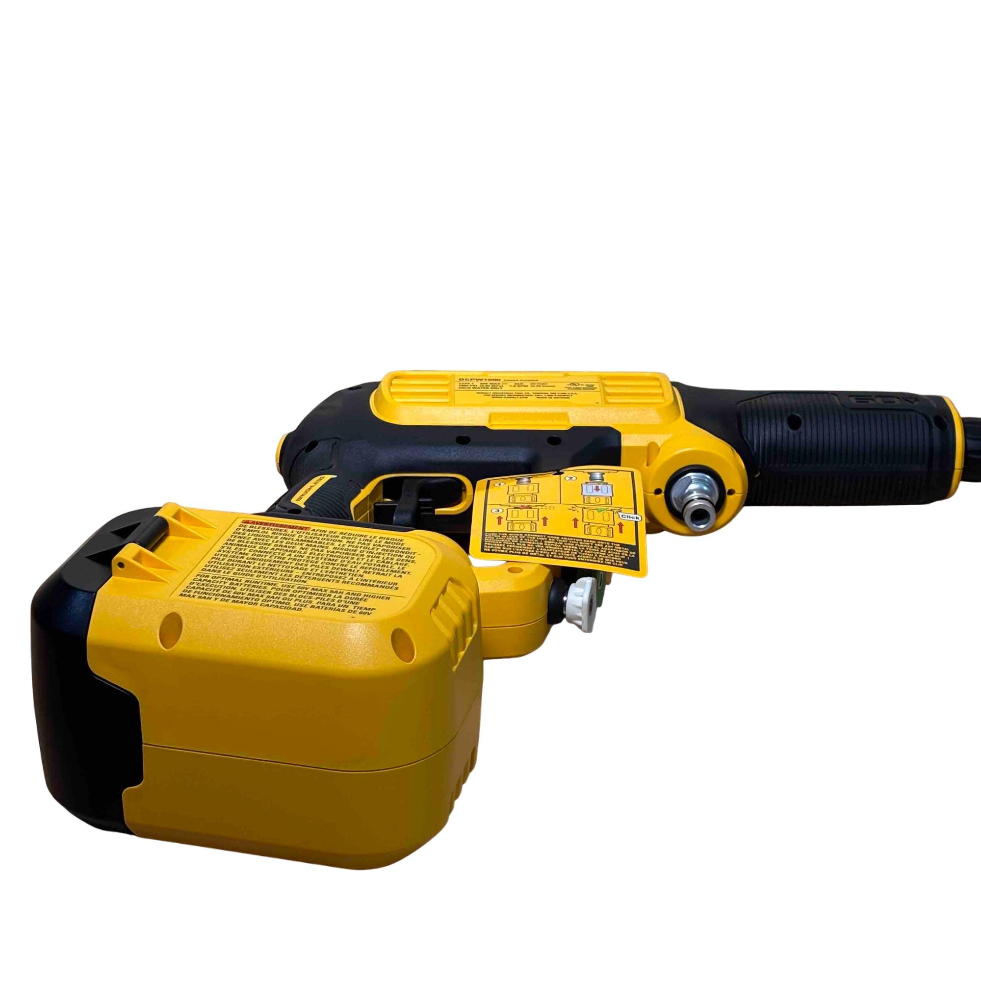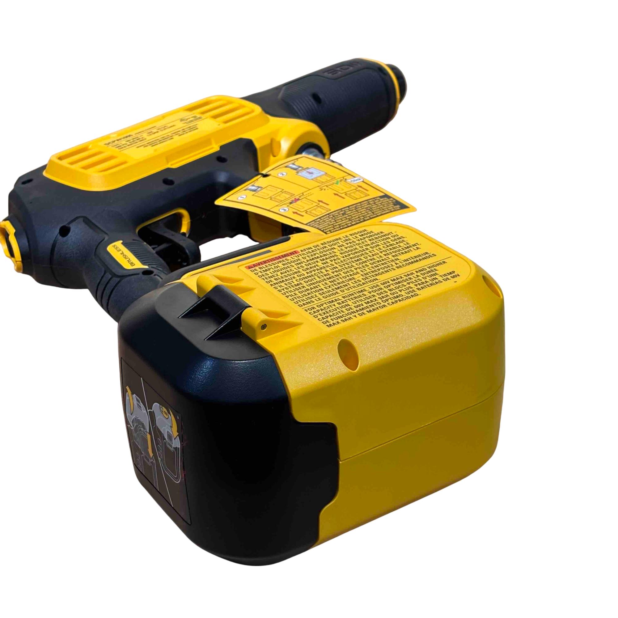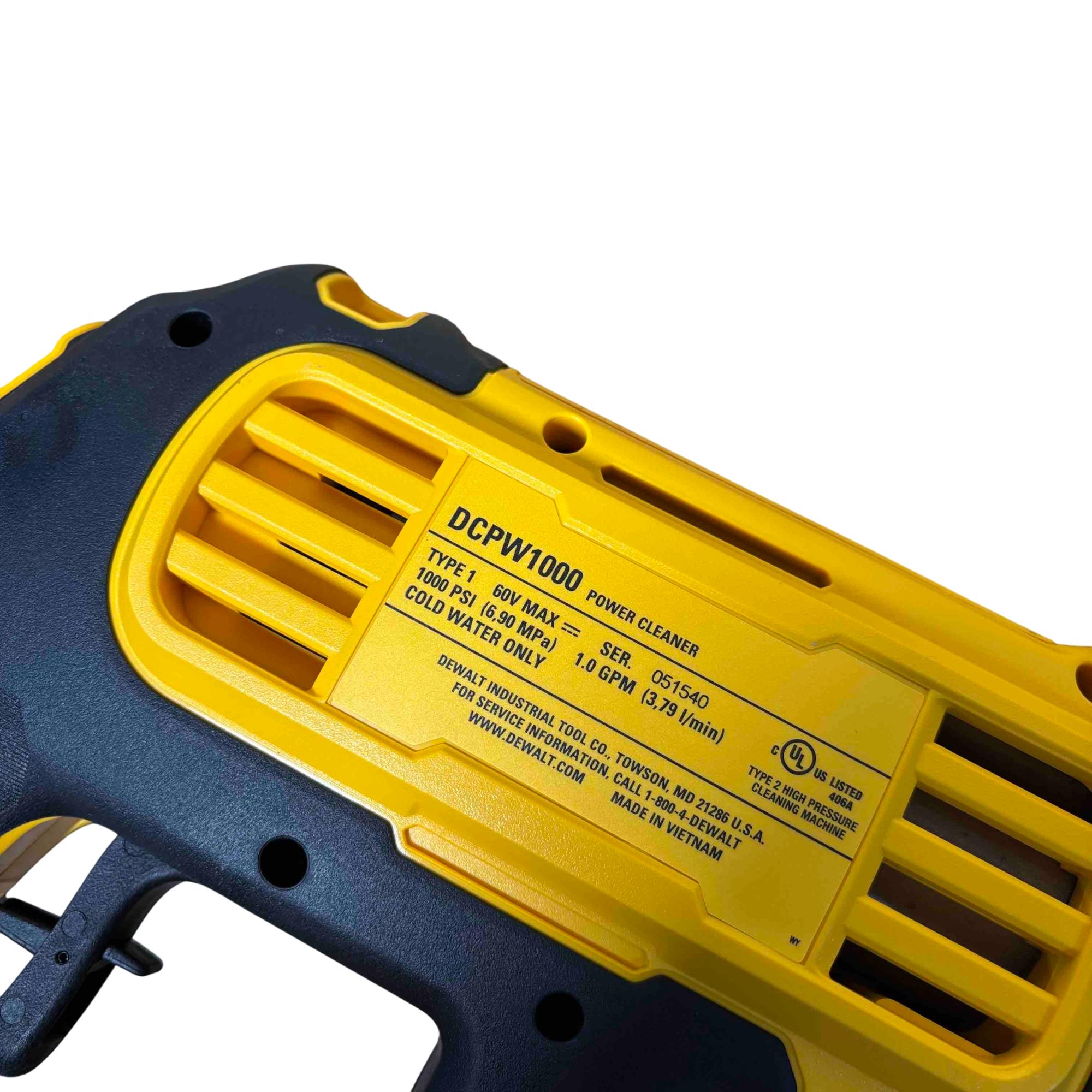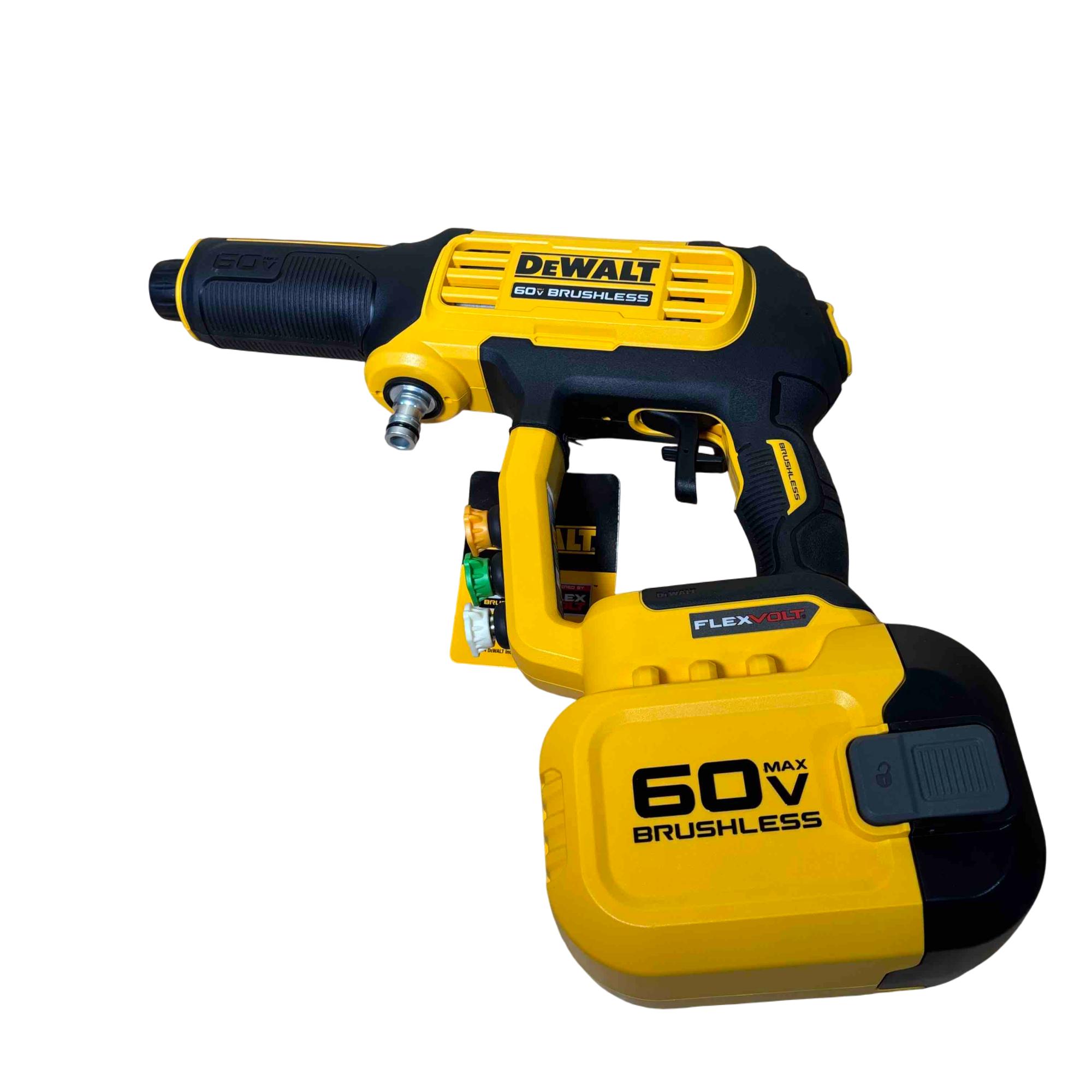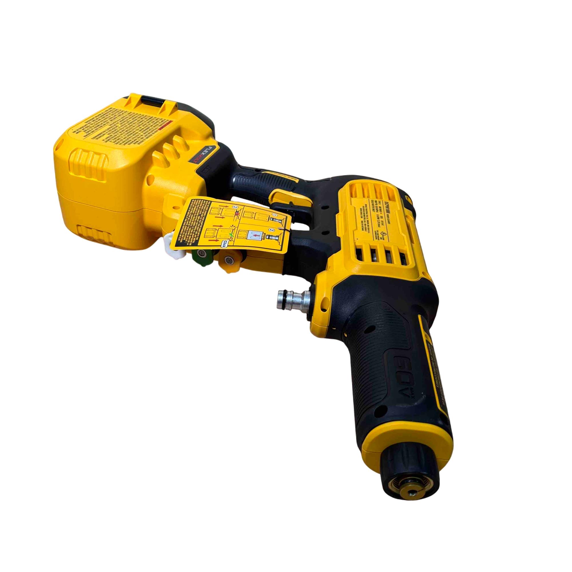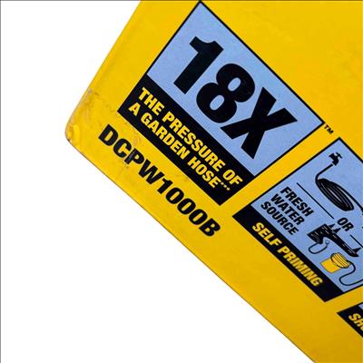 The DEWALT DCPW1000B FLEXVOLT 60V MAX 1000 PSI 1.0 GPM brushless power cleaner delivers powerful cold water cleaning performance with a maximum pressure of 1000 PSI and a flow rate of 1.0 gallons per minute. Featuring brushless motor technology and a FLEXVOLT battery platform, this cordless pressure cleaner offers enhanced efficiency and durability for tough cleaning tasks in various outdoor settings.