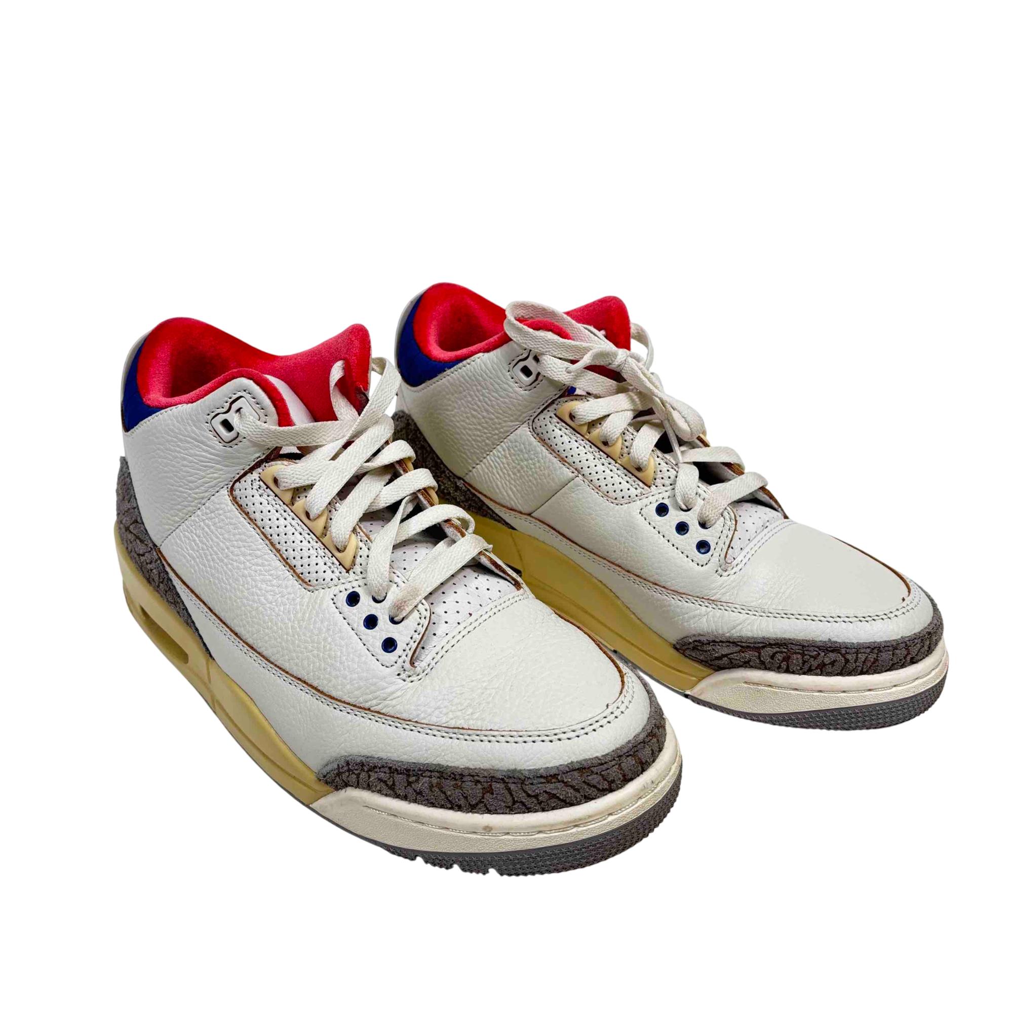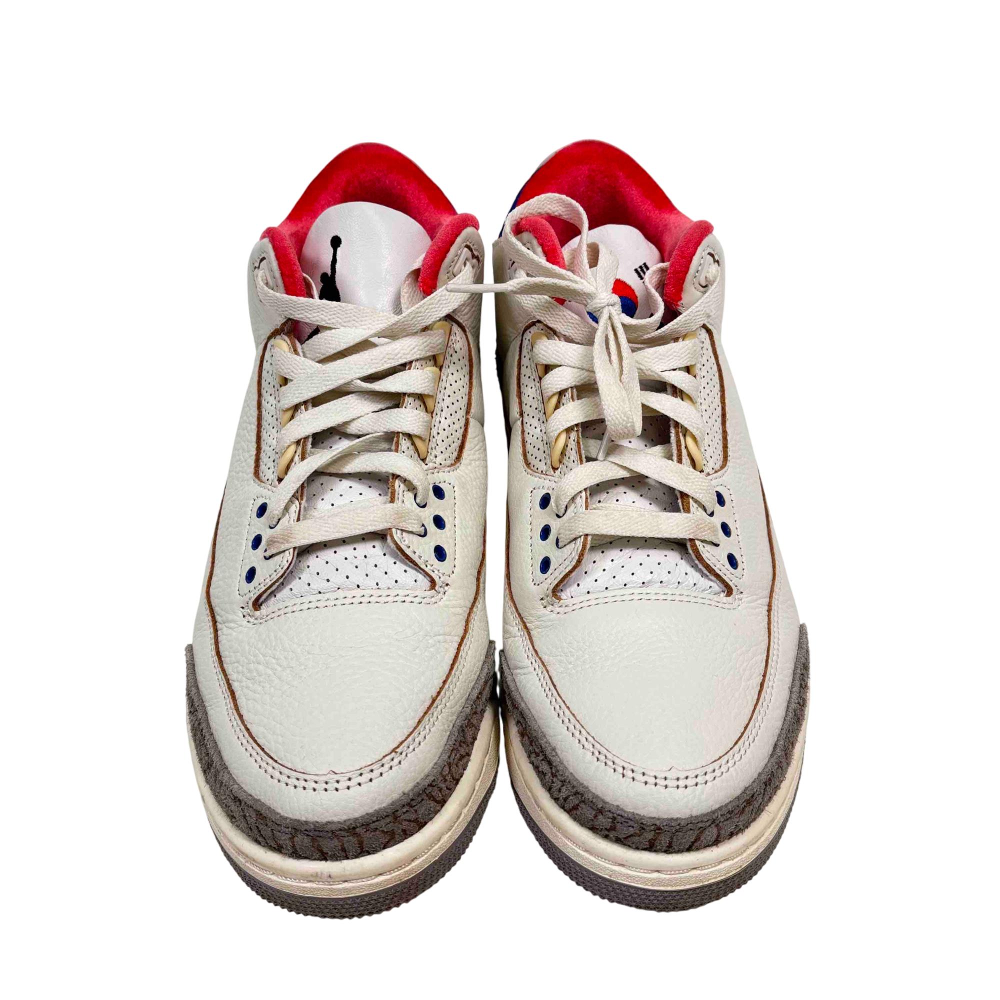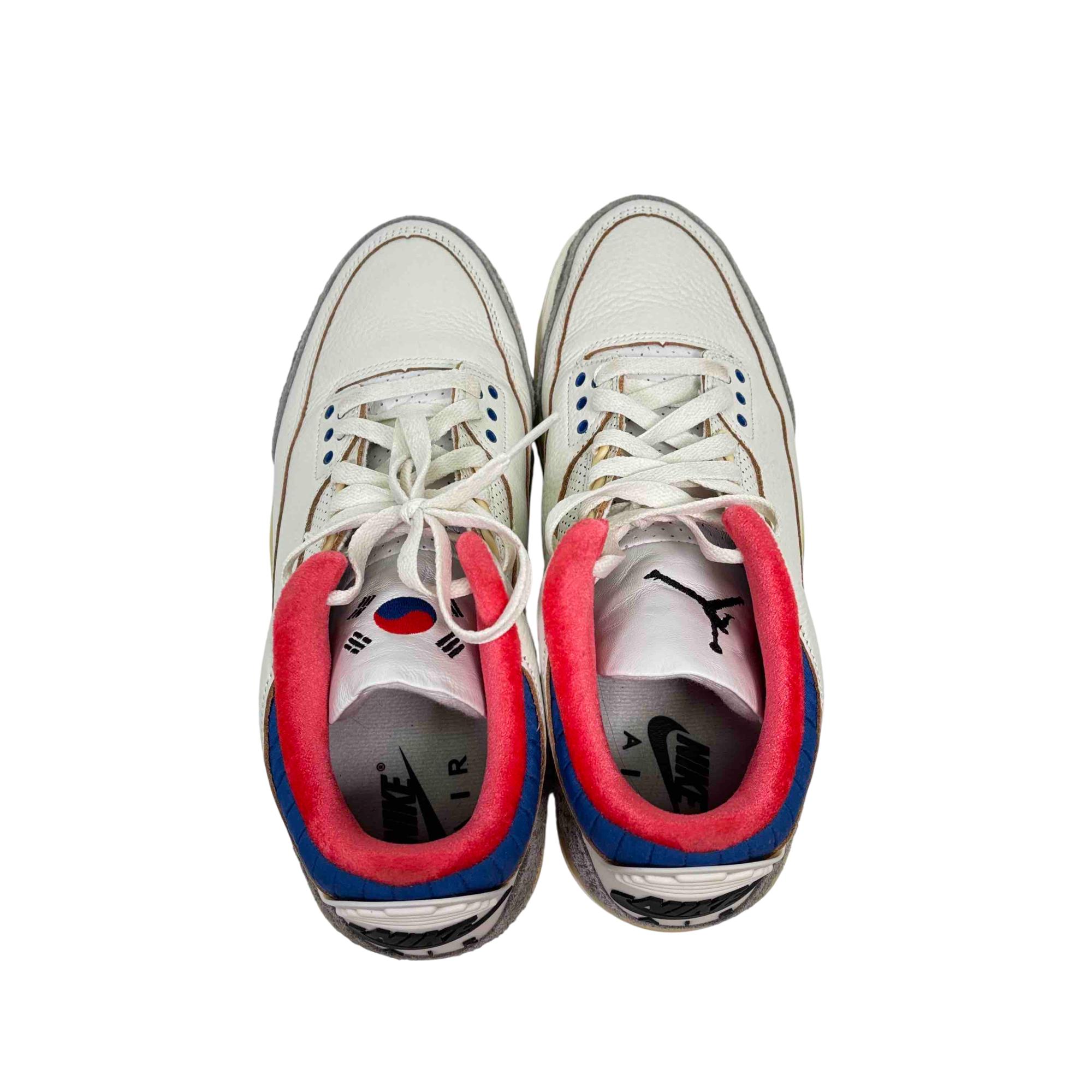 Nike Air Jordan 3 Retro Seoul 2.0 IB1482-100 features a classic white leather upper with subtle red and blue accents, creating a clean and stylish look. This iconic basketball sneaker combines premium materials with a modern design, offering both comfort and durability for athletic and casual wear.