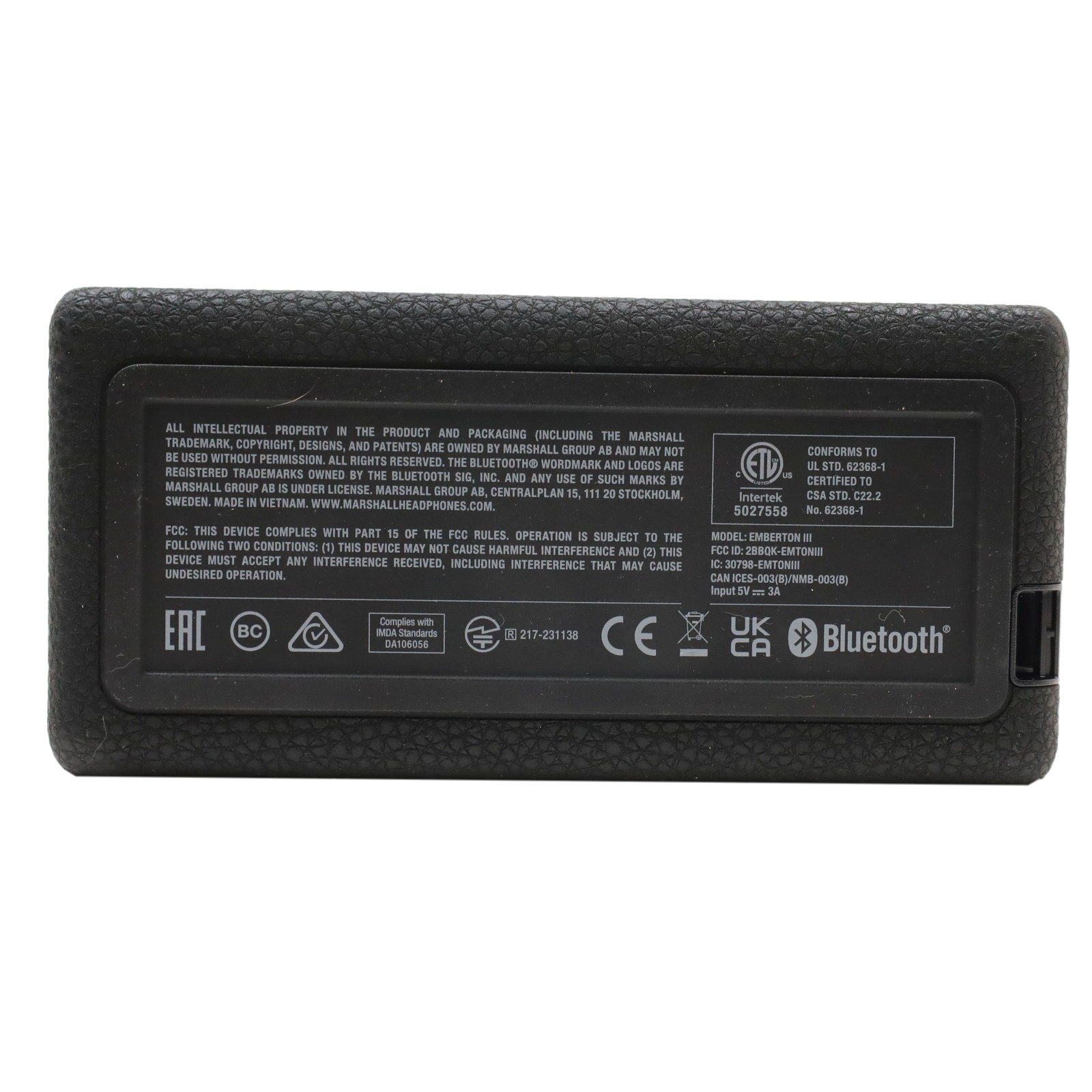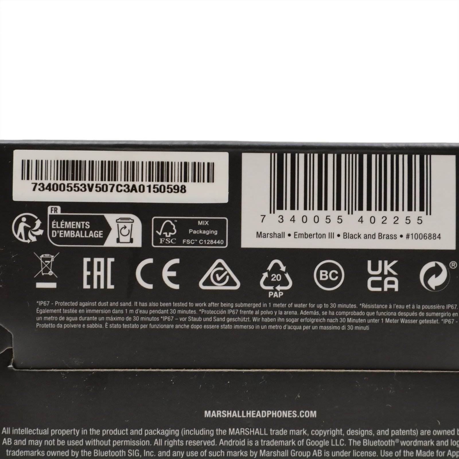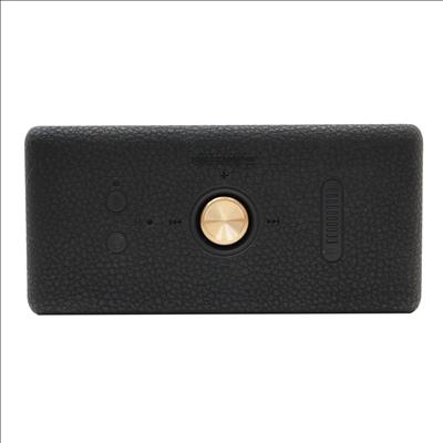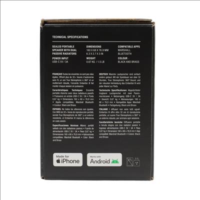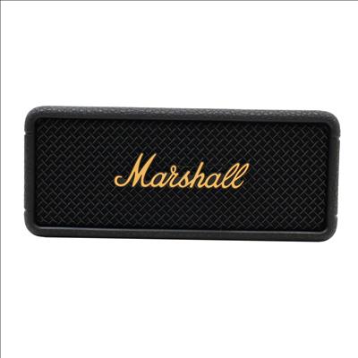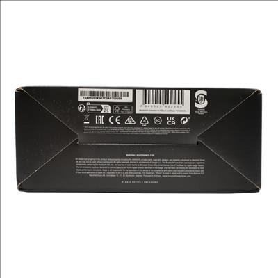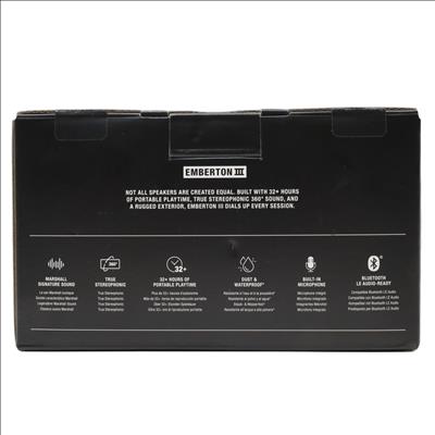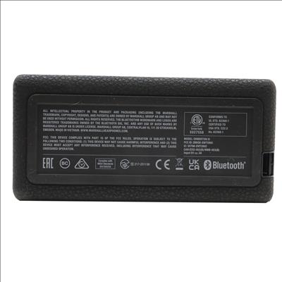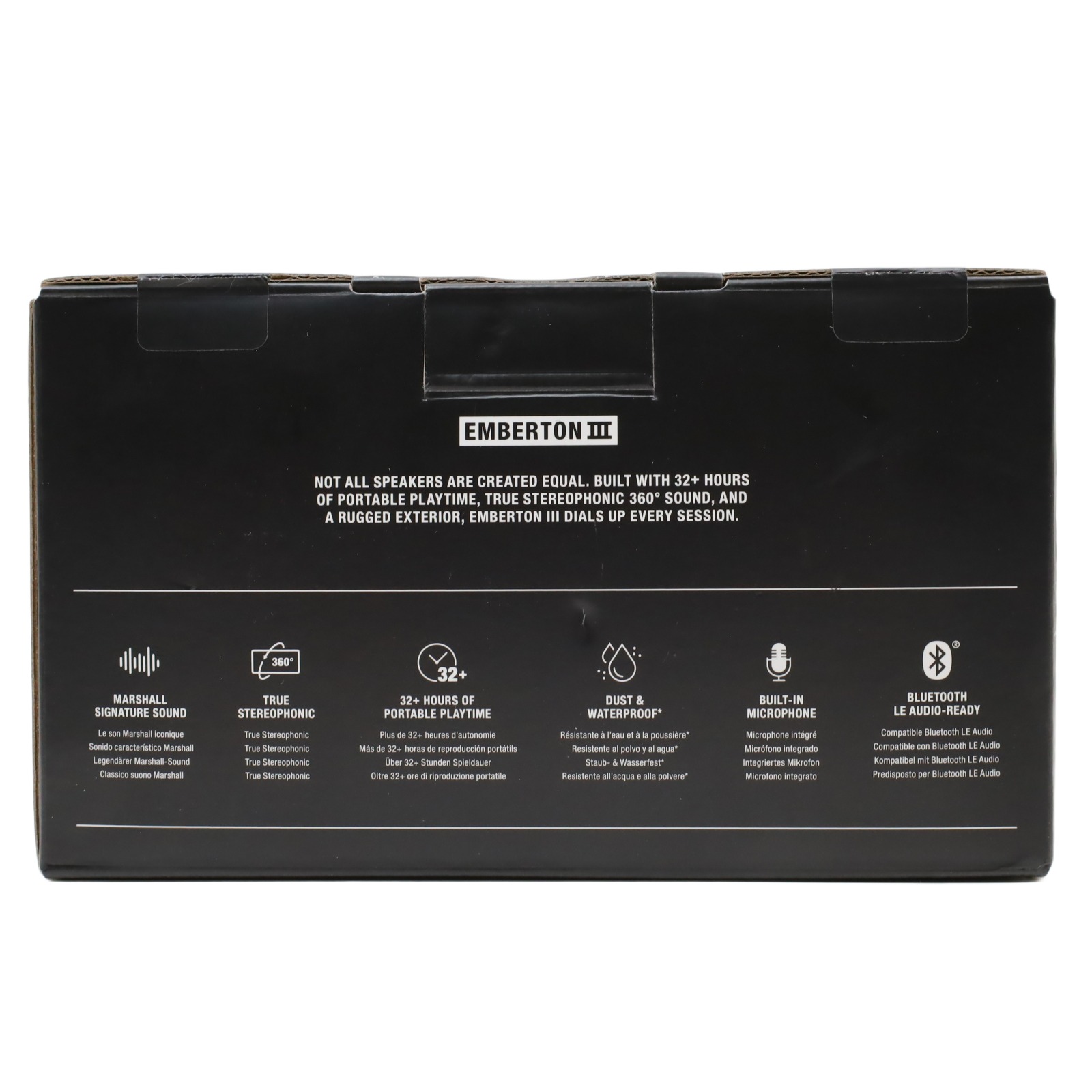 Features a rugged silicone exterior, metal grille, and an IP67 dust and water resistance rating, making it suitable for outdoor use. It delivers 360° True Stereophonic sound designed to provide balanced audio from any position, with Dynamic Loudness adjusting frequencies as the volume changes. The unit includes a built-in microphone for hands-free calling and supports Bluetooth LE Audio-ready functionality for future audio sharing features. Its design reflects classic Marshall styling with a textured finish and front grill while focusing on straightforward operation for everyday use.