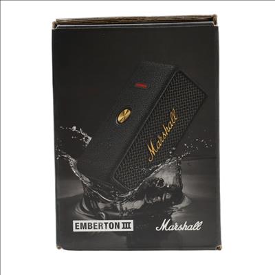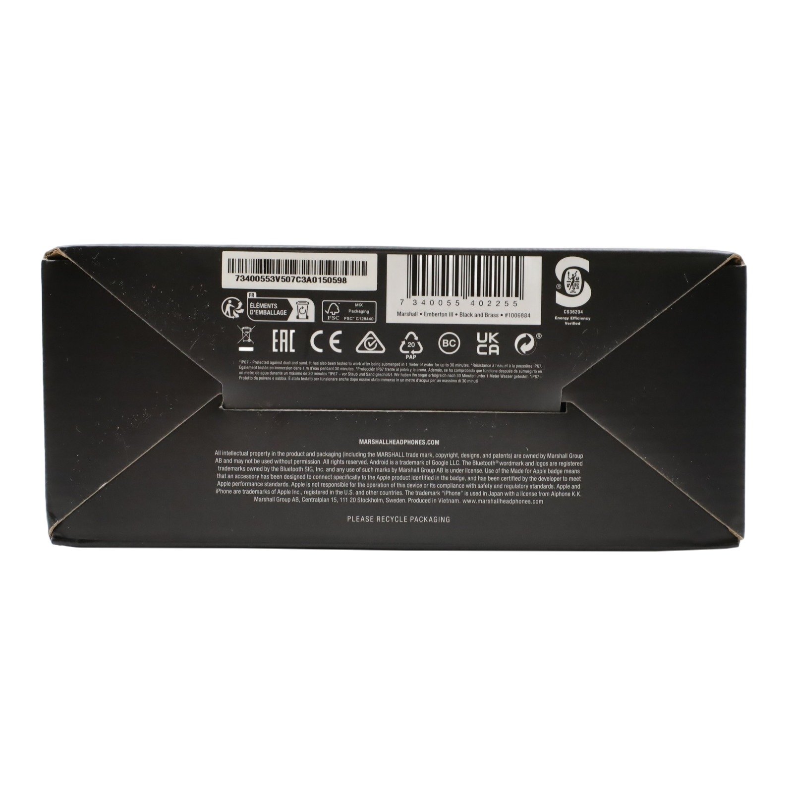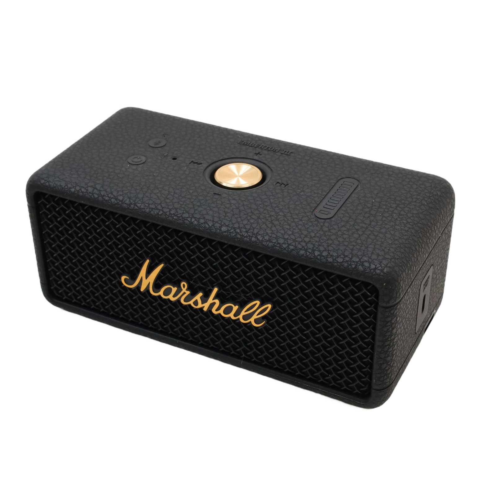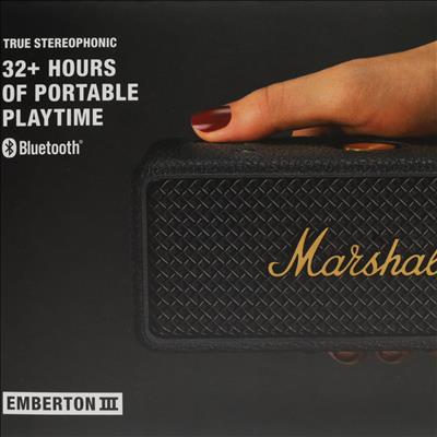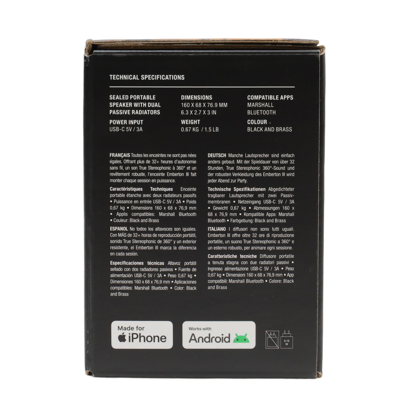 Features a rugged silicone exterior, metal grille, and an IP67 dust and water resistance rating, making it suitable for outdoor use. It delivers 360° True Stereophonic sound designed to provide balanced audio from any position, with Dynamic Loudness adjusting frequencies as the volume changes. The unit includes a built-in microphone for hands-free calling and supports Bluetooth LE Audio-ready functionality for future audio sharing features. Its design reflects classic Marshall styling with a textured finish and front grill while focusing on straightforward operation for everyday use.