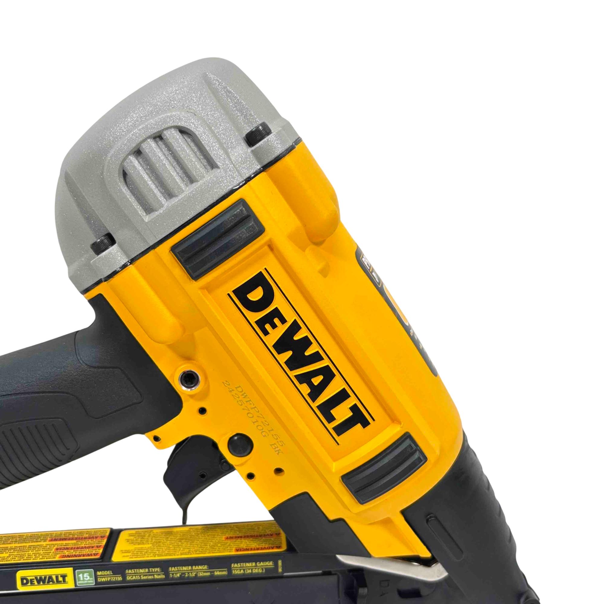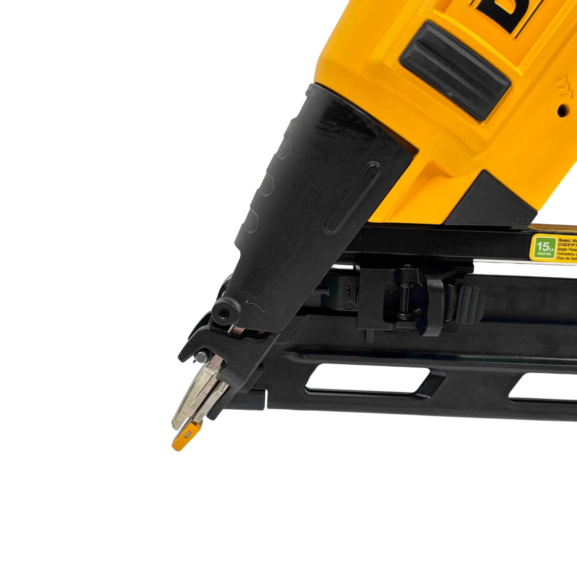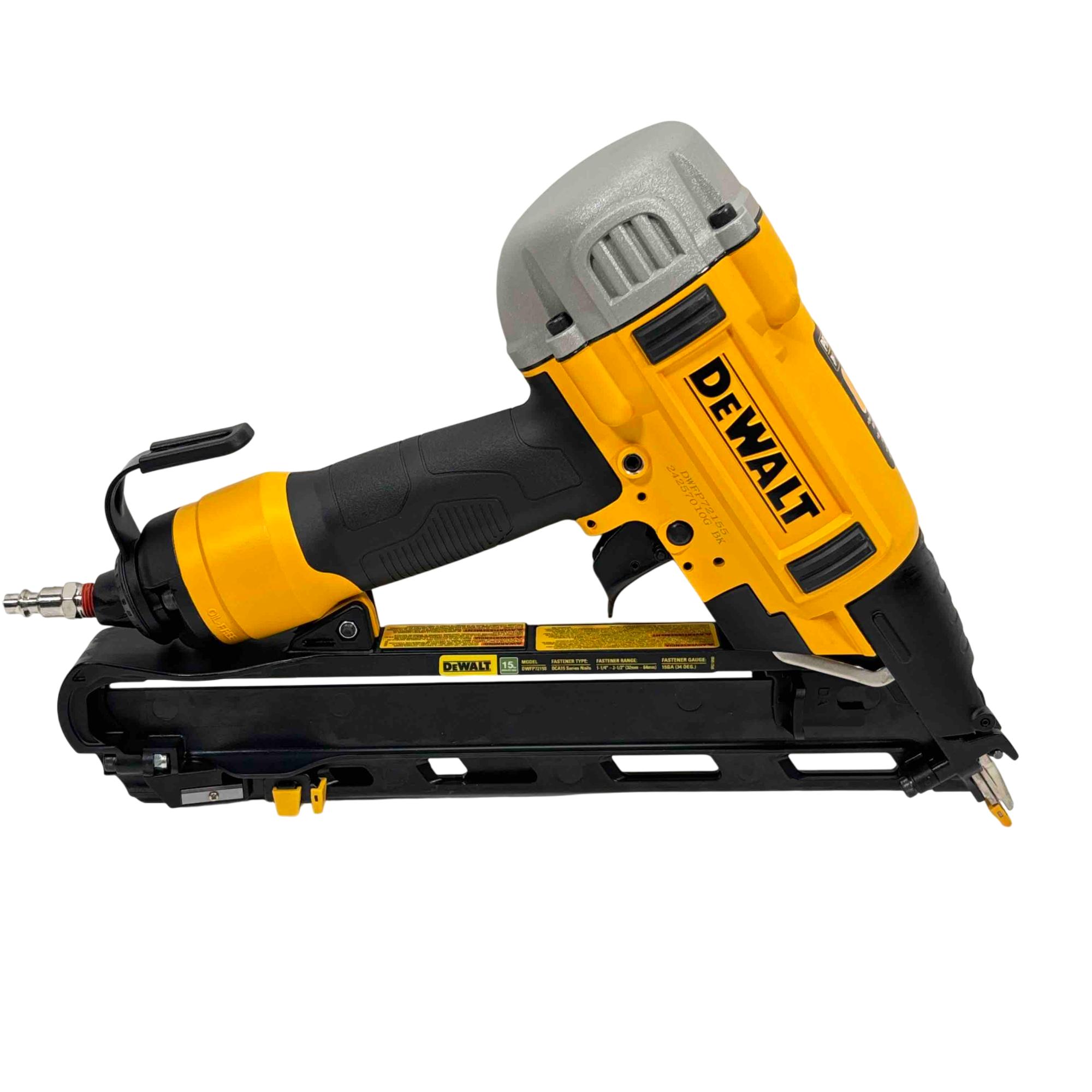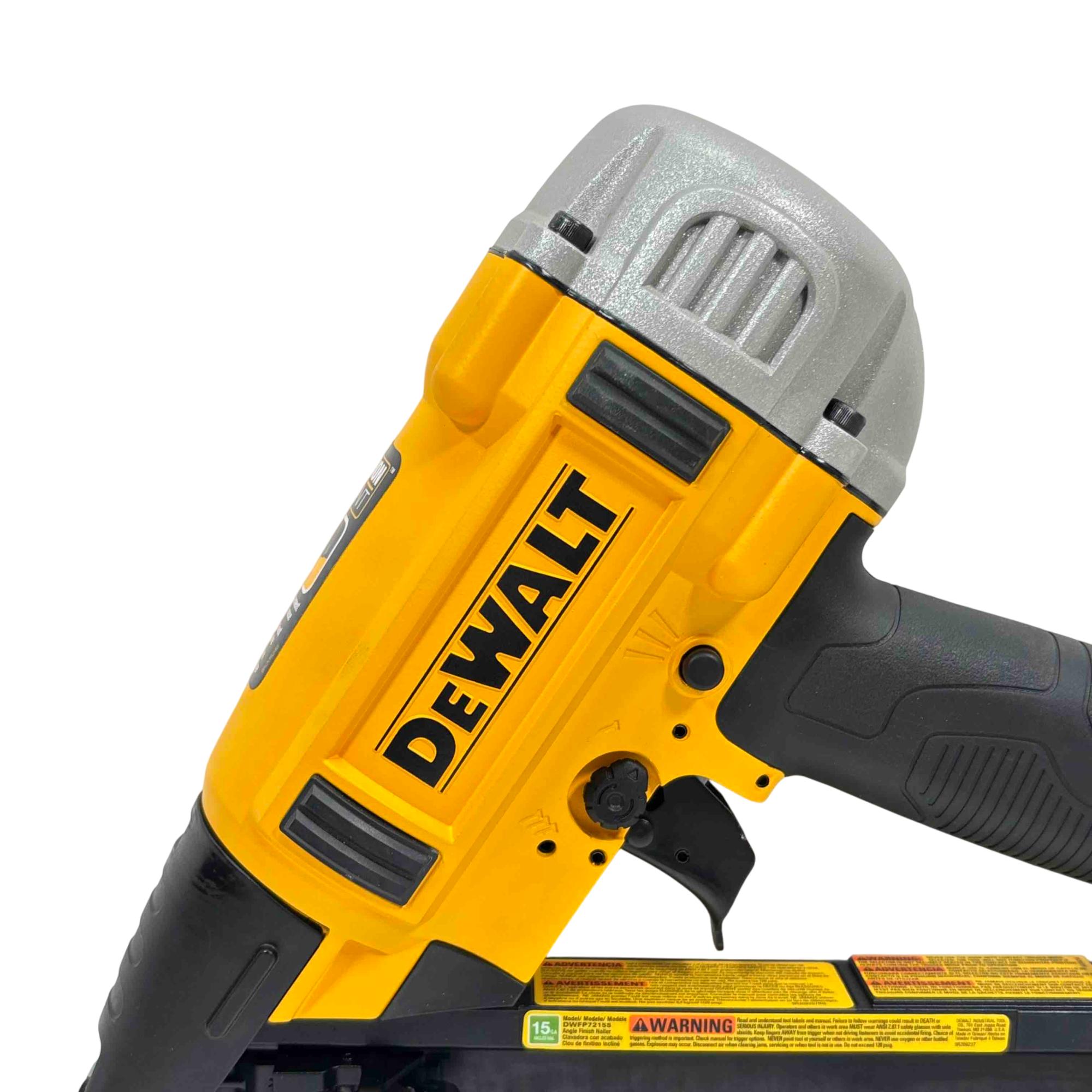 DEWALT DWFP72155 15-Gauge Angled Finish Nailer offers precise angled nailing designed for finish carpentry and trim work. Engineered with a robust yellow and black construction, this power tool ensures accurate nail placement with minimal surface damage, enhancing professional-quality results on a variety of woodworking projects.