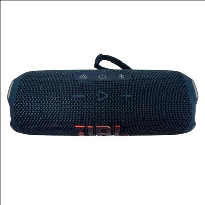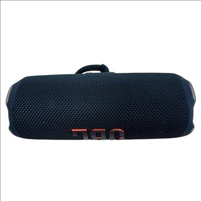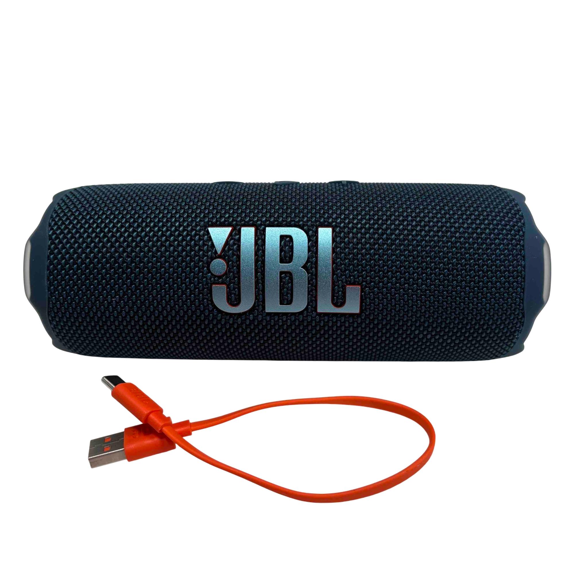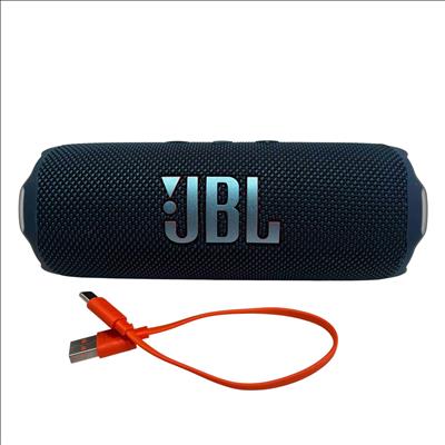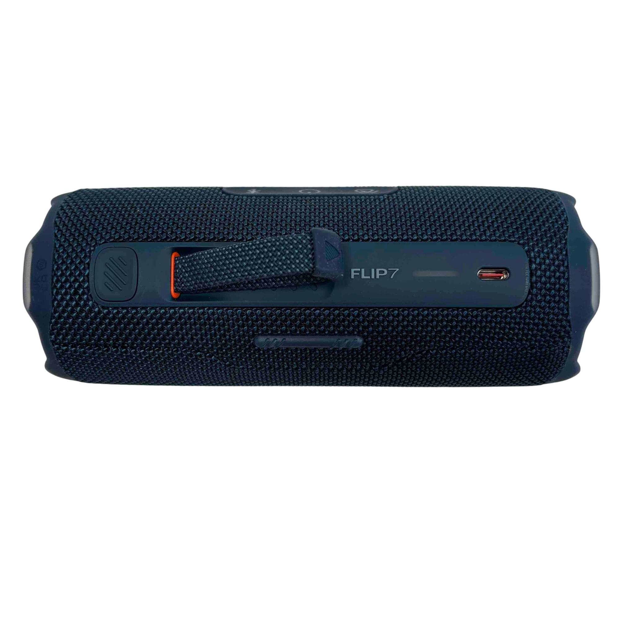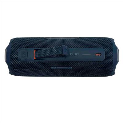 The JBL Flip 7 Blue Portable Waterproof Bluetooth Speaker FLIP7T delivers powerful sound in a compact, rugged design ideal for outdoor use. This speaker is resistant to water and dust, making it durable enough for various environments. Its vibrant orange USB-C cable adds a striking contrast to the sleek black body, combining style with functionality for on-the-go audio enjoyment.
