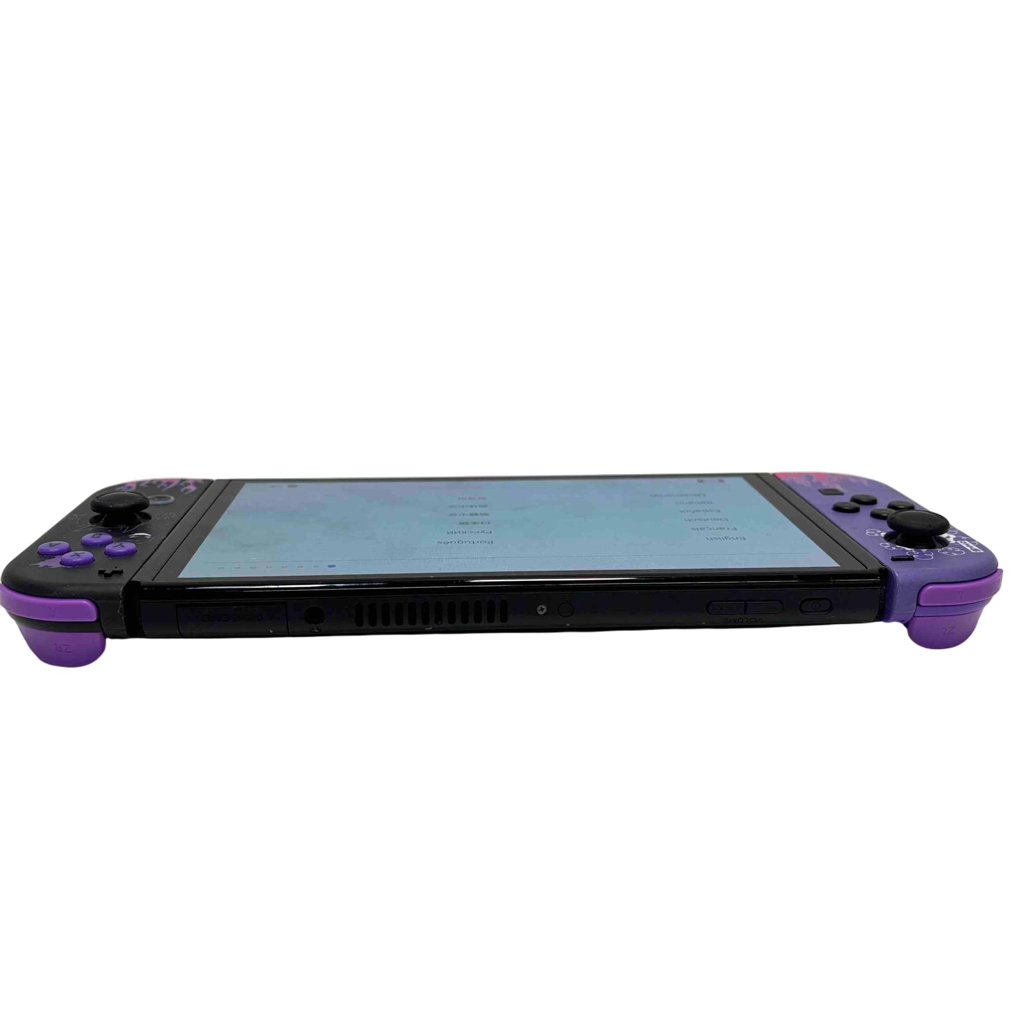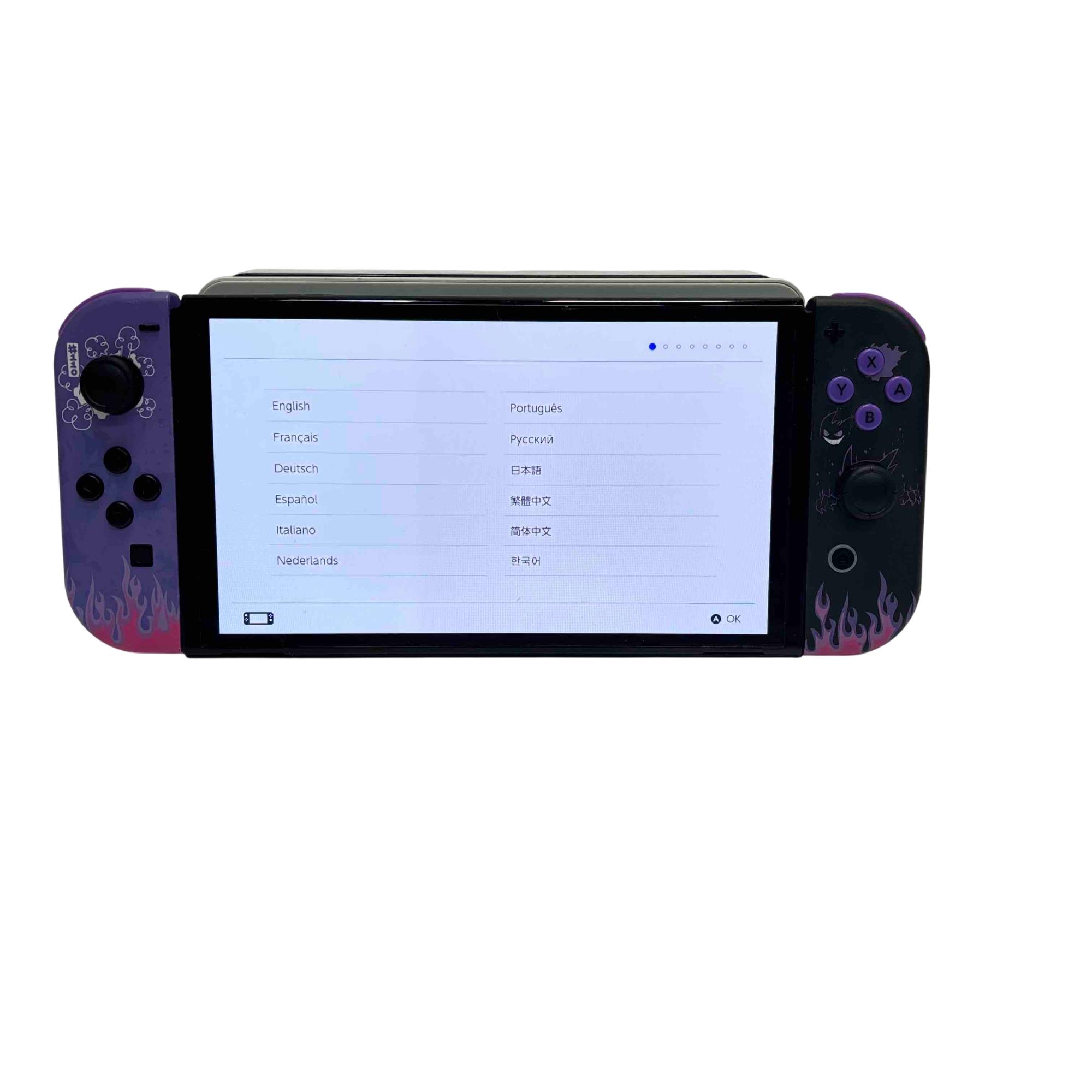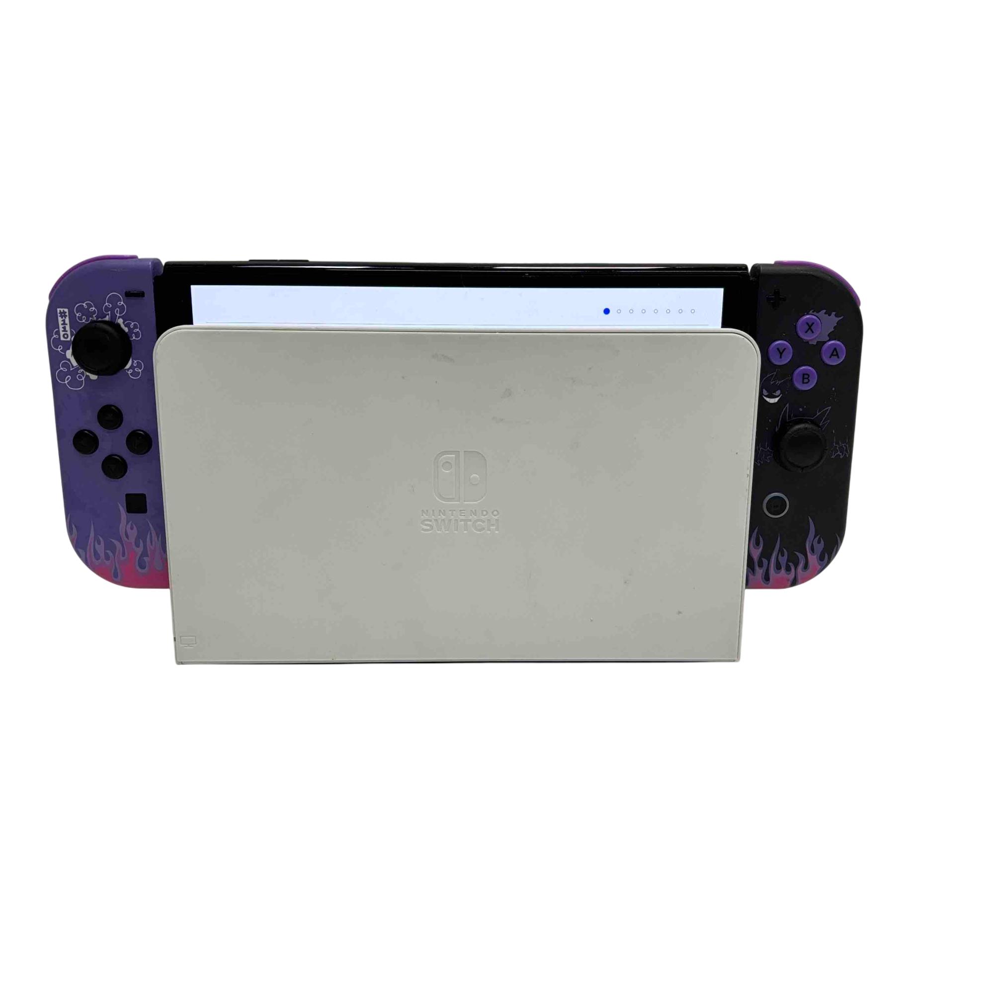 This Nintendo Switch OLED Model HEG-001 features a vibrant 7-inch OLED screen that delivers stunning visuals for an immersive gaming experience. The console showcases custom Gengar and purple Joy-Con skins inspired by Pokemon Scarlet & Violet, combining unique style with premium handheld gaming performance. It includes enhanced audio and a wide adjustable stand for versatile play modes and comfort.