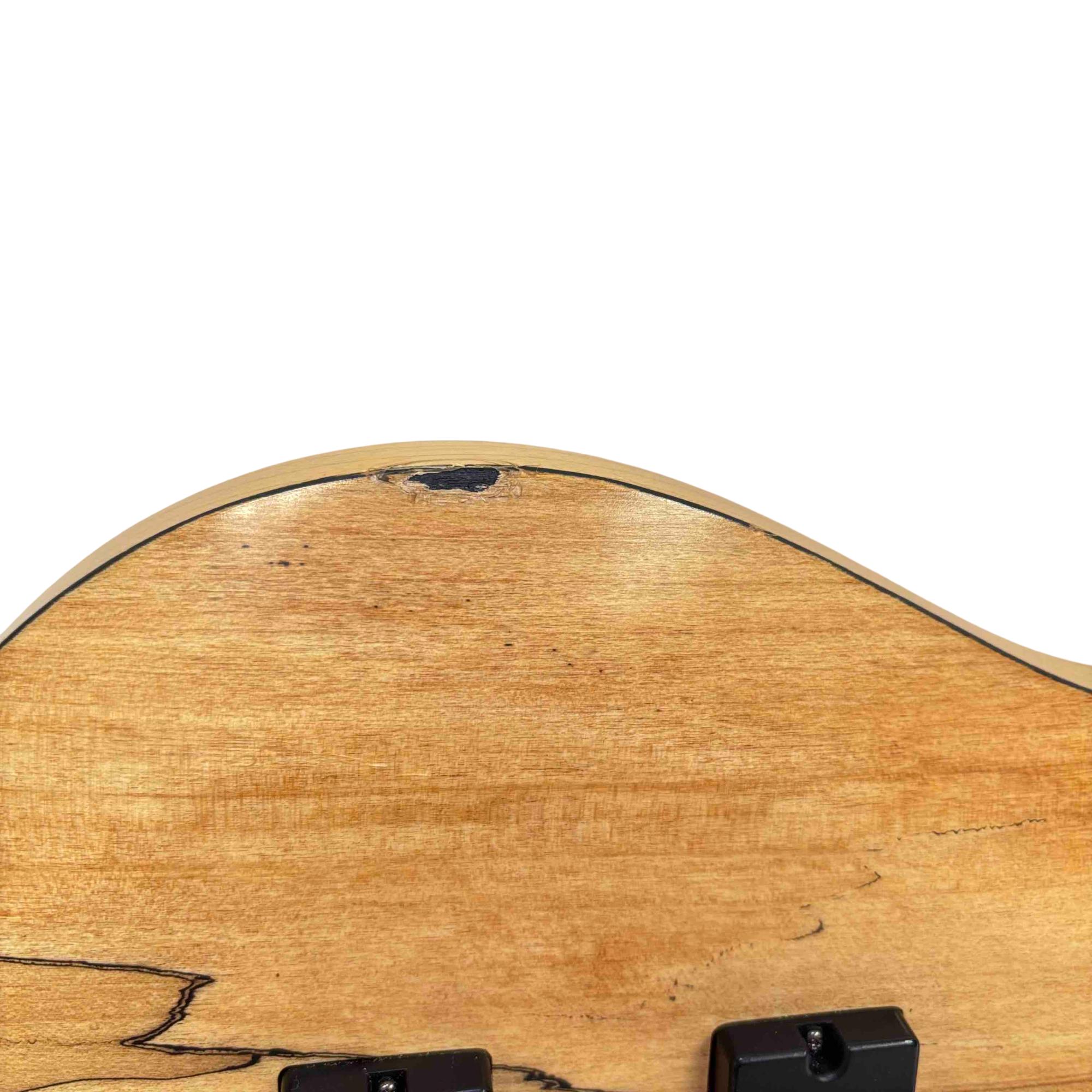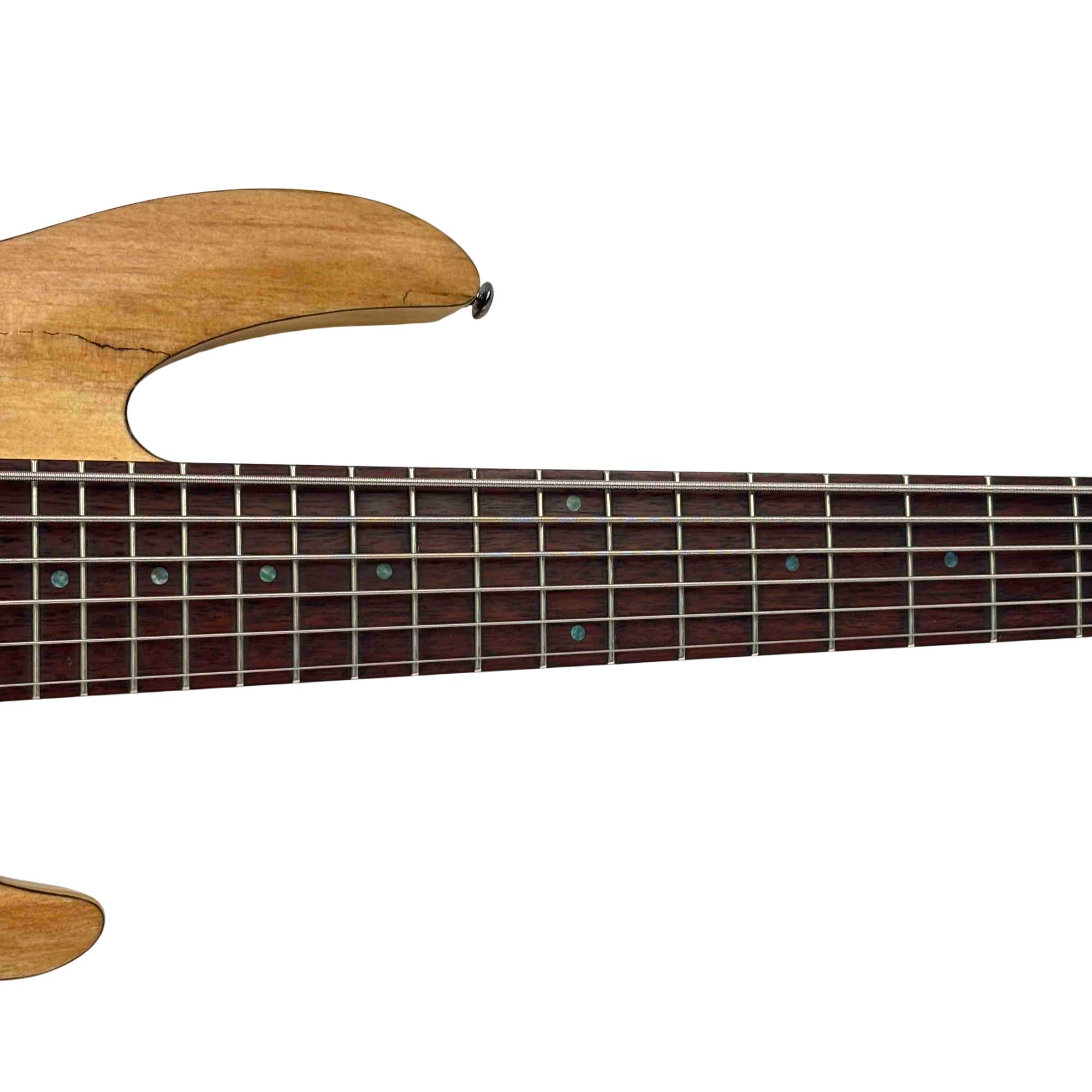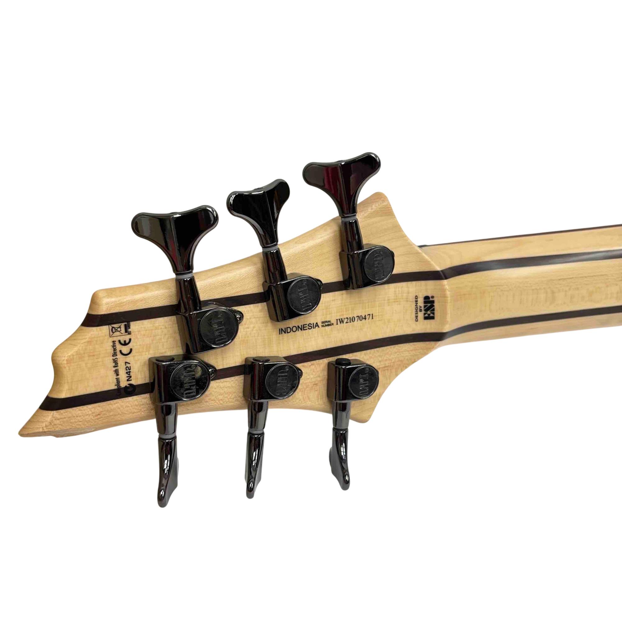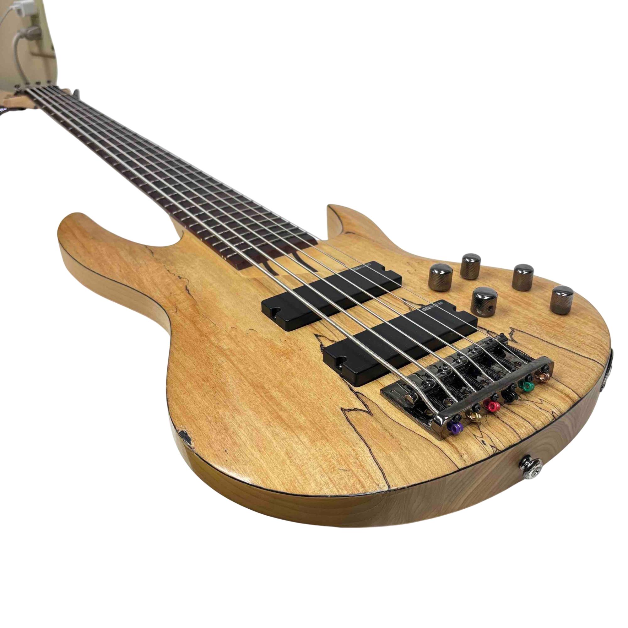 The ESP LTD B-206SM NS Spalted Maple 6-String Electric Bass Guitar features a natural satin finish highlighting its distinctive spalted maple top. This bass guitar combines solid construction with versatile tone options, designed for players seeking rich, dynamic sound across six strings. Its design includes precision hardware and a comfortable neck profile tailored for seamless playability in various musical styles.