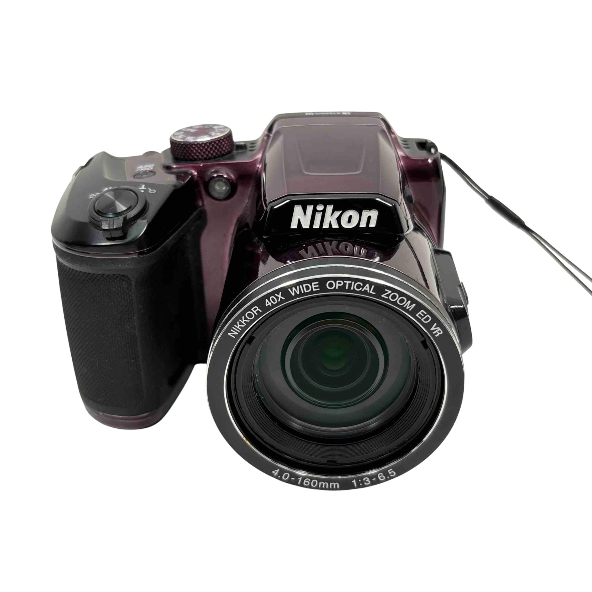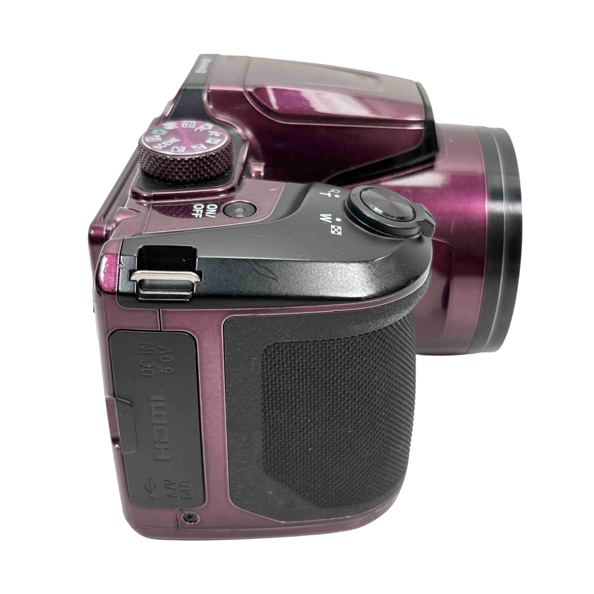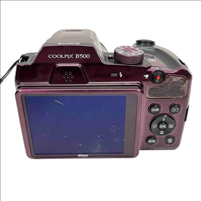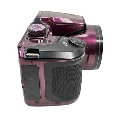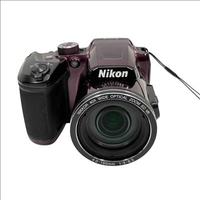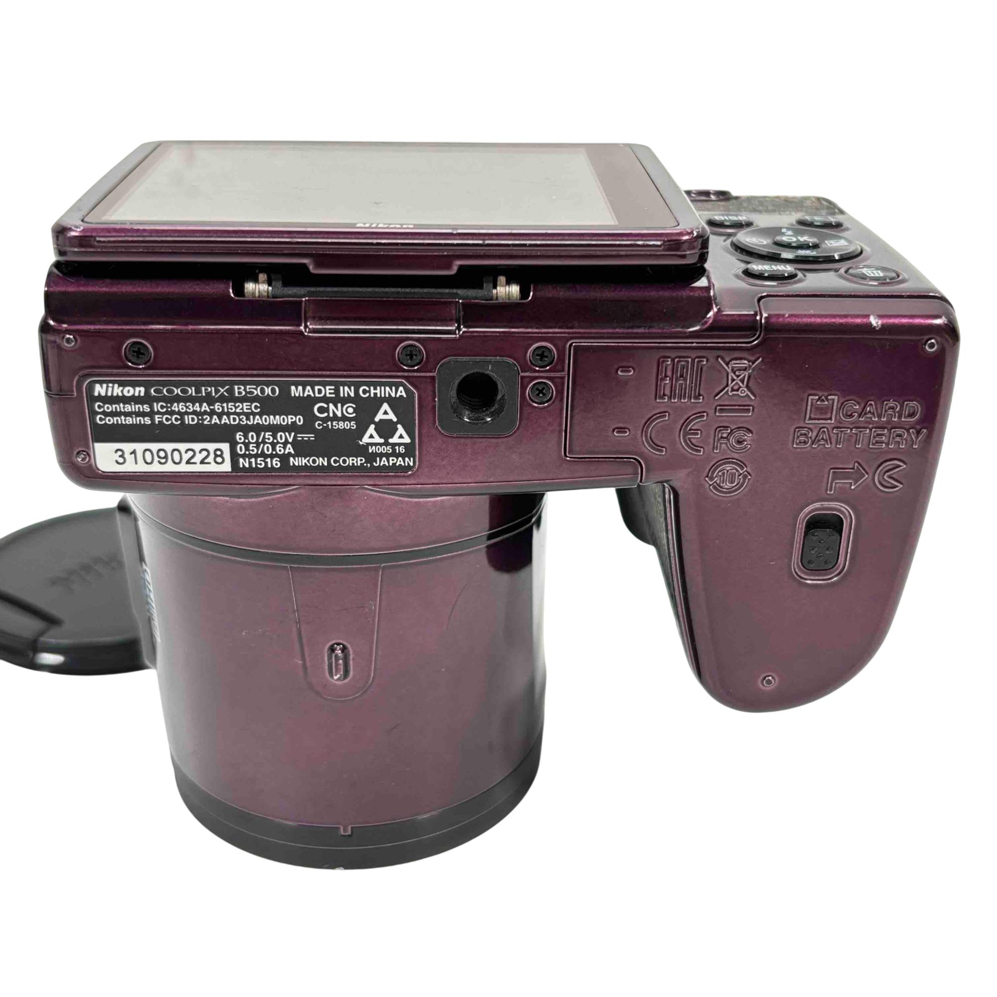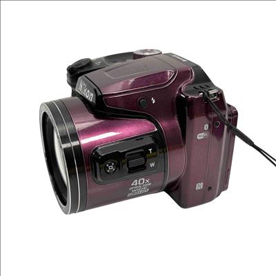 Nikon COOLPIX B500 16MP Digital Camera, Plum, features a powerful 40x optical zoom NIKKOR lens with a focal length range of 4.0-160mm and an aperture of f/3-6.5, enabling versatile shooting from wide-angle to telephoto. This compact camera includes built-in Wi-Fi for easy sharing and captures high-resolution images with its 16-megapixel sensor, making it ideal for both casual and enthusiast photographers.