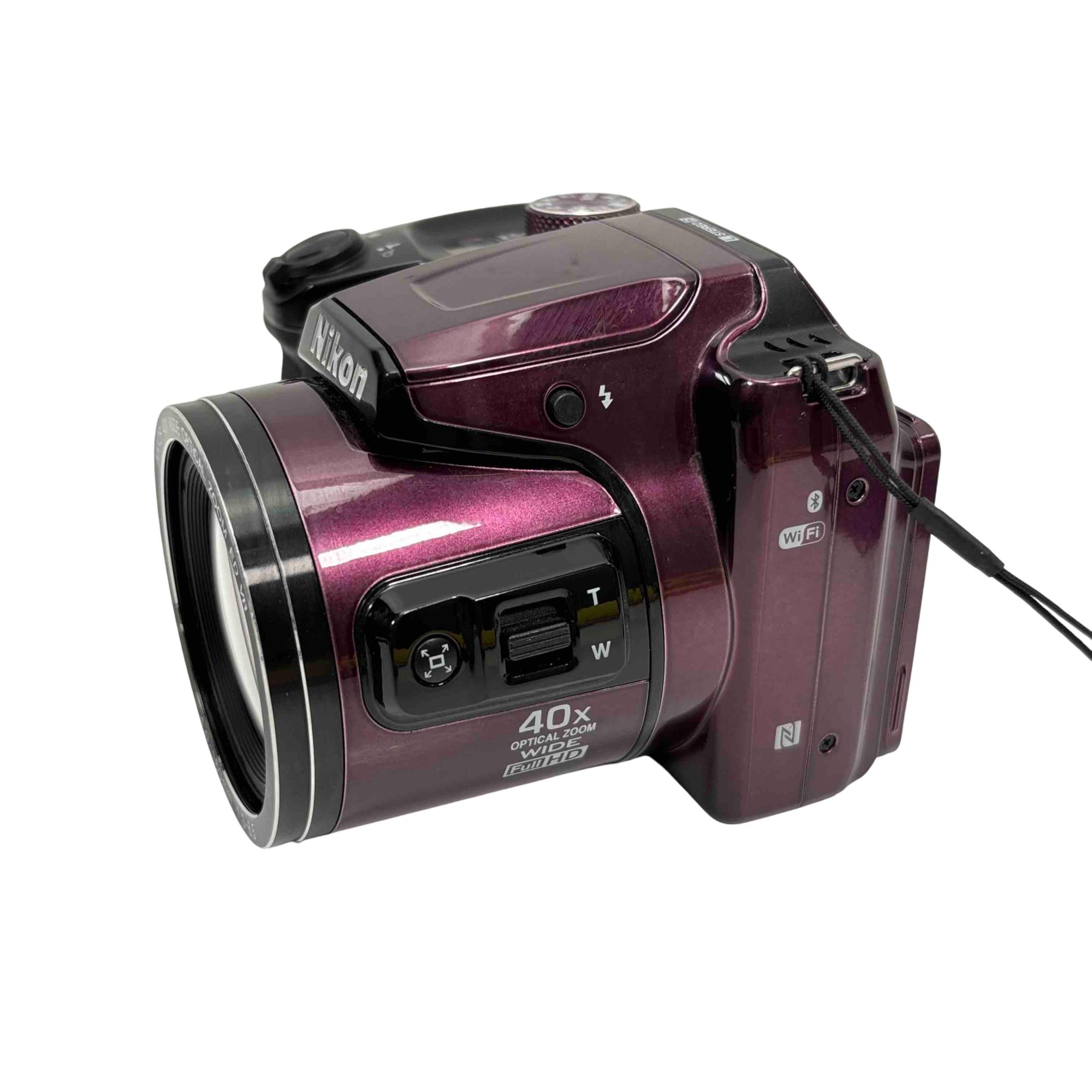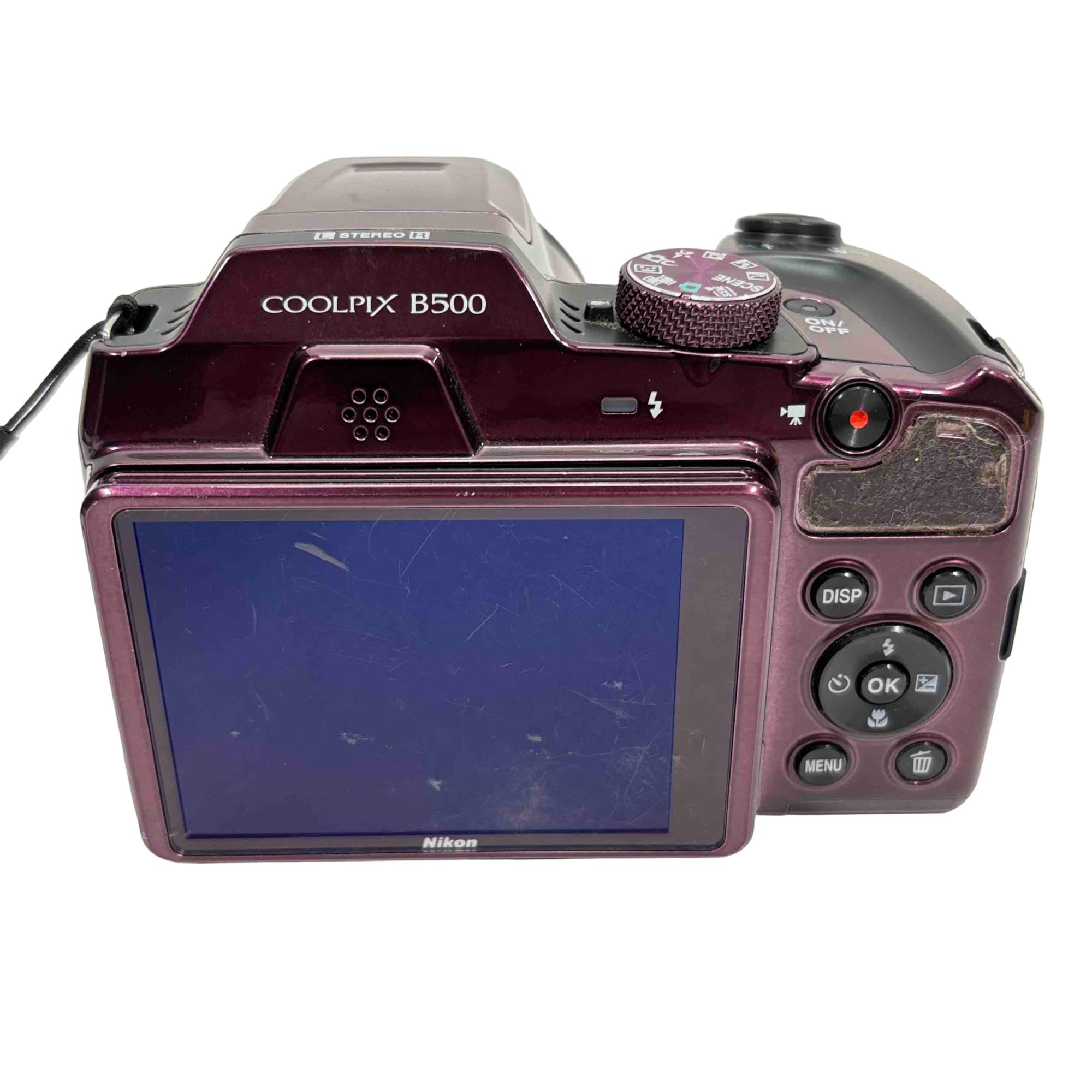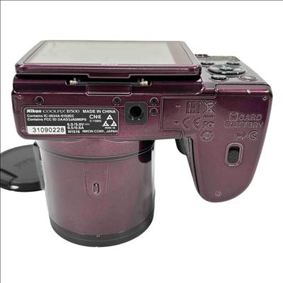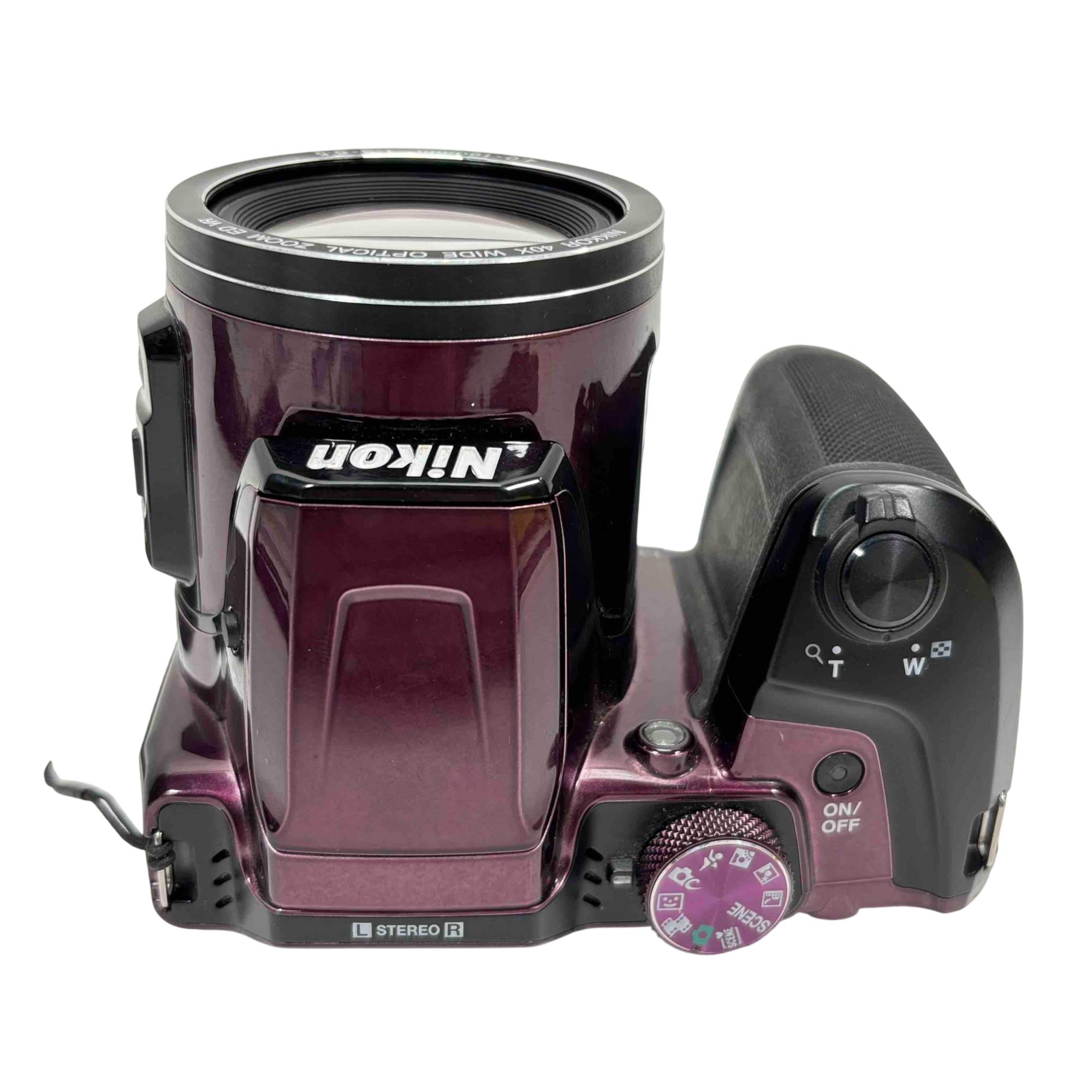 Nikon COOLPIX B500 16MP Digital Camera, Plum, features a powerful 40x optical zoom NIKKOR lens with a focal length range of 4.0-160mm and an aperture of f/3-6.5, enabling versatile shooting from wide-angle to telephoto. This compact camera includes built-in Wi-Fi for easy sharing and captures high-resolution images with its 16-megapixel sensor, making it ideal for both casual and enthusiast photographers.