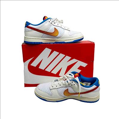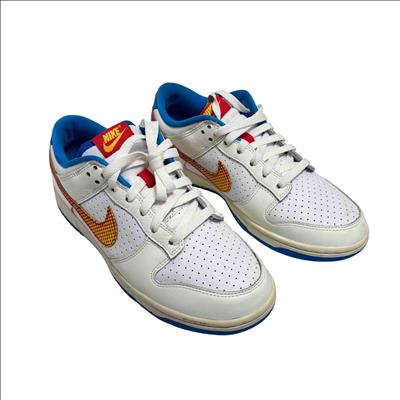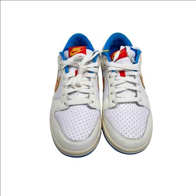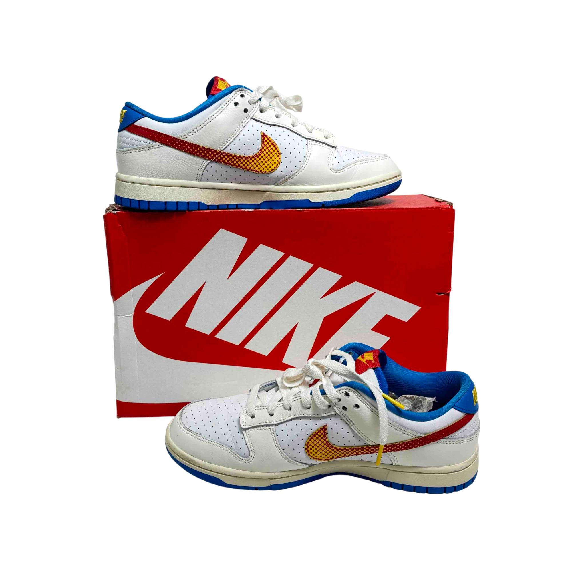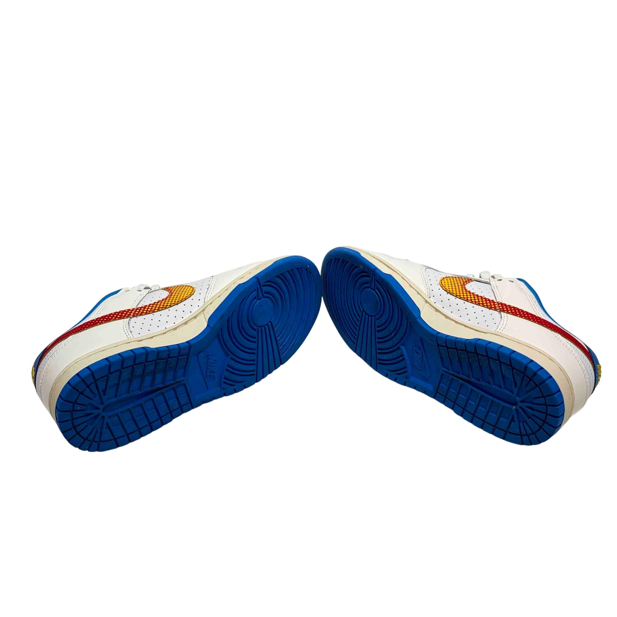 Nike Dunk Low Harlem Globetrotters Pop Art HQ3613-133 features a distinctive white upper with vibrant red and blue accents inspired by the iconic Harlem Globetrotters colors. This low-top sneaker combines classic Dunk silhouette design with bold, colorful detailing and a comfortable fit, making it ideal for both casual wear and athletic activities.