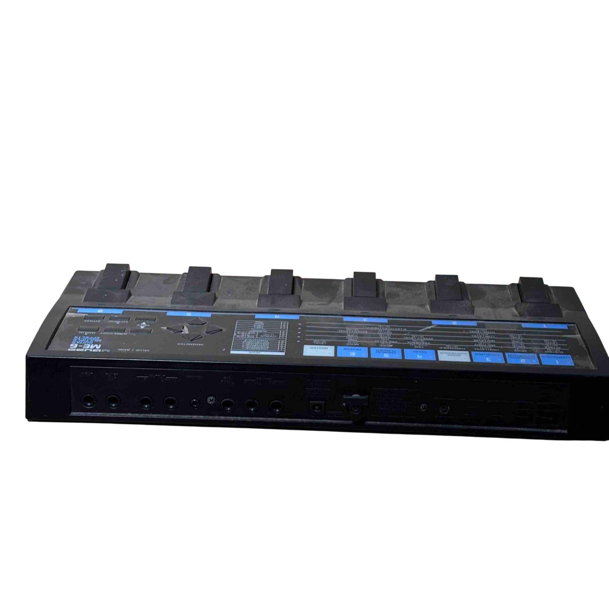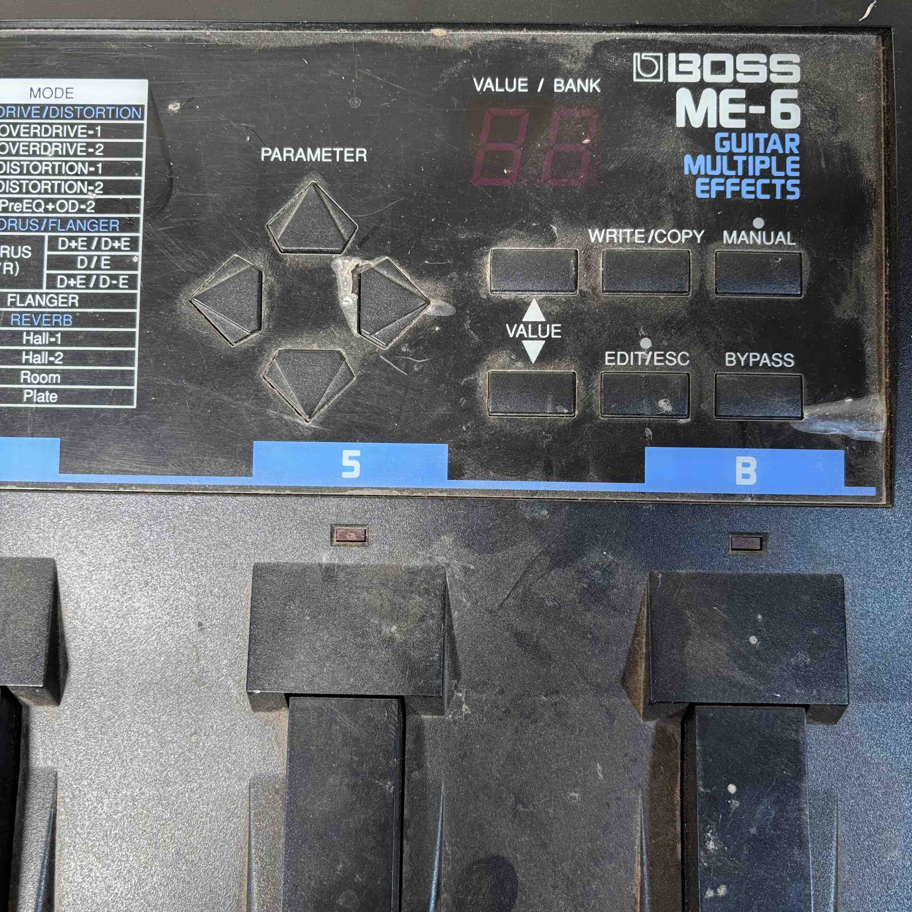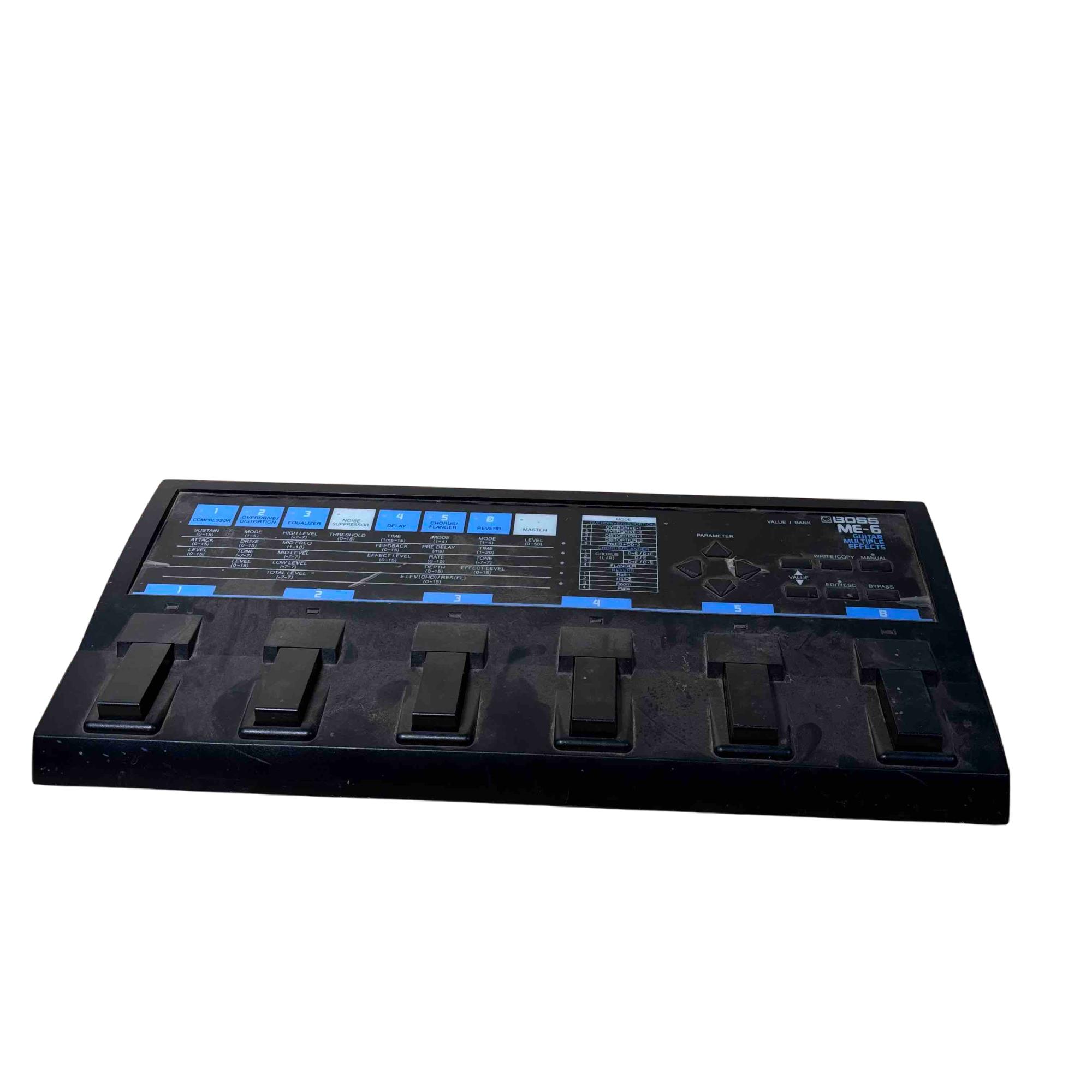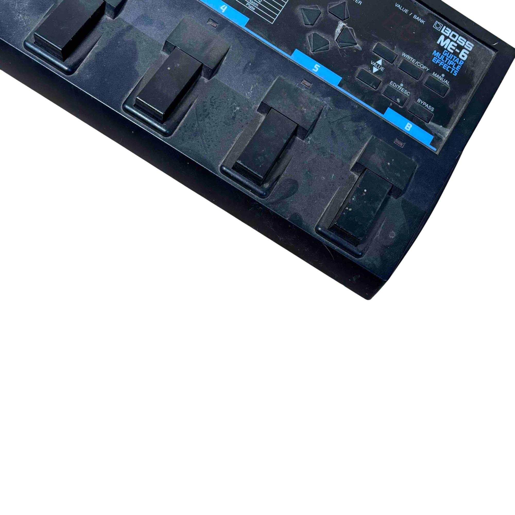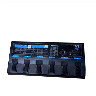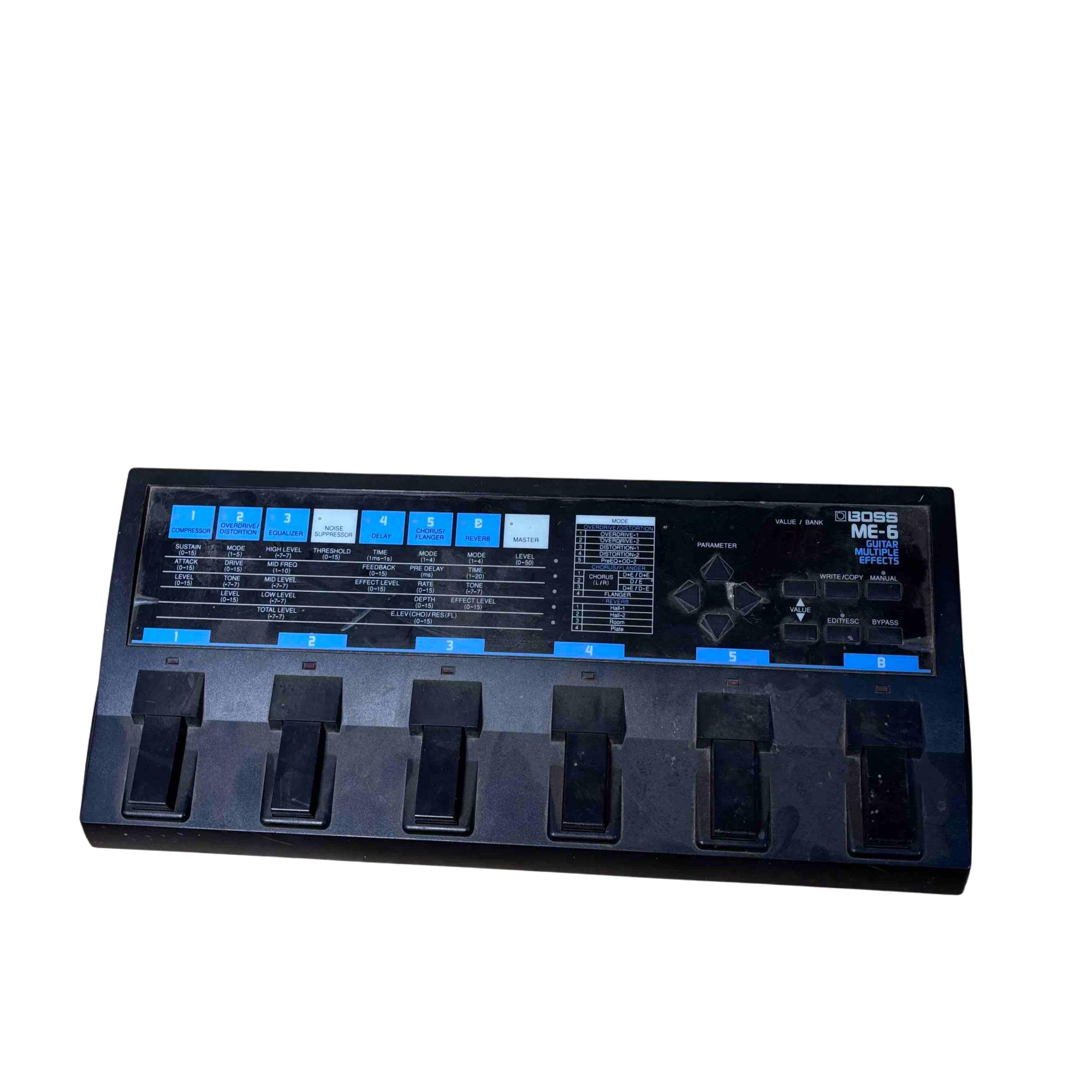 BOSS ME-6 Guitar Multiple Effects Pedal offers a versatile range of classic guitar effects including distortion, chorus, flanger, delay, reverb, equalizer, and noise suppression. Designed with adjustable parameters such as level, tone, feedback, and mode settings, it provides precise control over sound shaping for creative performance and recording. This compact, black pedal features intuitive blue and white buttons for easy navigation through multiple effect banks.