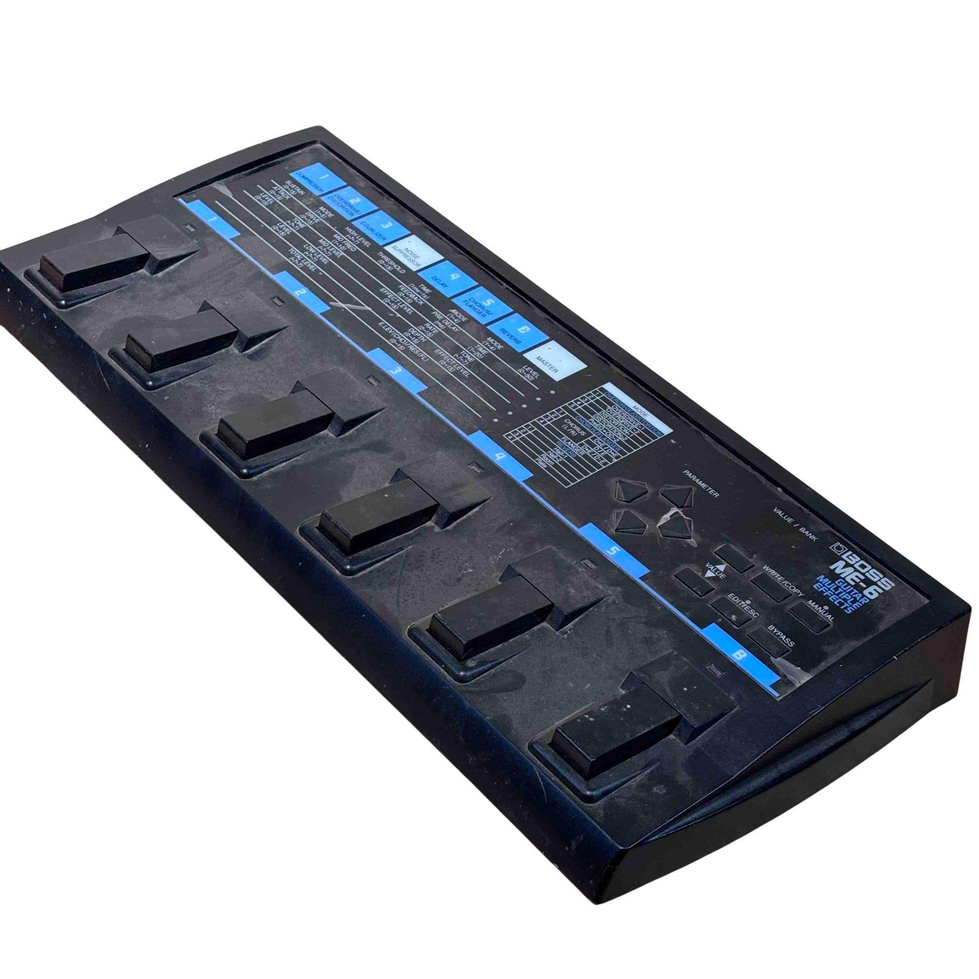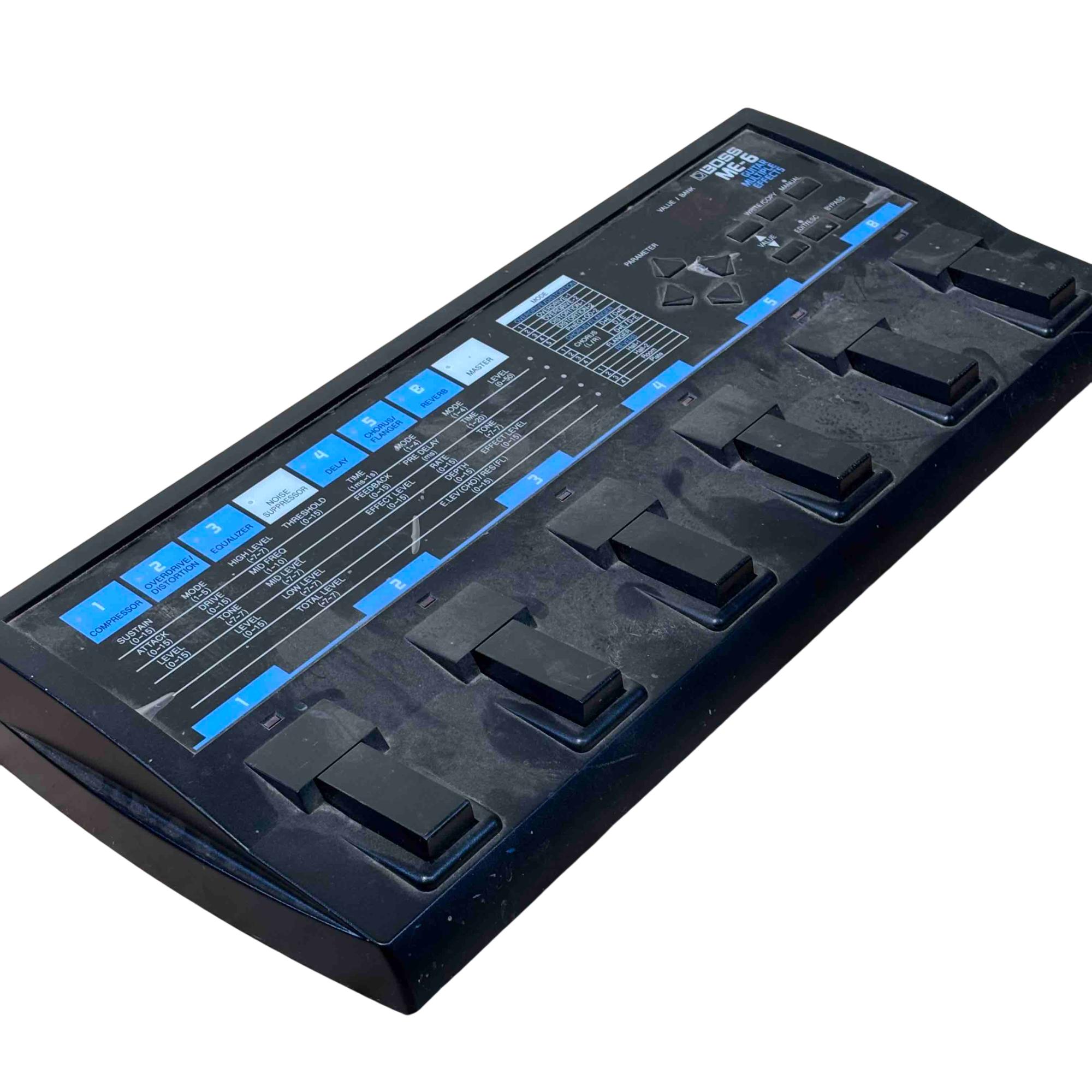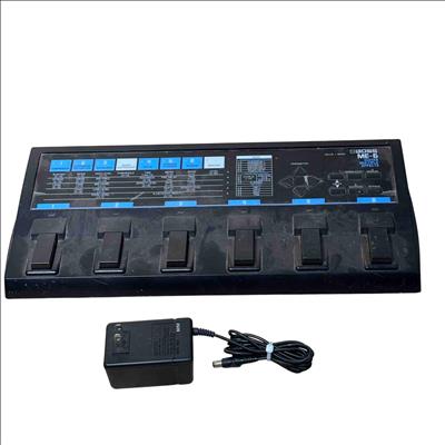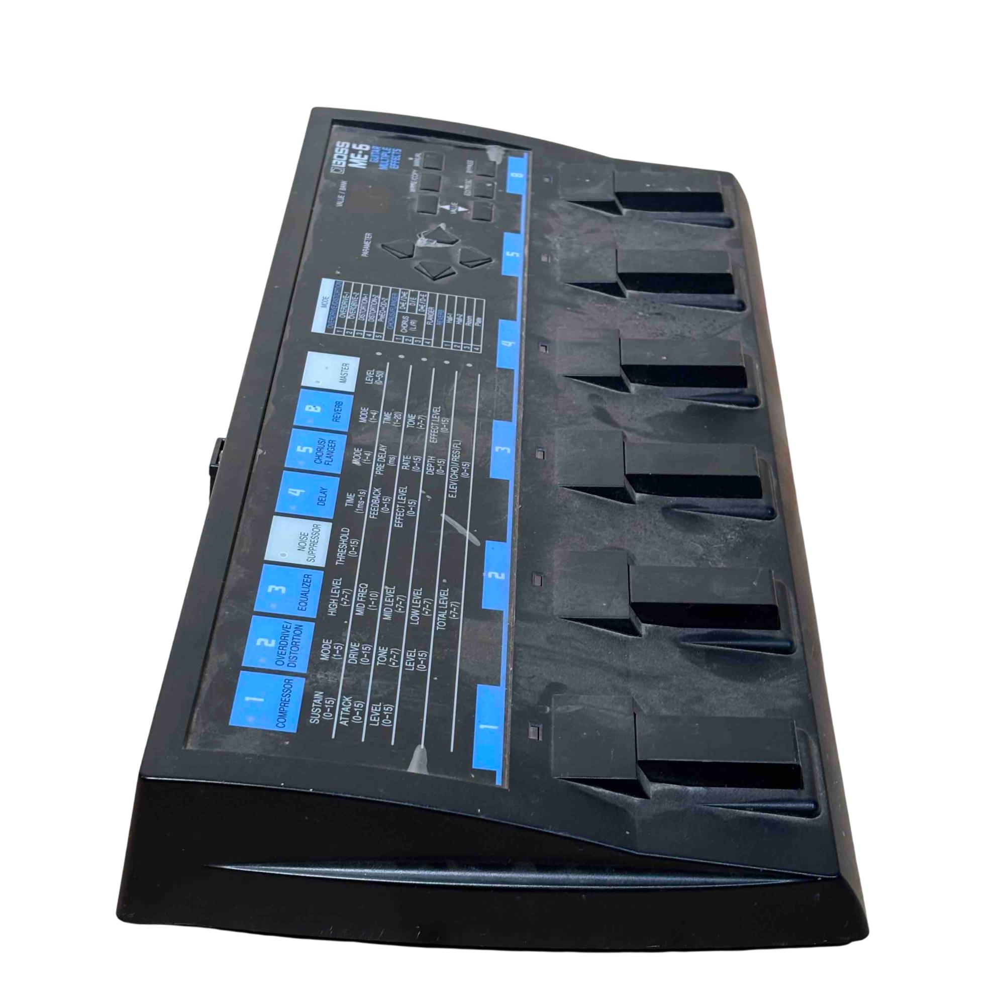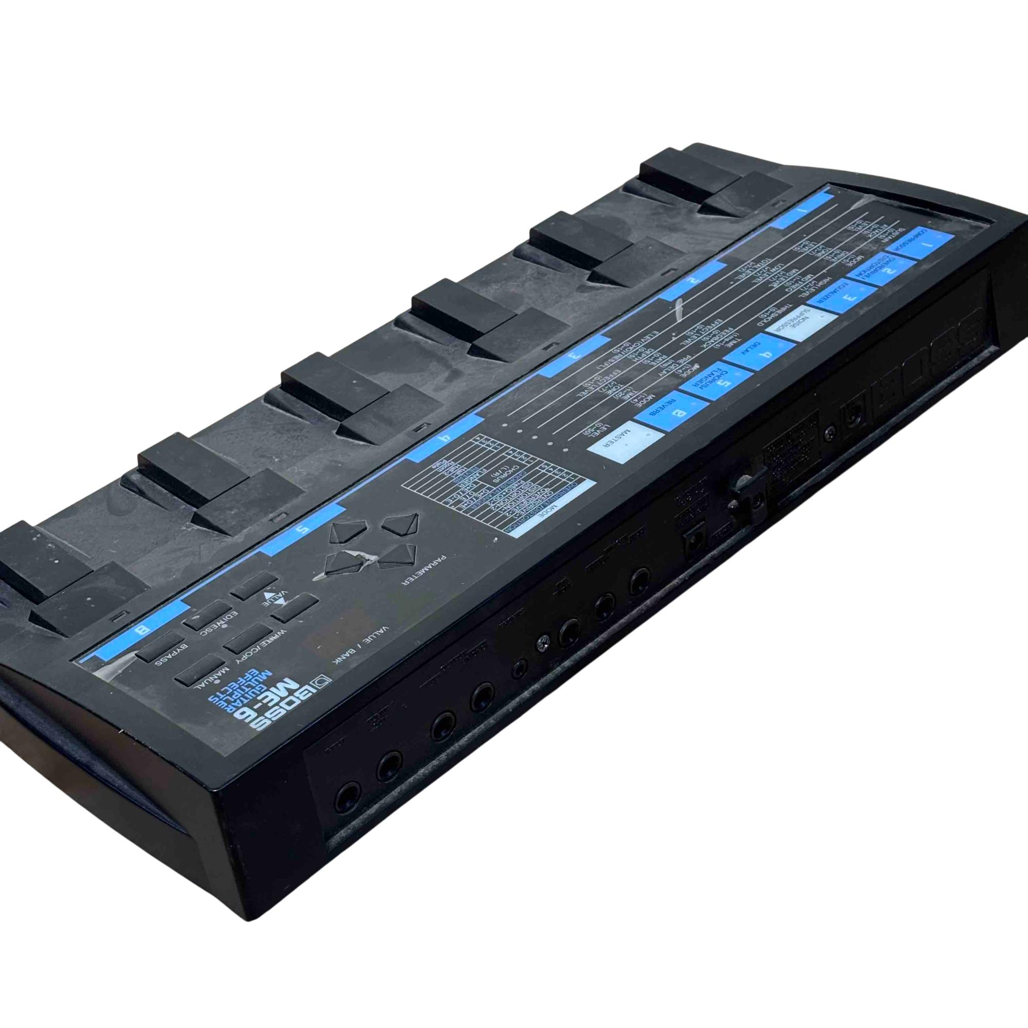 BOSS ME-6 Guitar Multiple Effects Pedal offers a versatile range of classic guitar effects including distortion, chorus, flanger, delay, reverb, equalizer, and noise suppression. Designed with adjustable parameters such as level, tone, feedback, and mode settings, it provides precise control over sound shaping for creative performance and recording. This compact, black pedal features intuitive blue and white buttons for easy navigation through multiple effect banks.