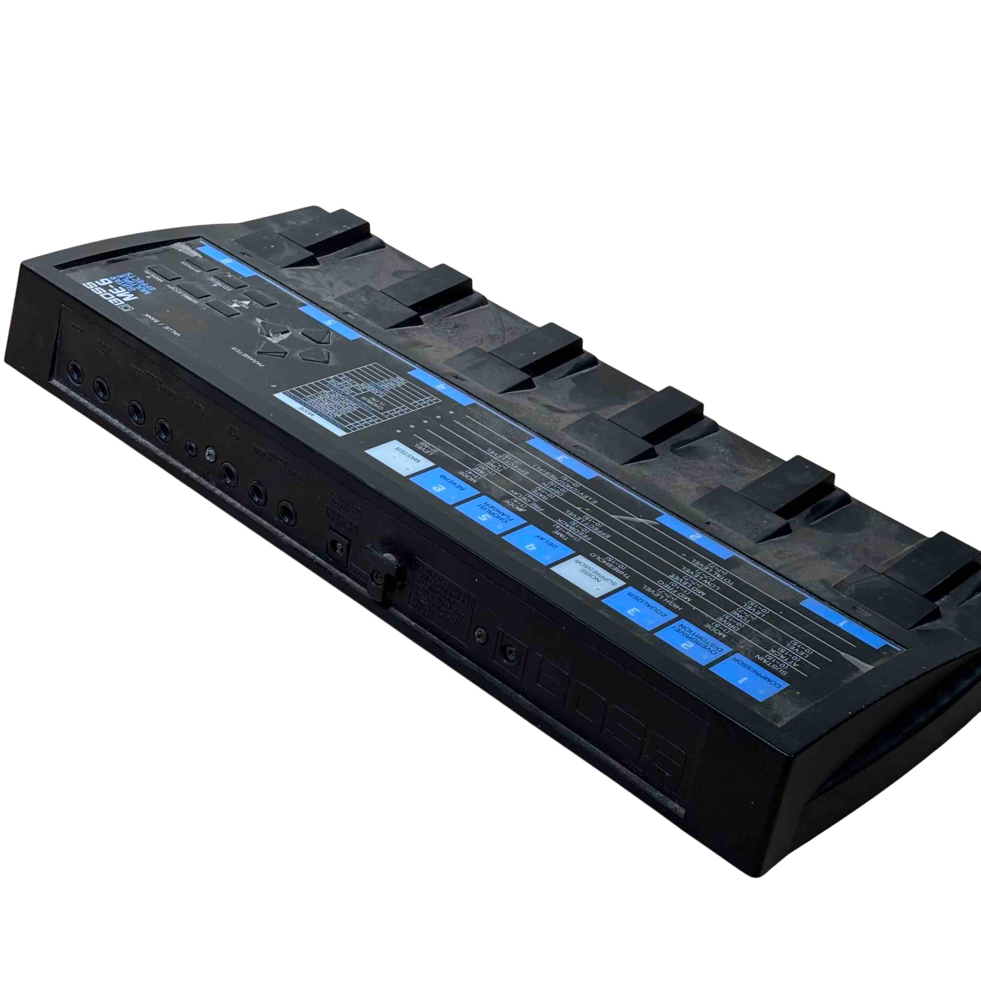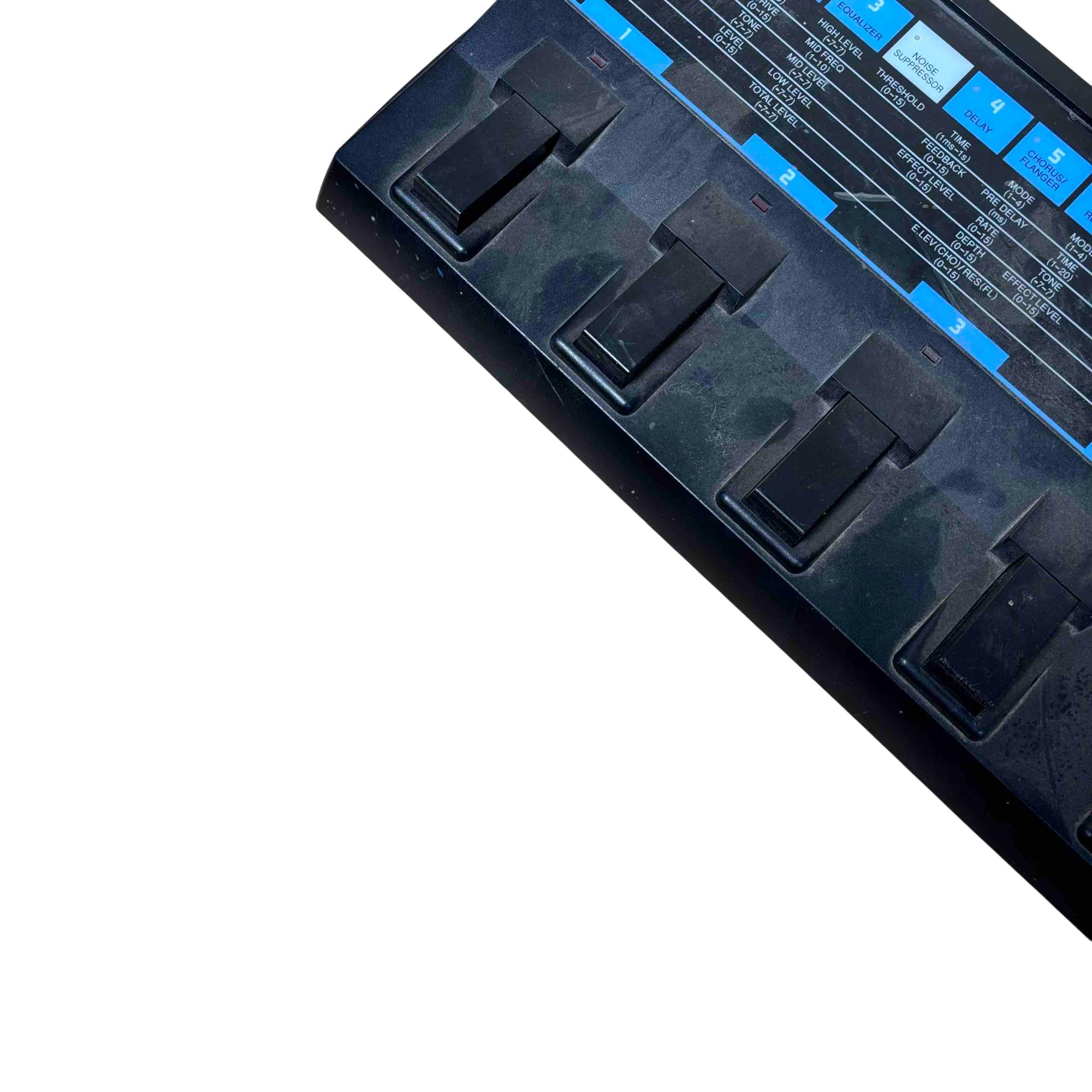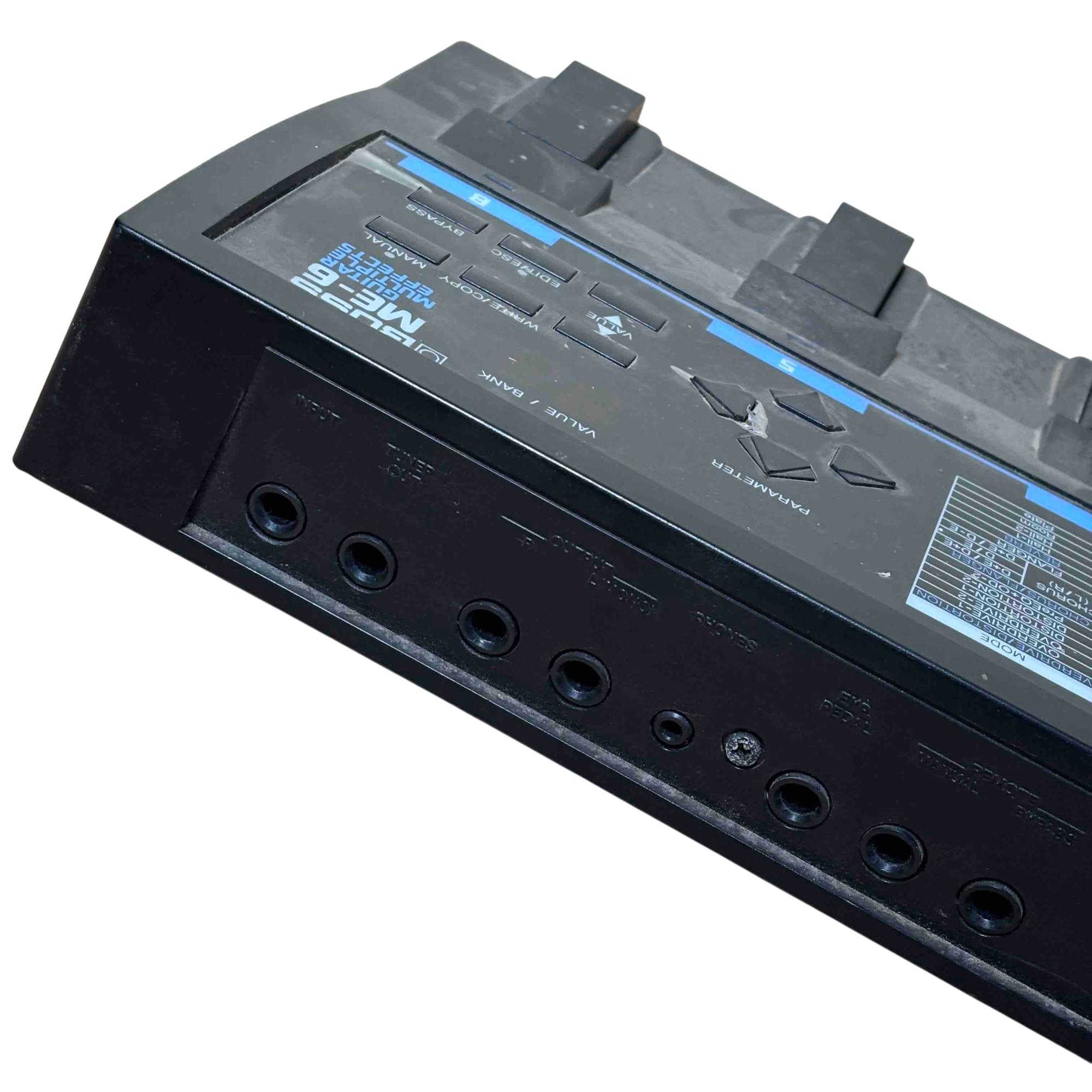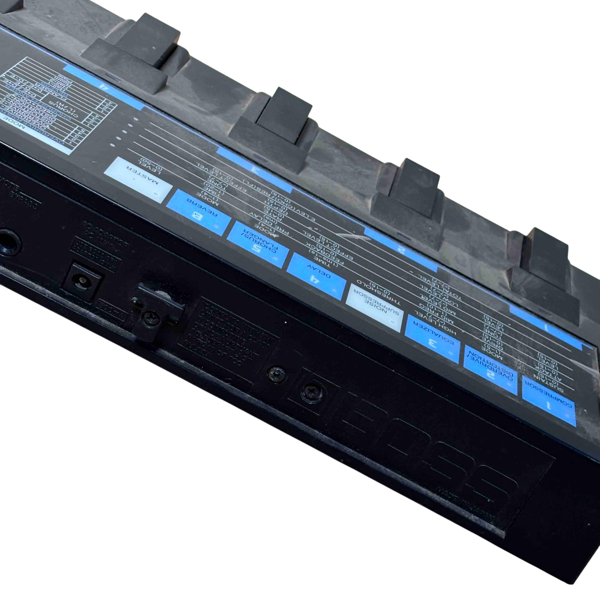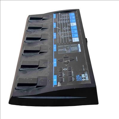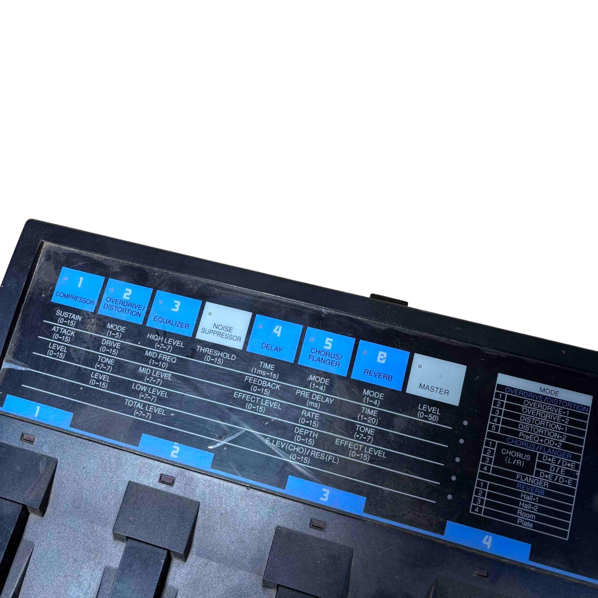 BOSS ME-6 Guitar Multiple Effects Pedal offers a versatile range of classic guitar effects including distortion, chorus, flanger, delay, reverb, equalizer, and noise suppression. Designed with adjustable parameters such as level, tone, feedback, and mode settings, it provides precise control over sound shaping for creative performance and recording. This compact, black pedal features intuitive blue and white buttons for easy navigation through multiple effect banks.