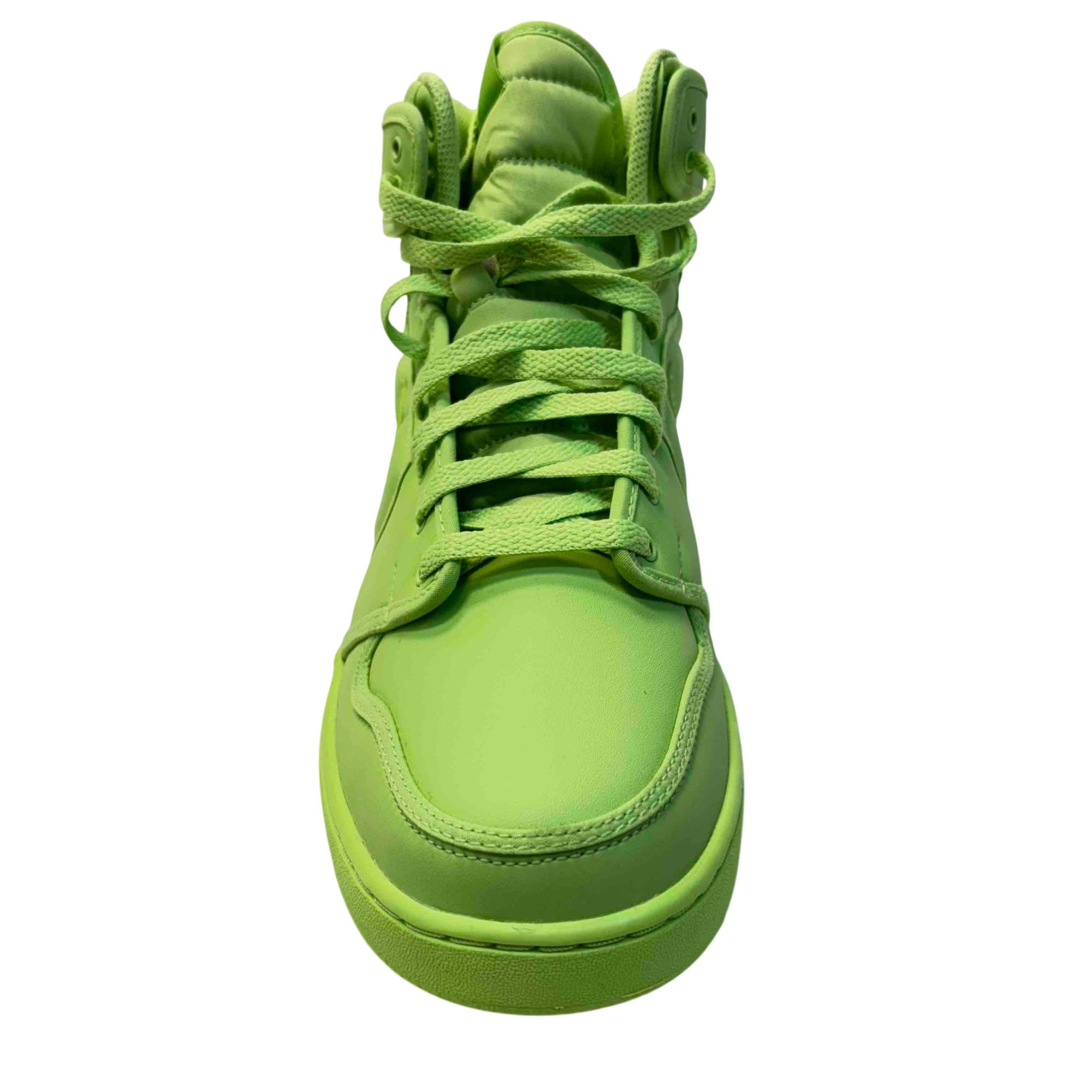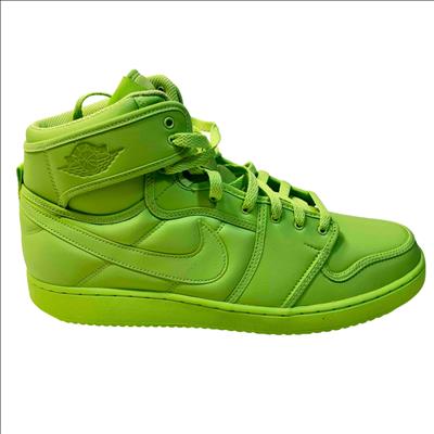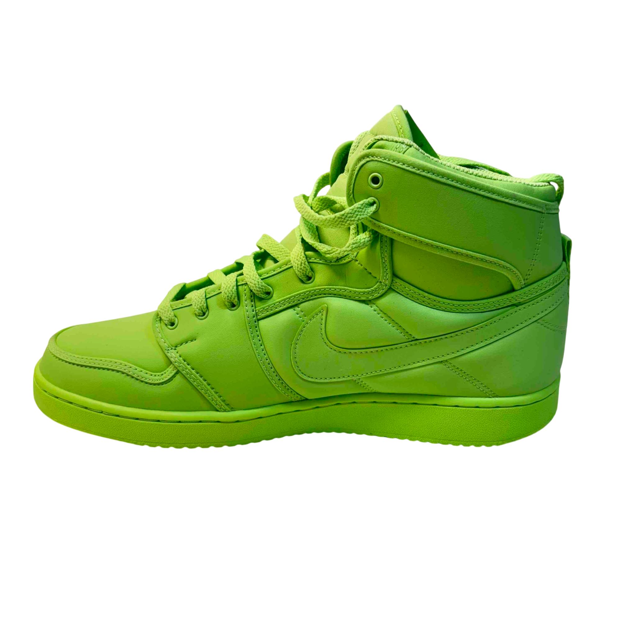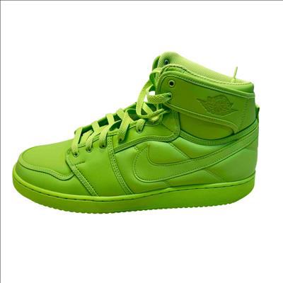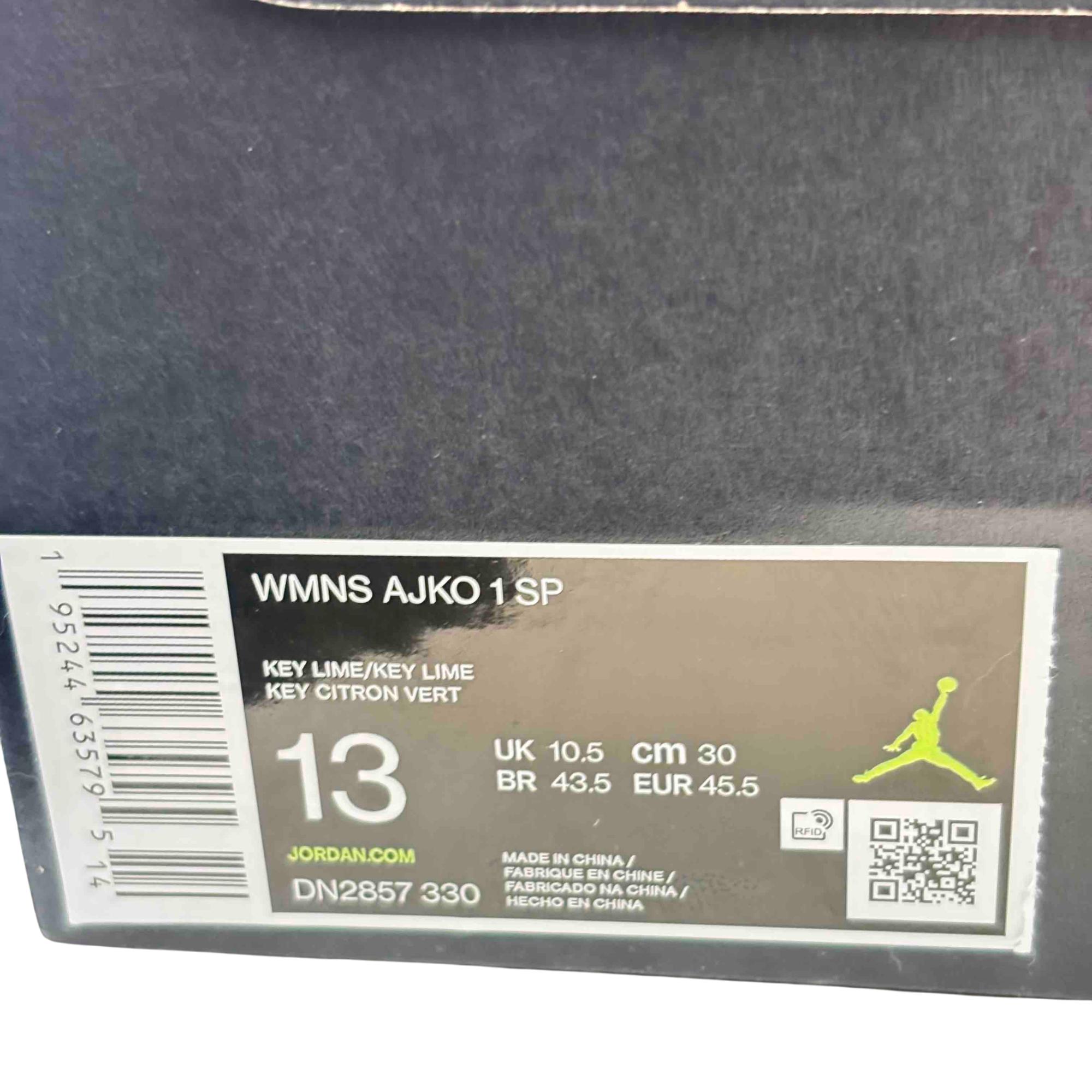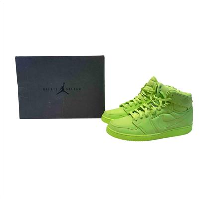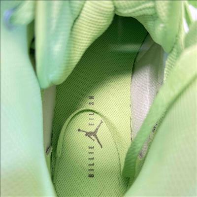 Billie Eilish x Nike Air Jordan 1 KO Ghost Green (DN2857-330) features a distinctive design with vibrant green leather and knitted fabric accents. This sneaker showcases a close-up view of detailed laces and textured surfaces, embodying outdoor and athletic footwear style with a bold, street-ready appearance optimized for running and casual wear.