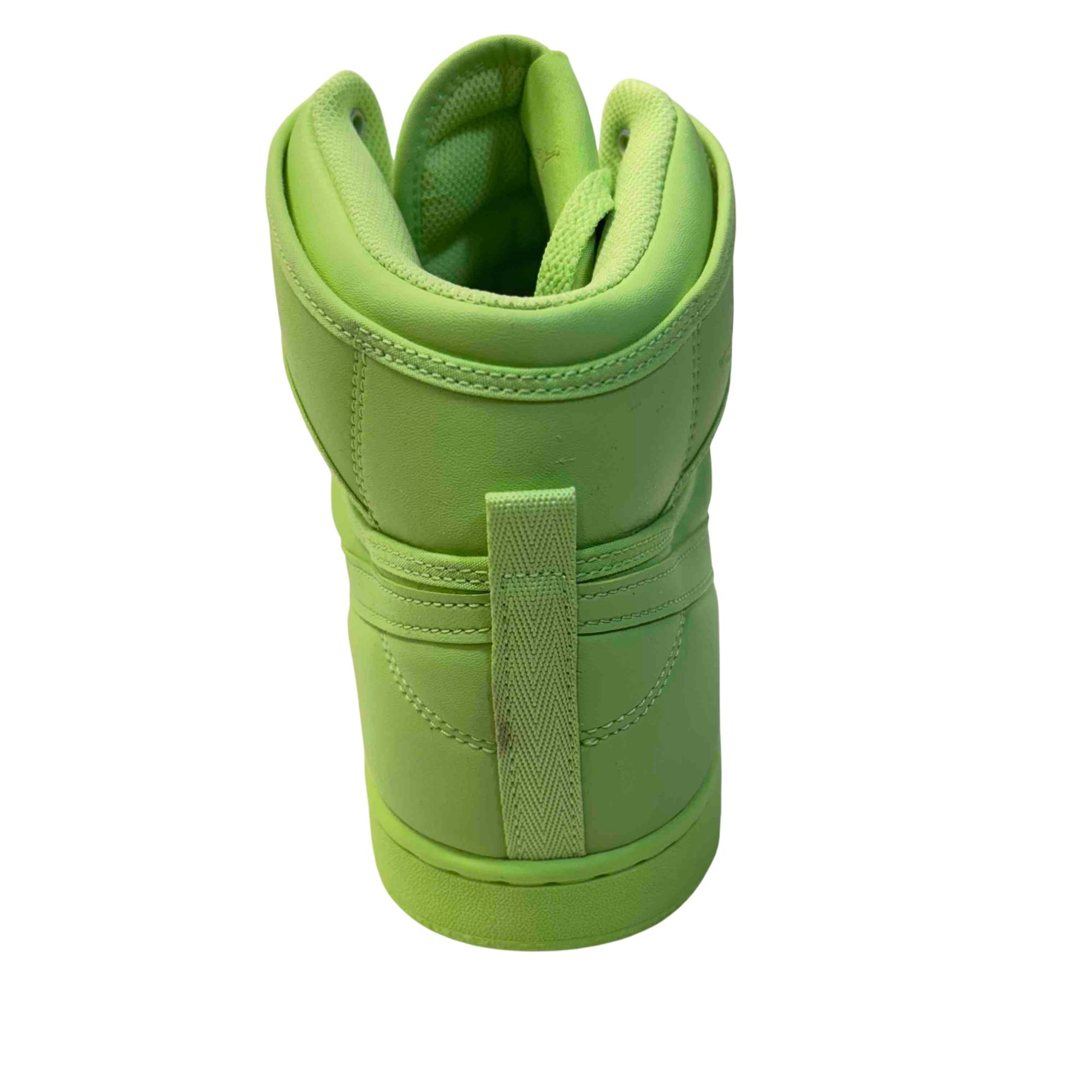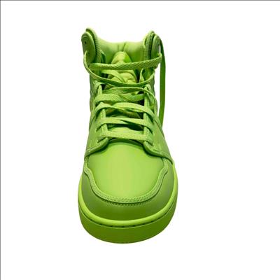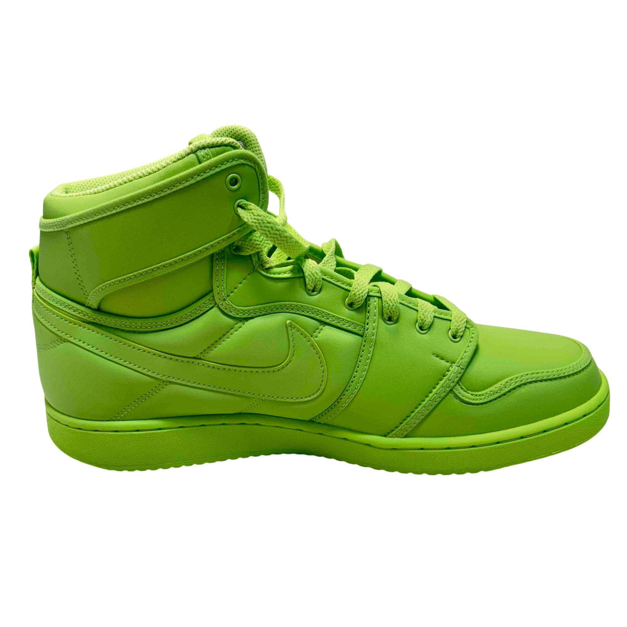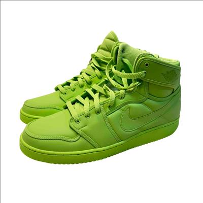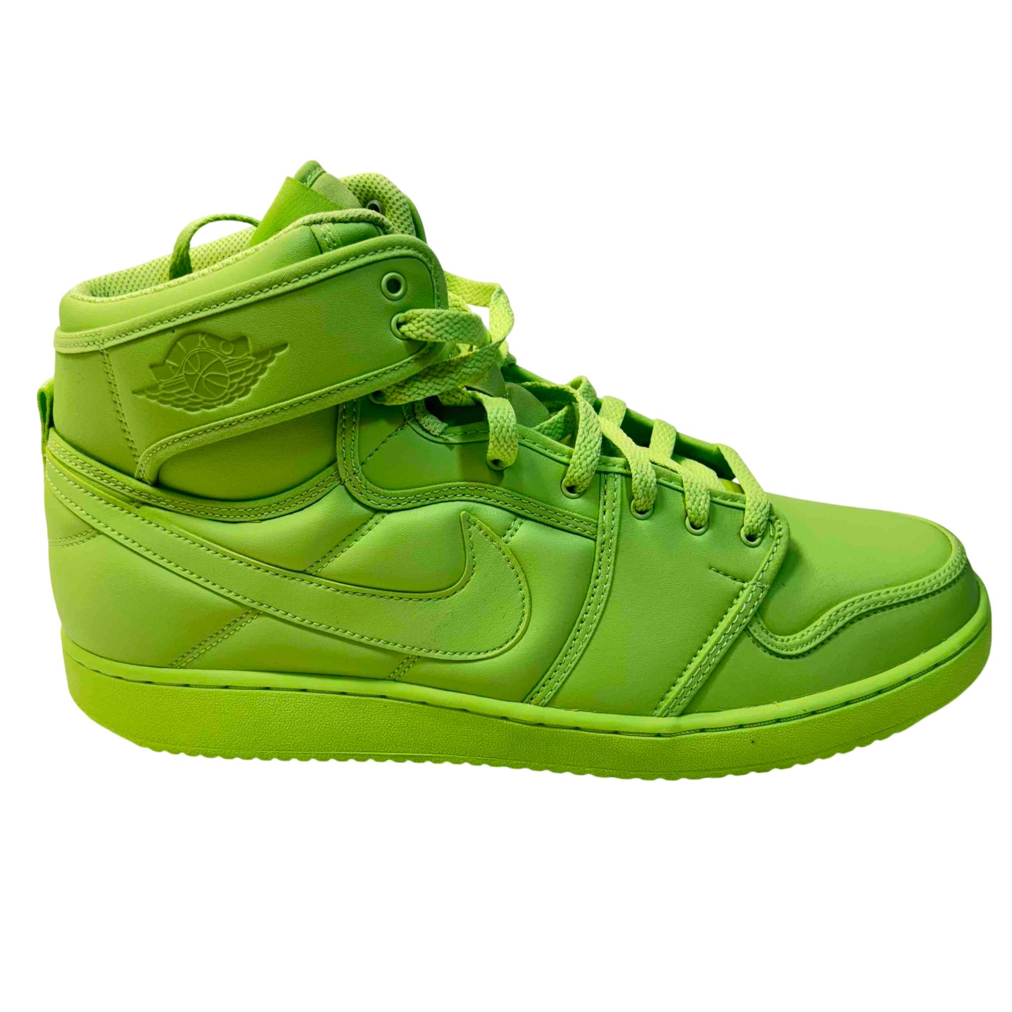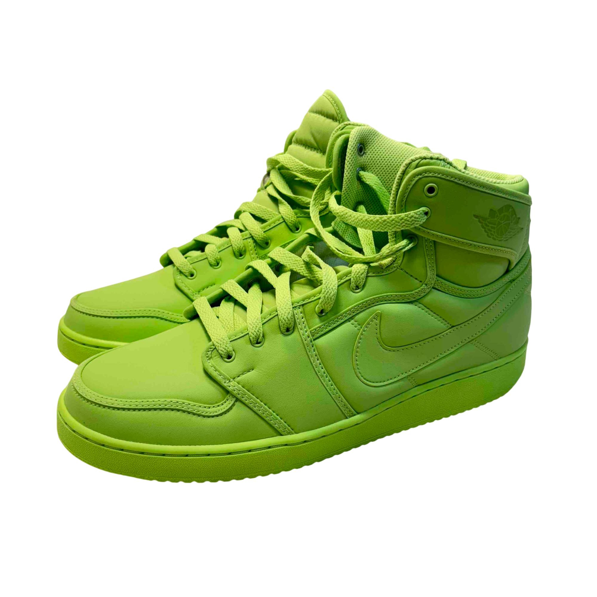 Billie Eilish x Nike Air Jordan 1 KO Ghost Green (DN2857-330) features a distinctive design with vibrant green leather and knitted fabric accents. This sneaker showcases a close-up view of detailed laces and textured surfaces, embodying outdoor and athletic footwear style with a bold, street-ready appearance optimized for running and casual wear.