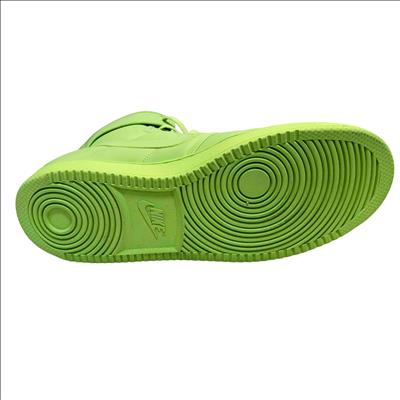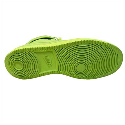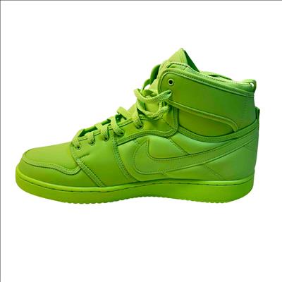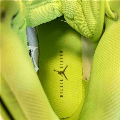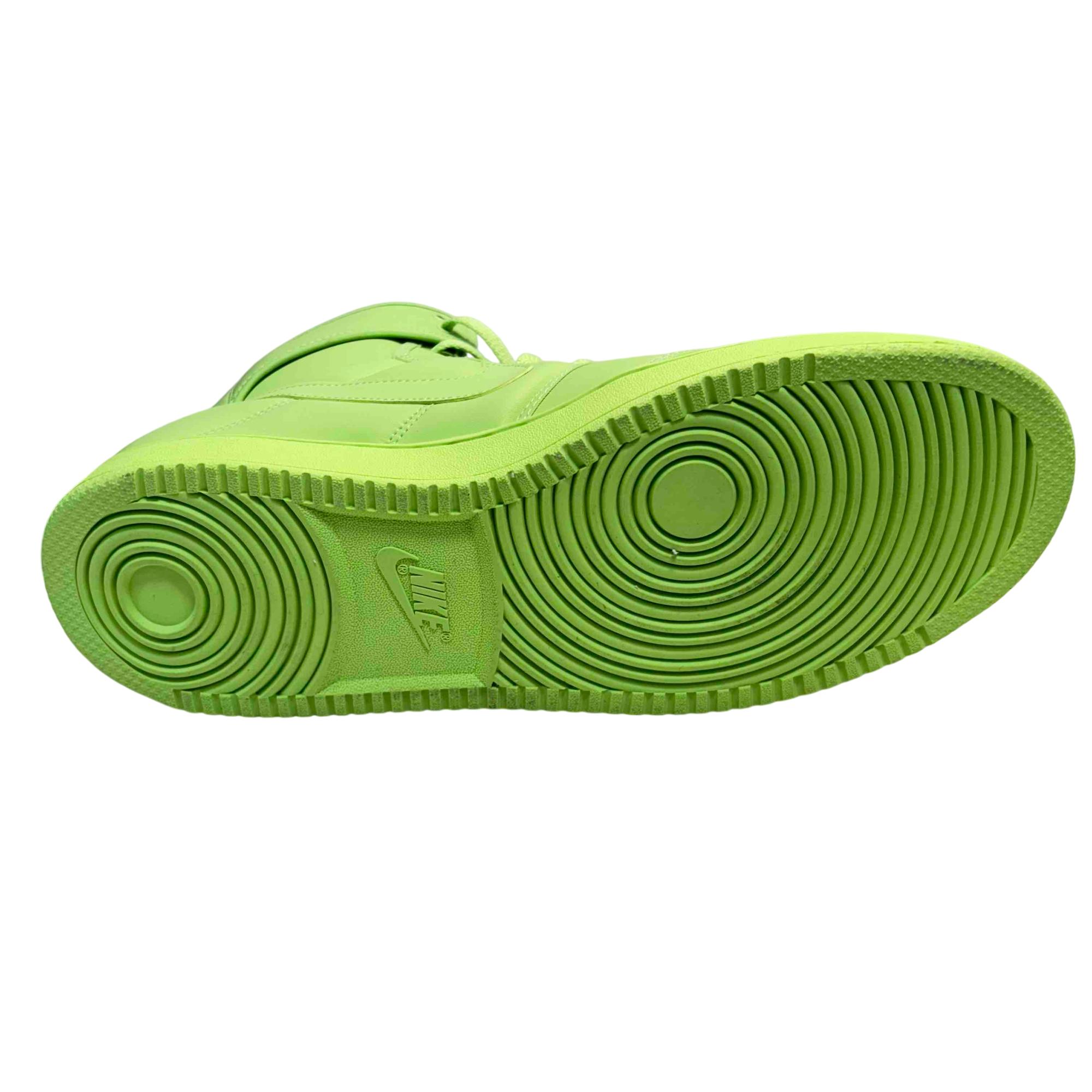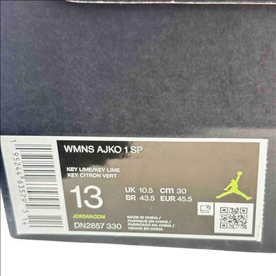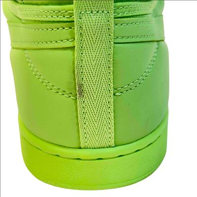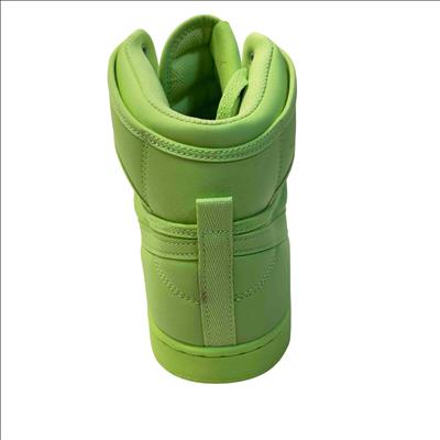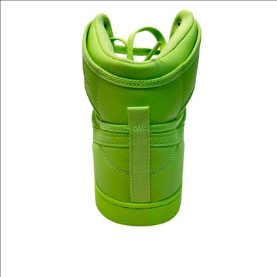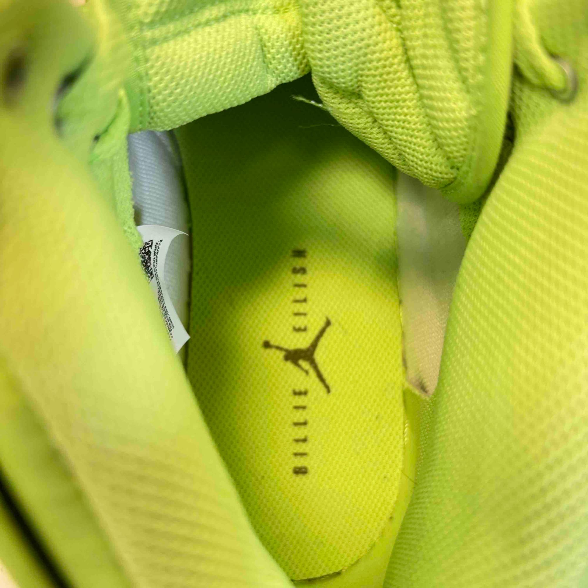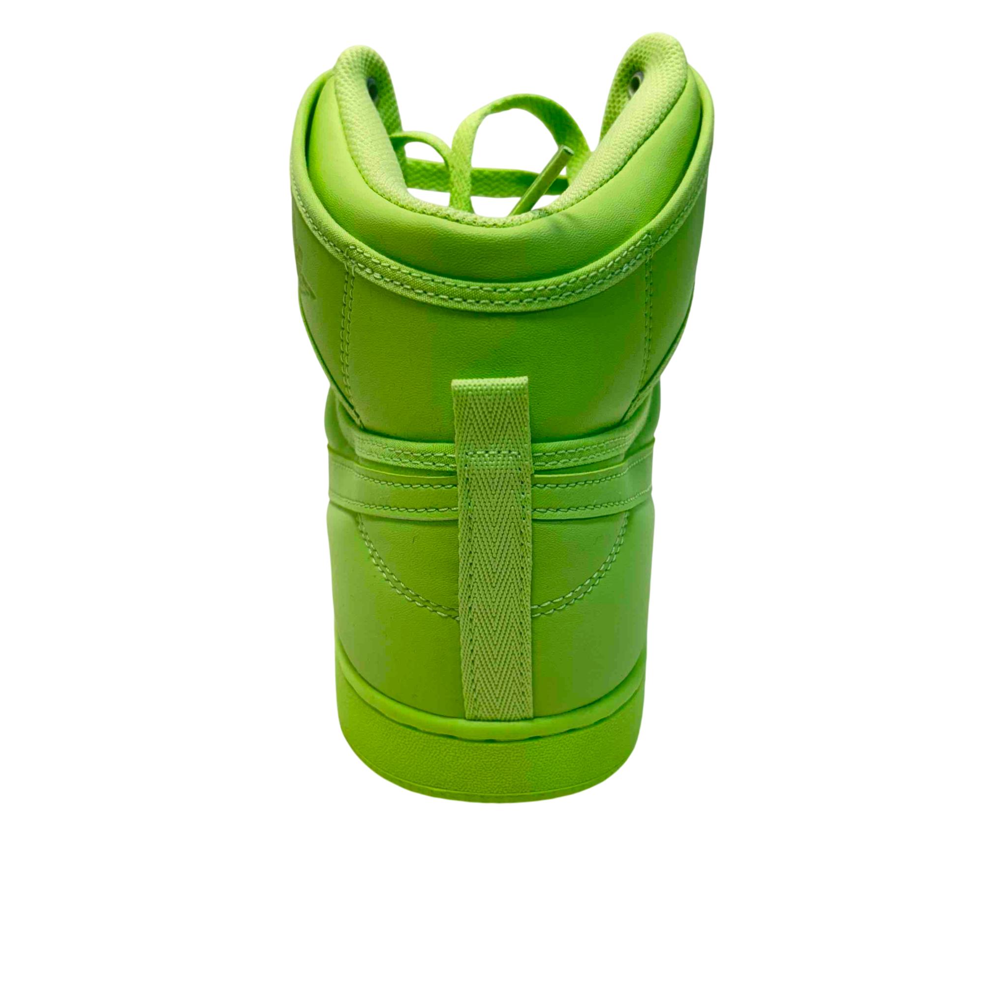 Billie Eilish x Nike Air Jordan 1 KO Ghost Green (DN2857-330) features a distinctive design with vibrant green leather and knitted fabric accents. This sneaker showcases a close-up view of detailed laces and textured surfaces, embodying outdoor and athletic footwear style with a bold, street-ready appearance optimized for running and casual wear.