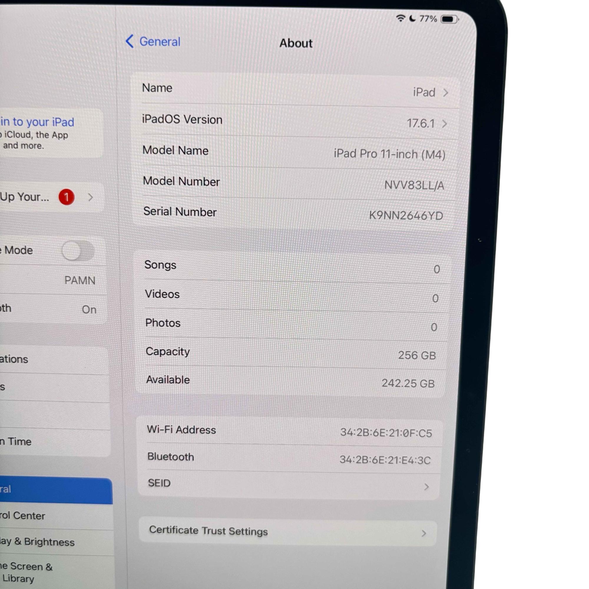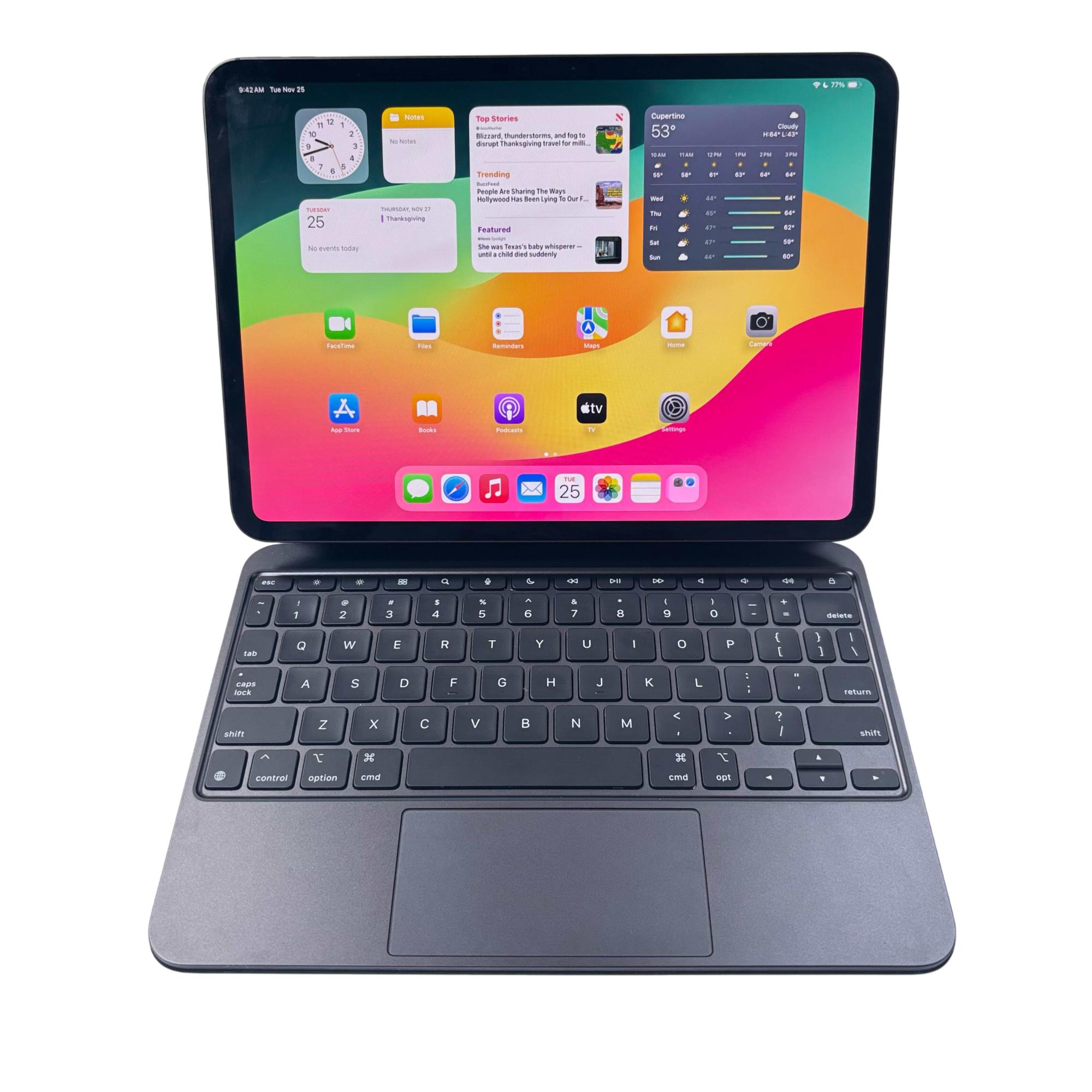 Features a 11-inch Ultra Retina XDR OLED display with a 2752 x 2064 resolution, ProMotion adaptive refresh rate, True Tone, and 1600 nits peak HDR brightness. Powered by the M4 chip with a 9-core CPU, 10-core GPU, and 16-core Neural Engine, it includes 8GB of RAM and 256GB of storage for demanding creative and professional tasks. The system supports Thunderbolt 3/USB-C connectivity up to 40 Gb/s for 6K external displays and high-speed storage, alongside Wi-Fi 6E, Bluetooth 5.3, and 5G LTE cellular options. It is equipped with 12MP front and rear ultra-wide cameras, a LiDAR scanner for AR applications, and four microphones with a four-speaker Dolby Atmos audio system. The front camera is landscape-positioned with Center Stage for video calls, and the rear camera supports 4K ProRes recording.