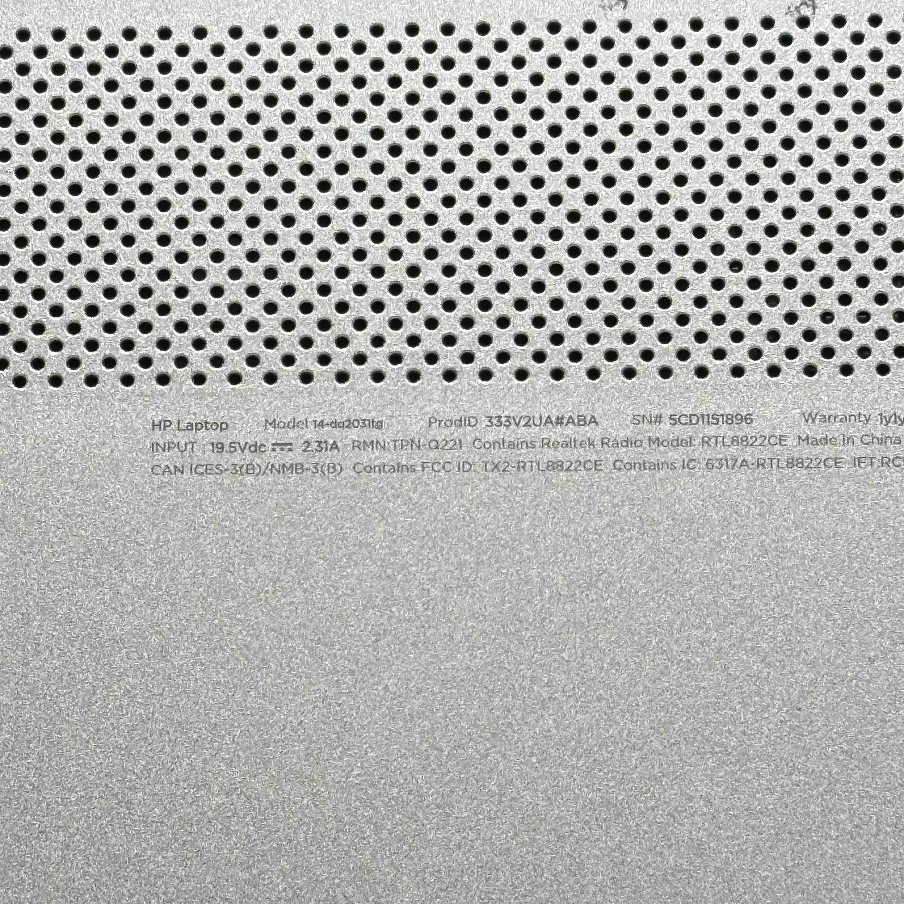 The HP Laptop 14-dqzozita features a sleek silver chassis and a 14-inch display, designed for reliable everyday computing. It is equipped with a Realtek RTL8822CE wireless module and supports efficient power input at 19.5Vdc and 2.31A, making it suitable for both work and entertainment tasks.