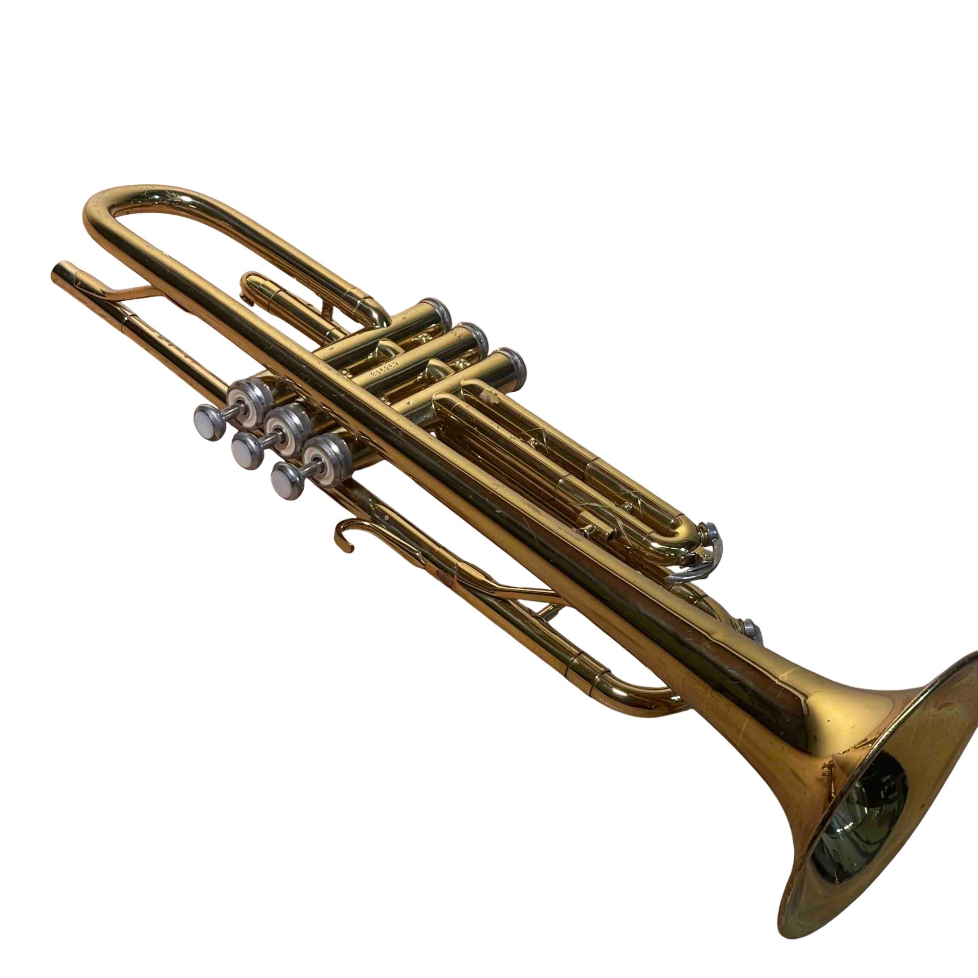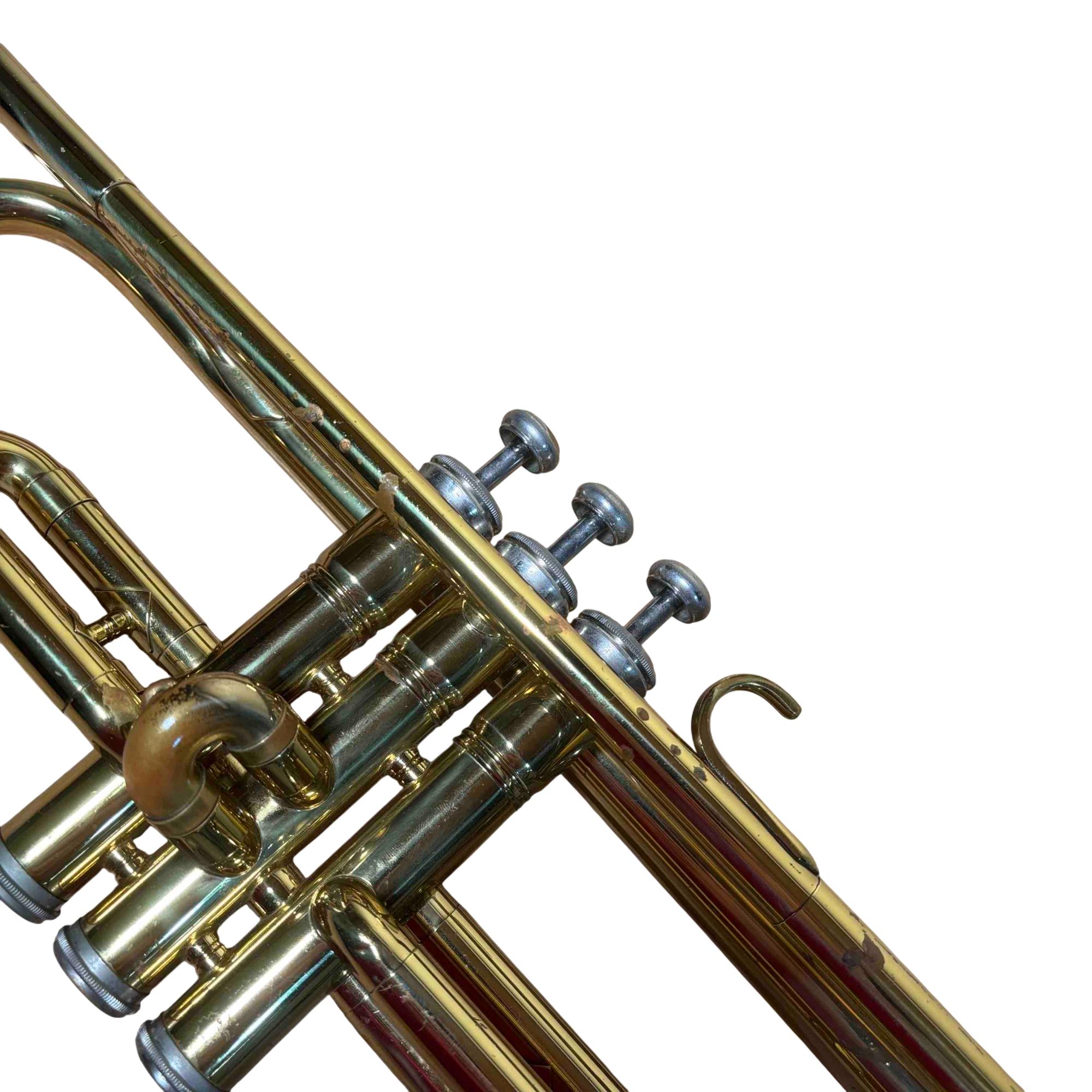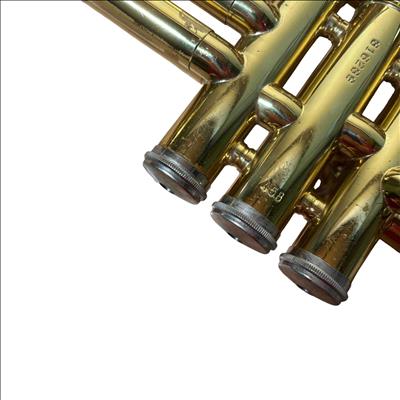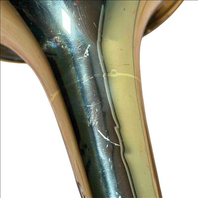 This trumpet was previously owned and shows signs of normal use. It is in fair condition. It has been tested and works. There is rust on the right top side of the trumpet.