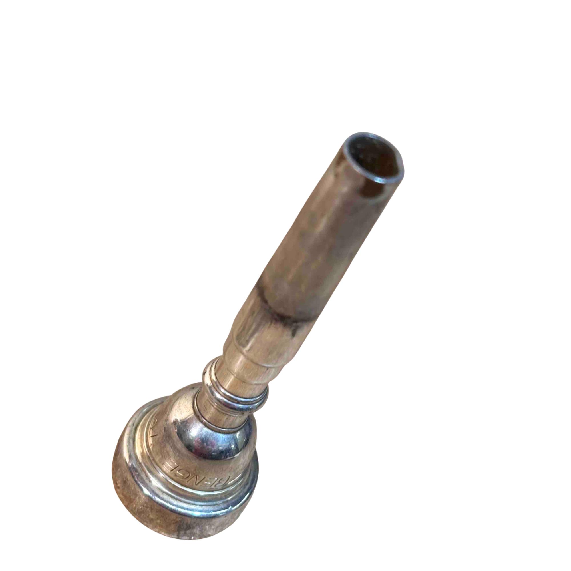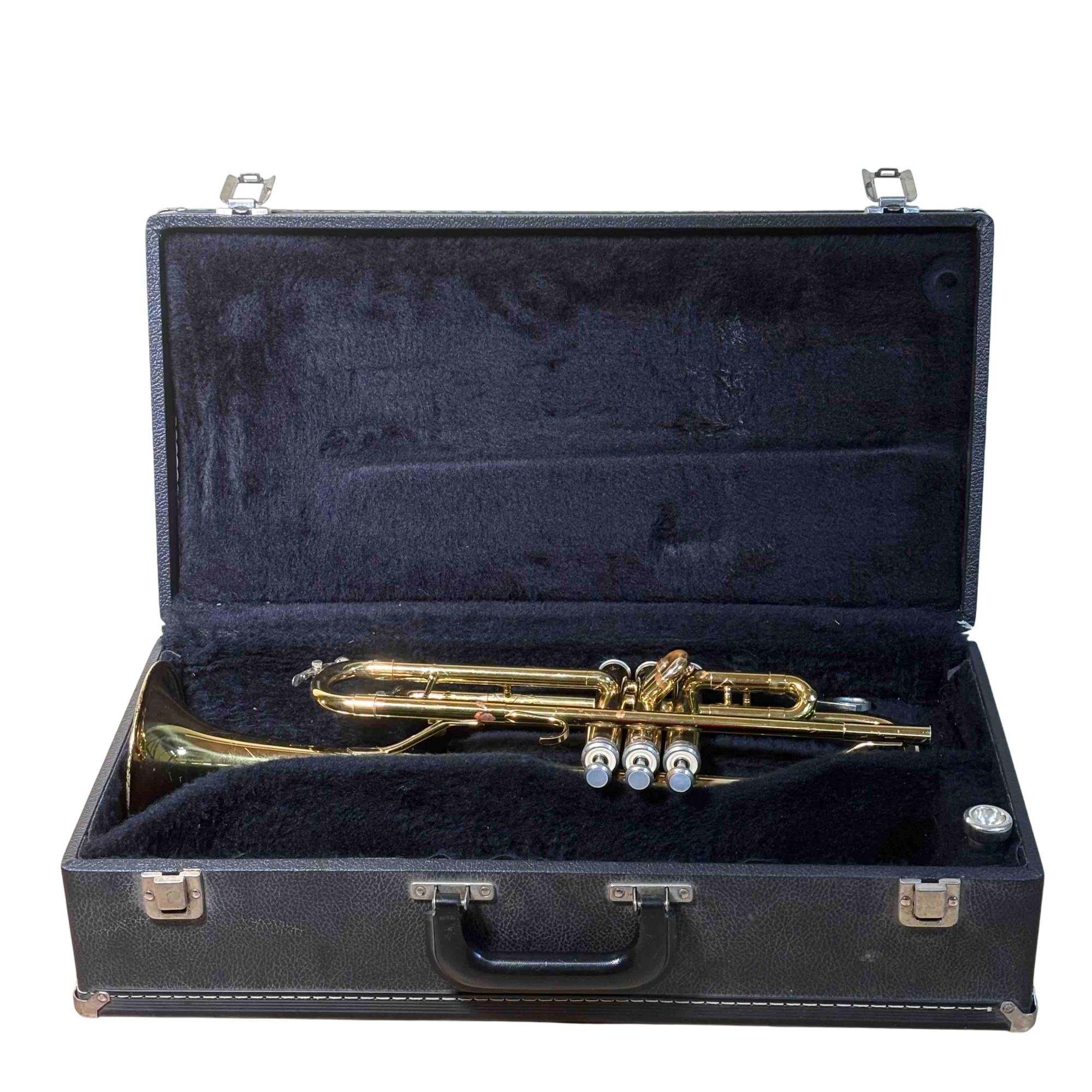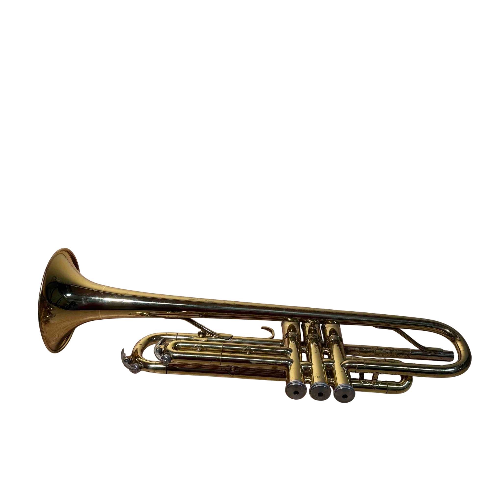 This trumpet was previously owned and shows signs of normal use. It is in fair condition. It has been tested and works. There is rust on the right top side of the trumpet.