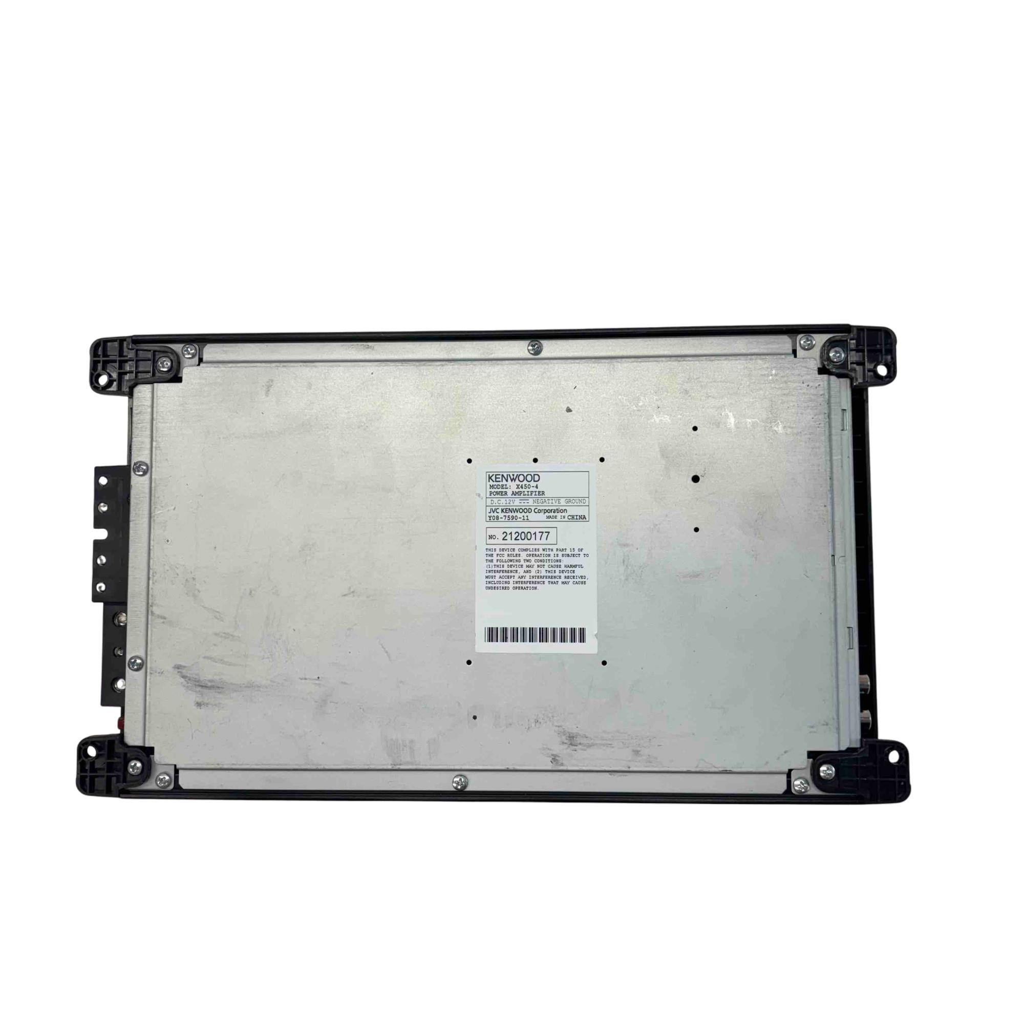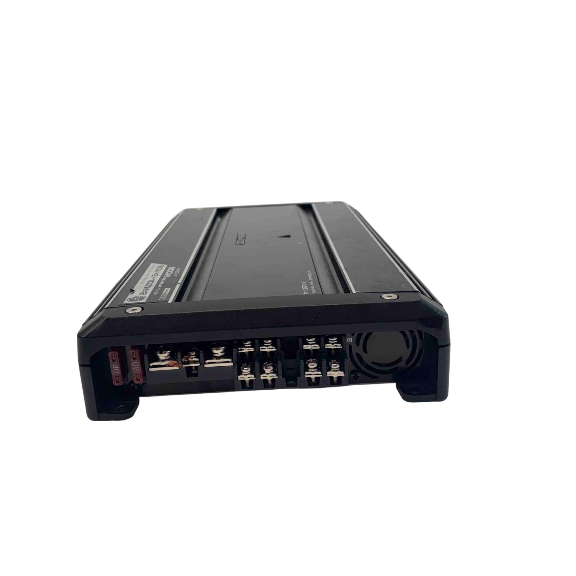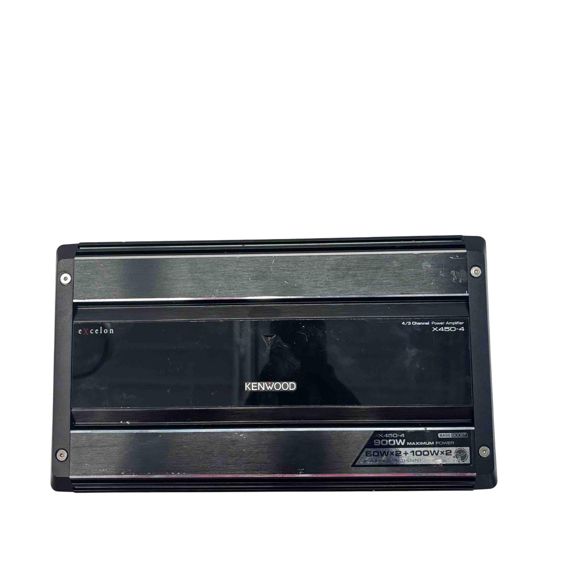 Kenwood Excelon X450-4 4/3 Channel Car Power Amplifier 900W delivers powerful audio performance with a maximum output of 900 watts, featuring 60 watts by 2 and 100 watts by 2 channels at 4 ohms. This amplifier supports bass boost functionality and is designed for high-fidelity sound in automotive audio systems, ensuring clear and dynamic audio reproduction.