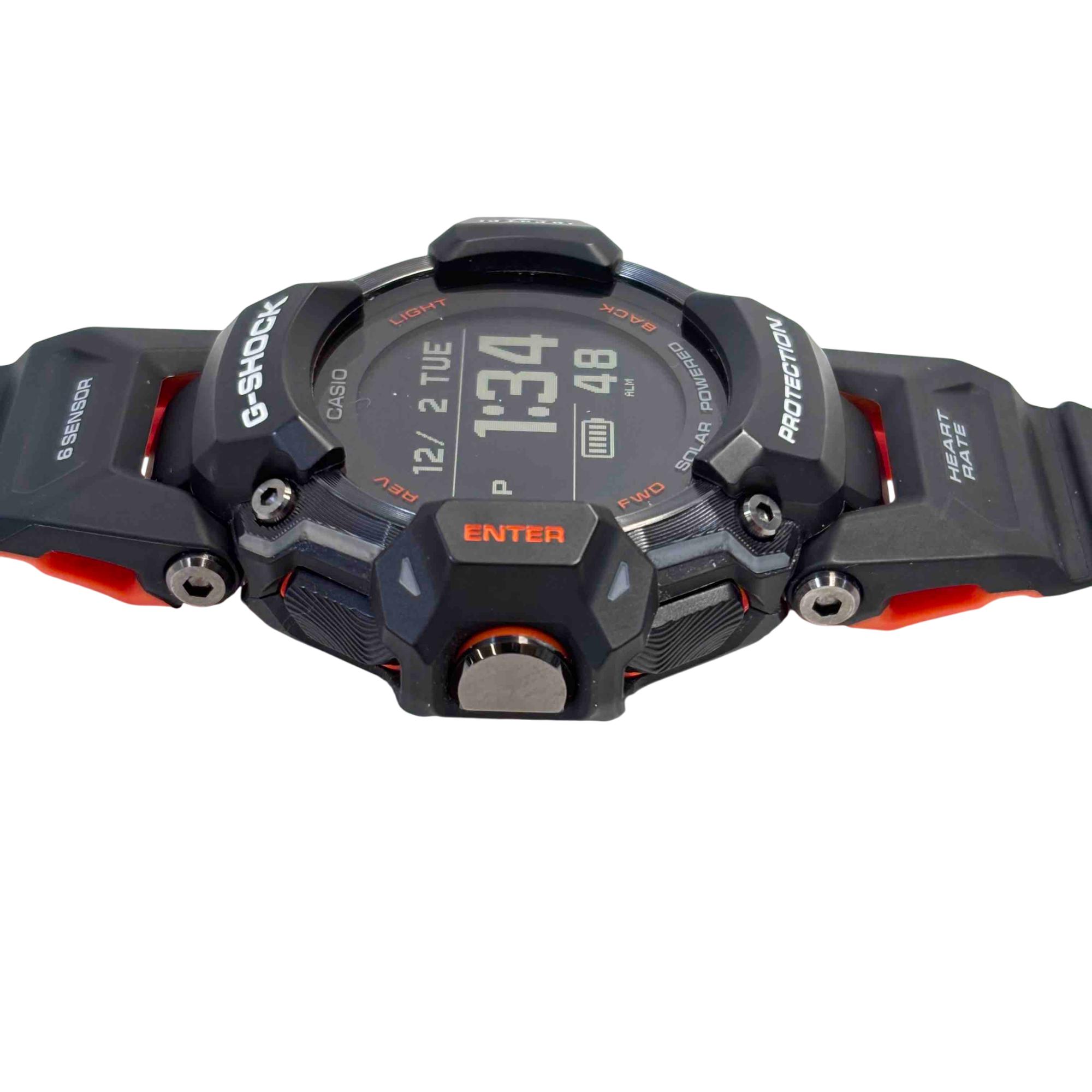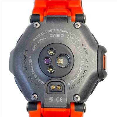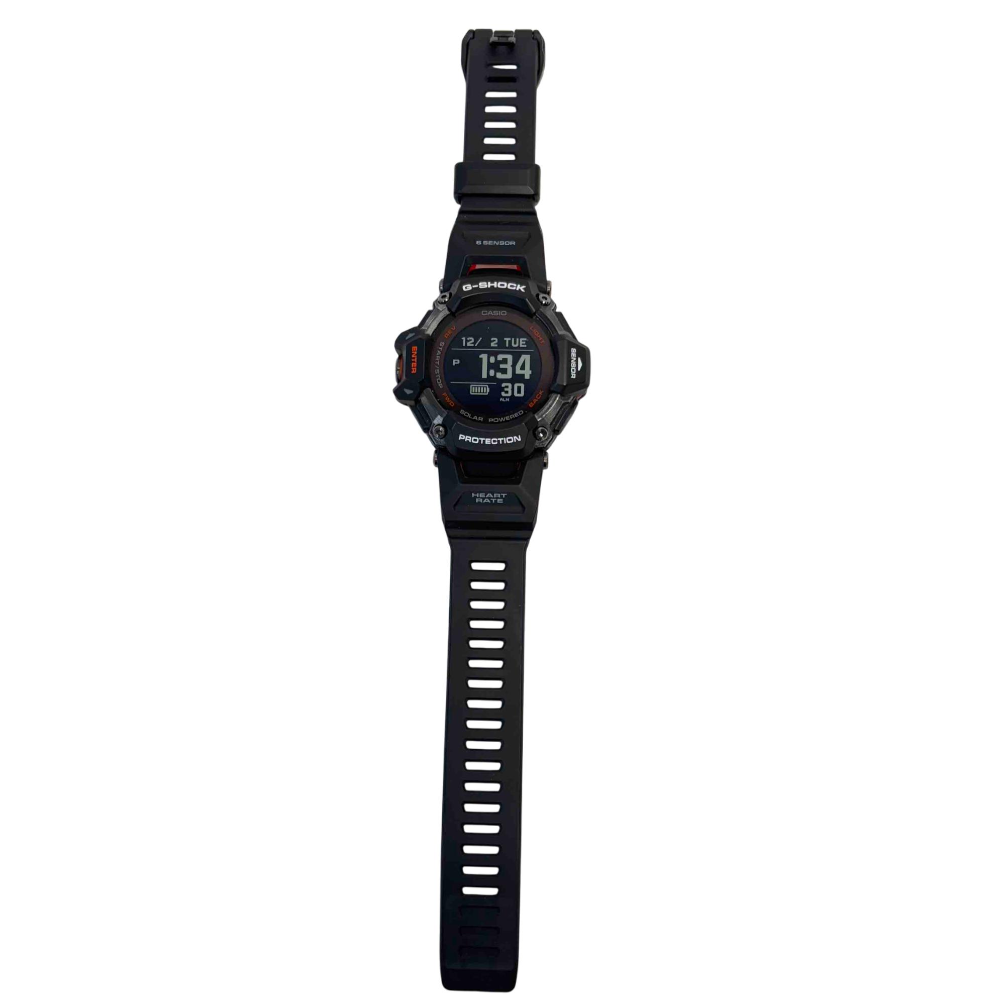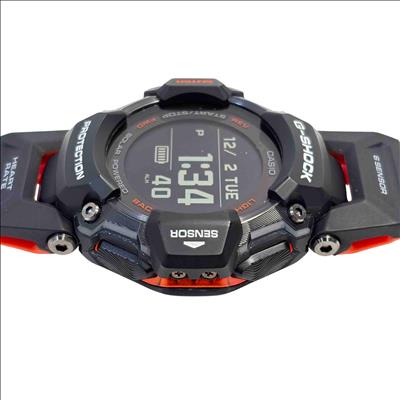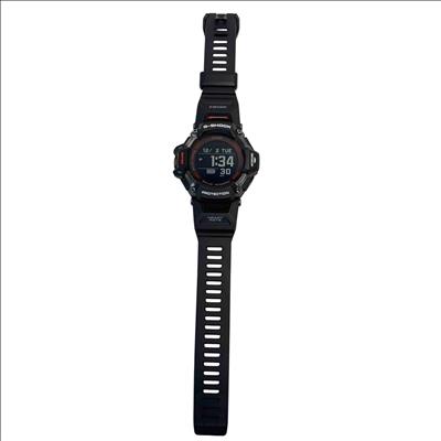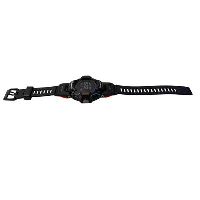 The Casio G-Shock Move GBD-H2000-1A Black Solar-Powered Bluetooth GPS Sport Watch features a durable black metallic case with red accents on the digital dial. Designed for multisport activities, it includes advanced sensors and GPS functionality to monitor performance and heart rate. This rugged watch combines solar-powered technology with Bluetooth connectivity for enhanced fitness tracking and outdoor use.