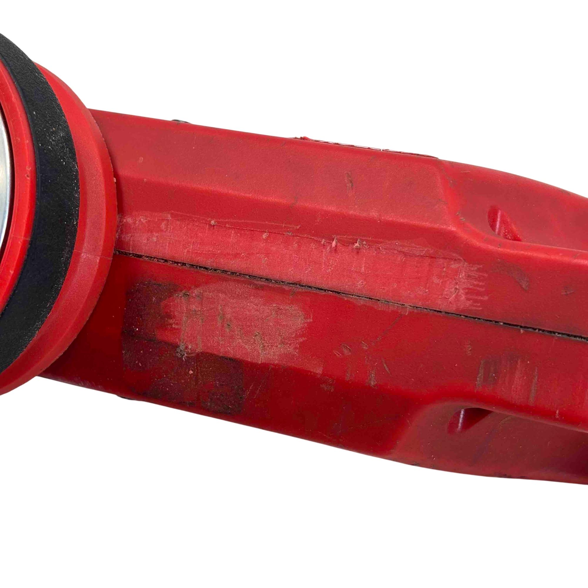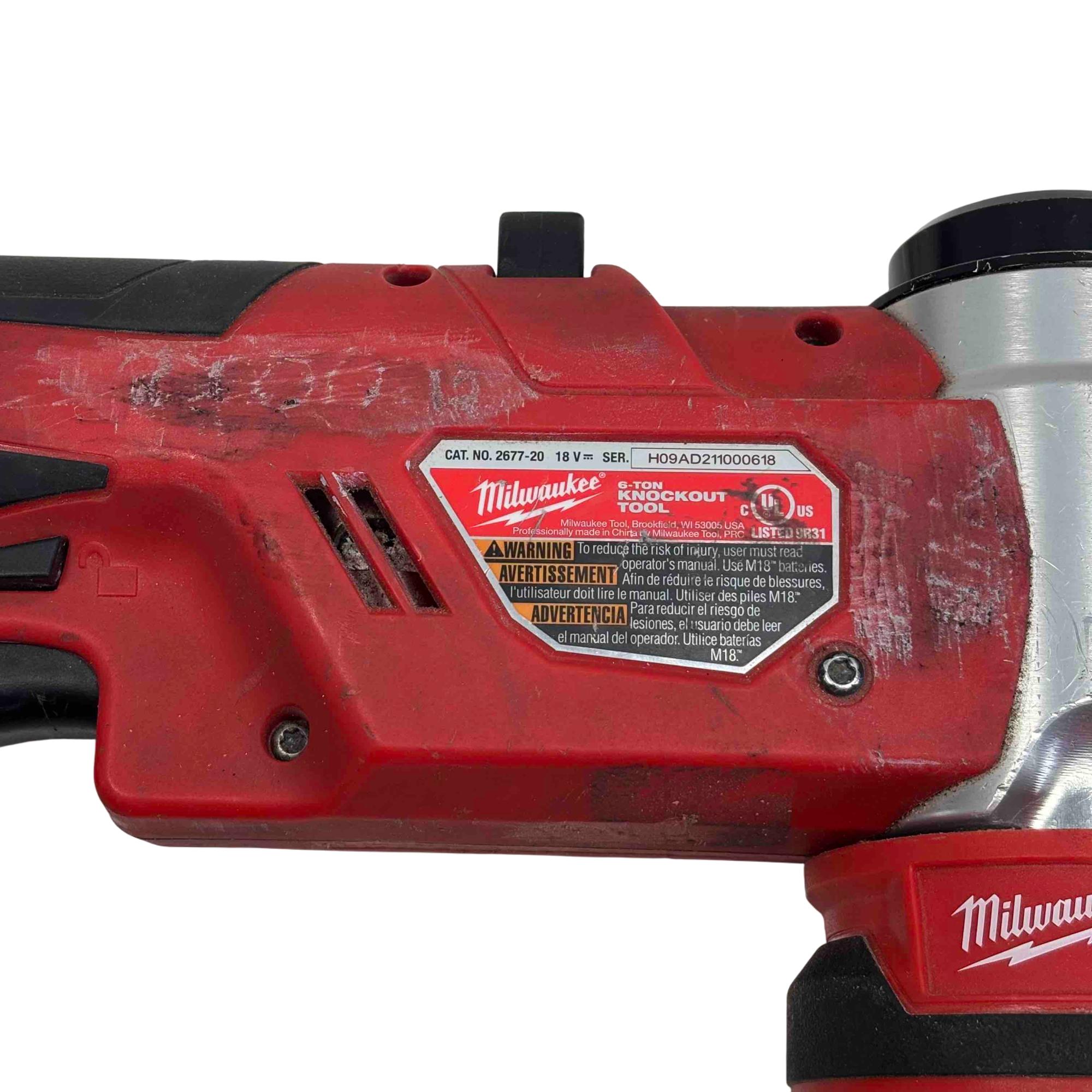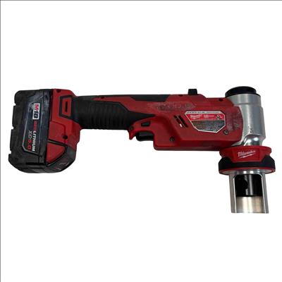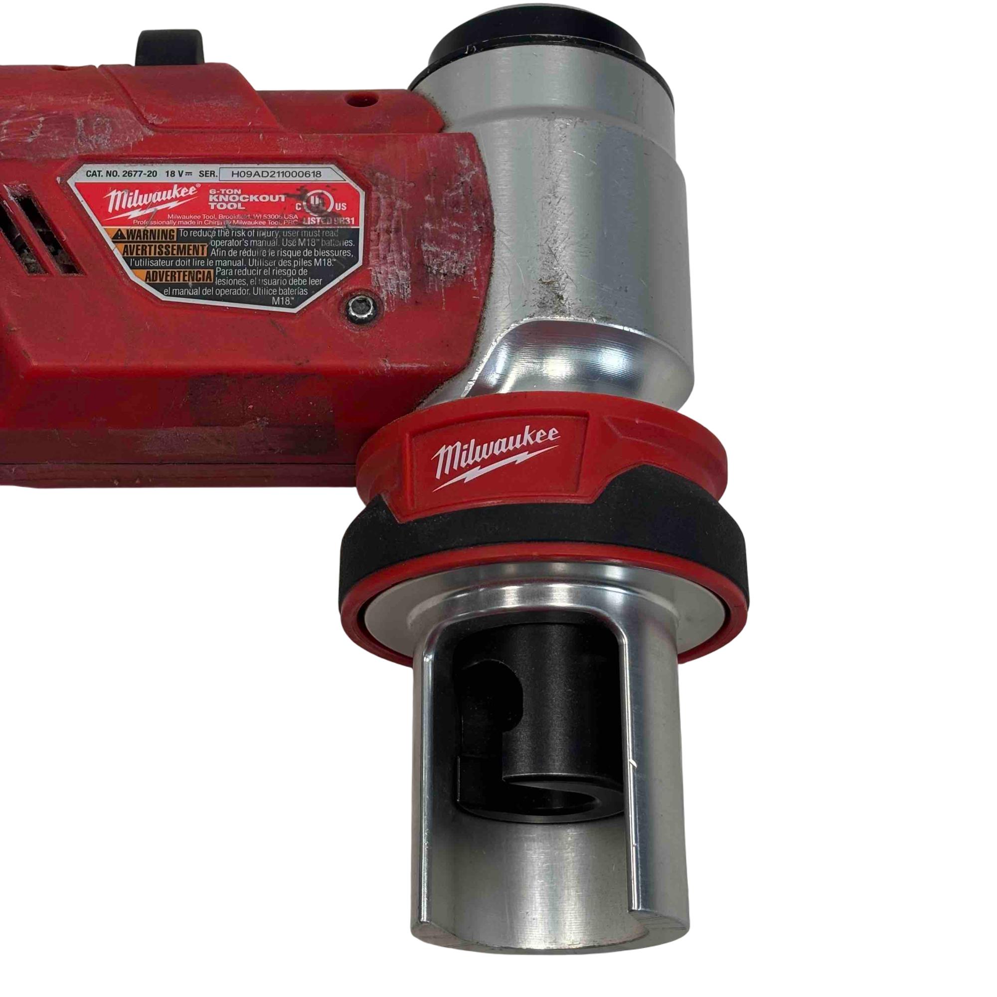 The Milwaukee 2677-20 M18 FORCE LOGIC 6T Knockout Tool delivers powerful 6-ton force for precise punching of holes ranging from 1/2 inch to 4 inches in diameter. Designed with a compact, ergonomic red and black casing, this cordless knockout punch tool offers superior performance for electricians and tradespeople requiring efficient metal conduit work. Its robust construction and advanced lithium-ion battery system ensure reliable power and durability on the job site.