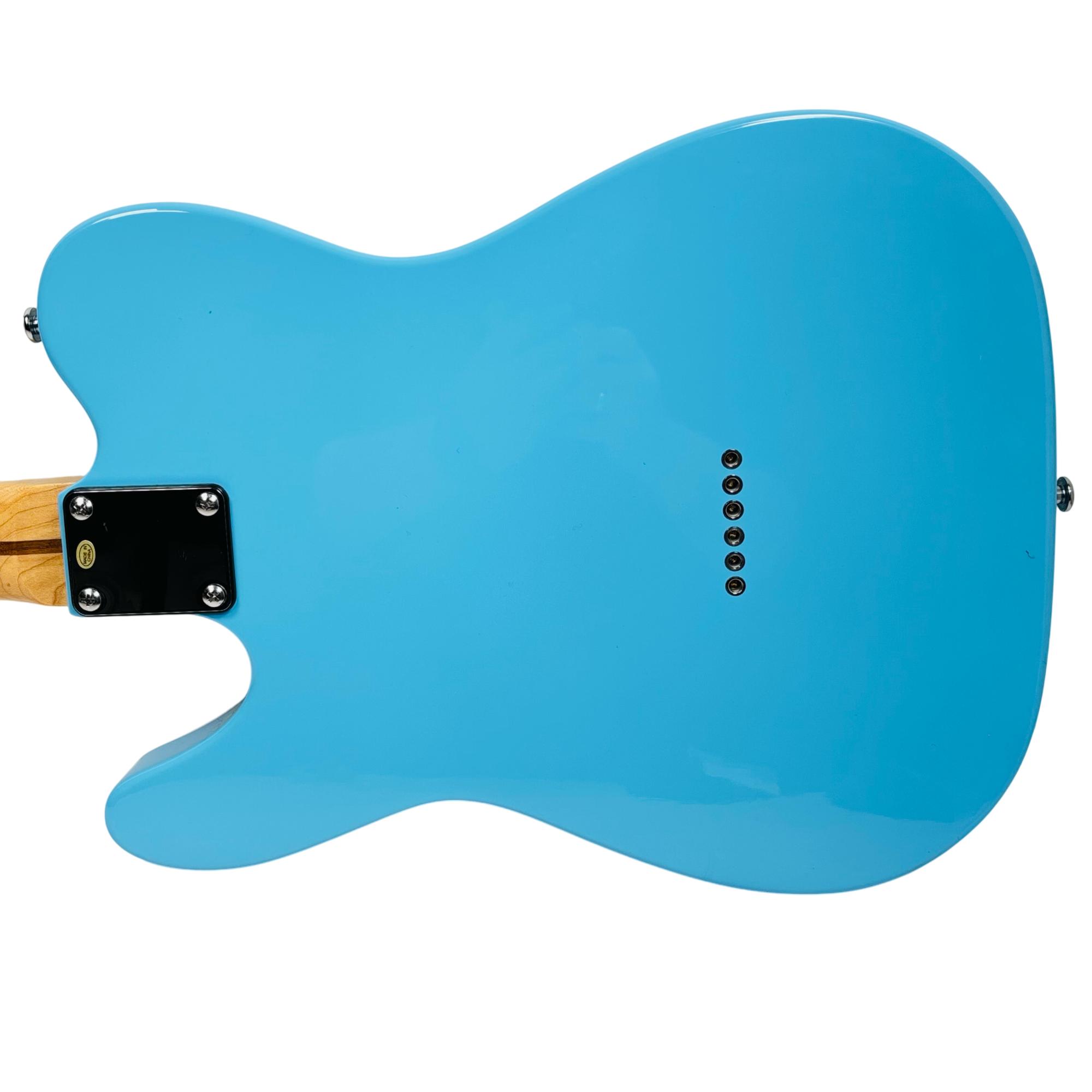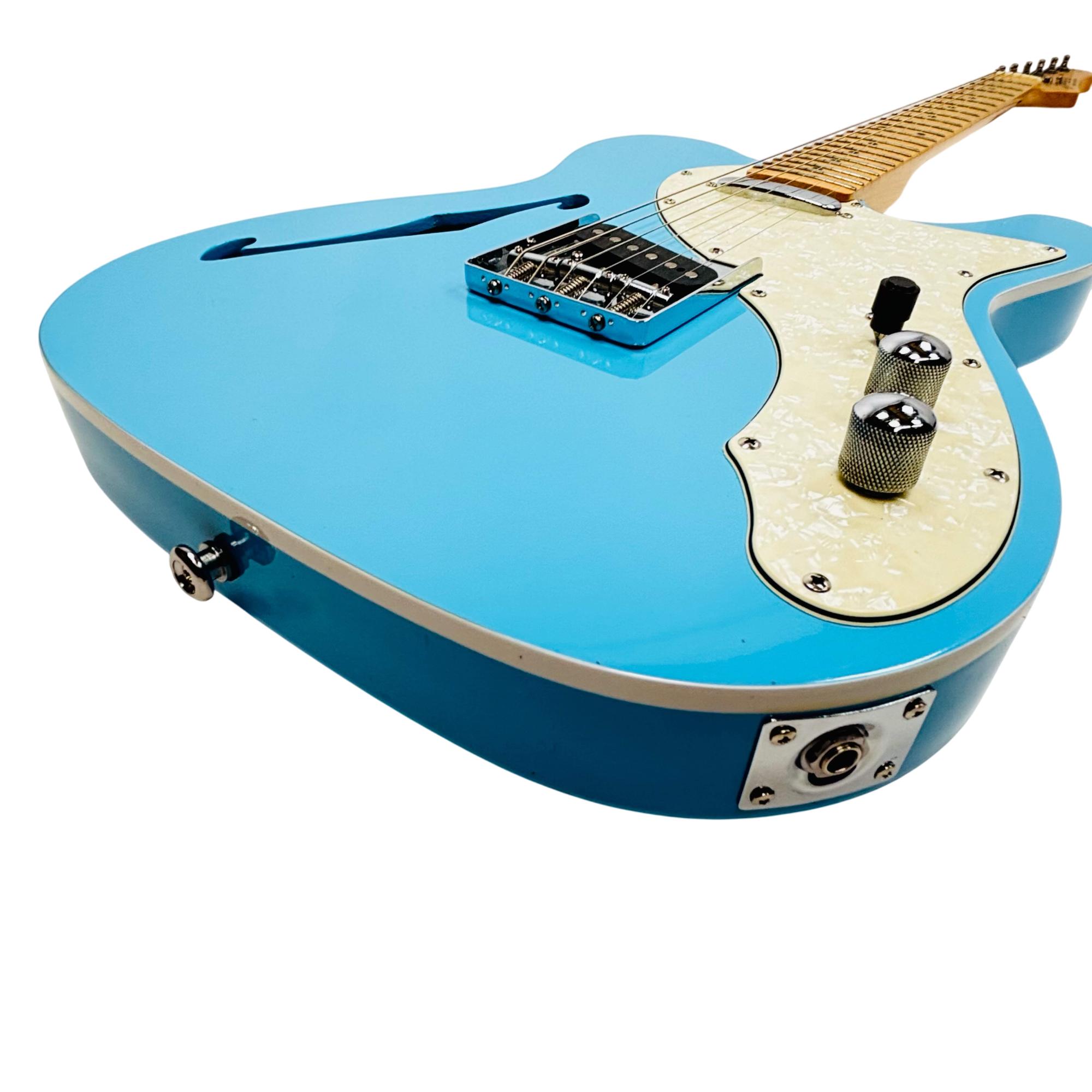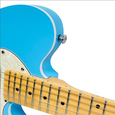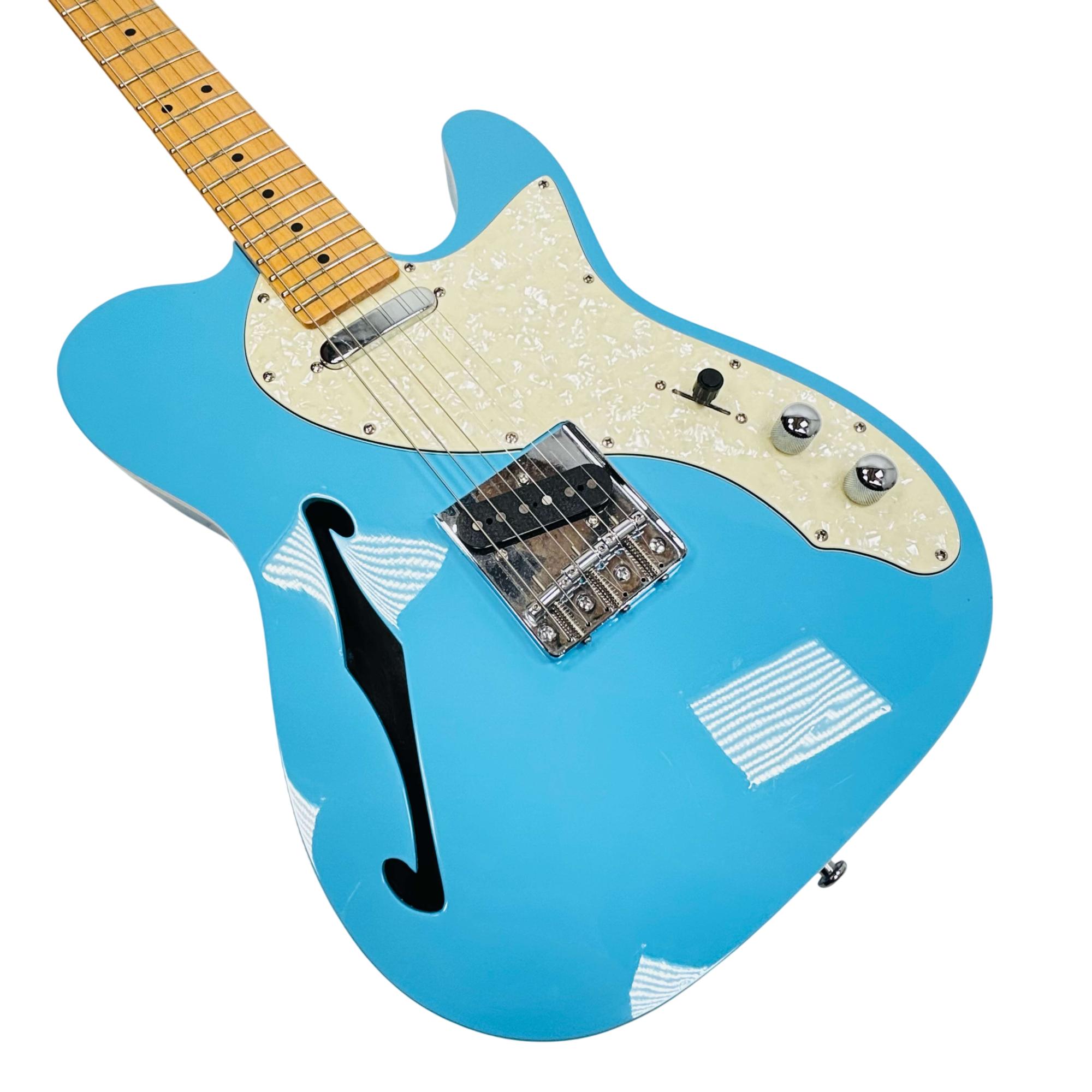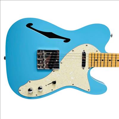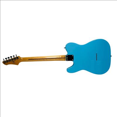 Firefly FFTH Pure Series T-Style electric guitar features a striking blue finish with a contrasting white pickguard, showcasing a classic design favored by musicians. This electric guitar is crafted with precision, highlighting a detailed fretboard and high-quality metal components ideal for versatile playing styles. Its sleek construction and vibrant appearance make it an excellent choice for both beginners and seasoned guitarists seeking performance and style.