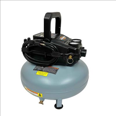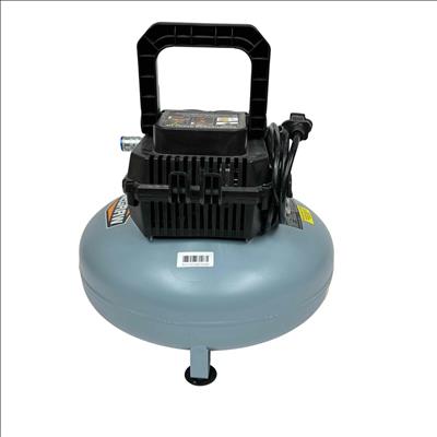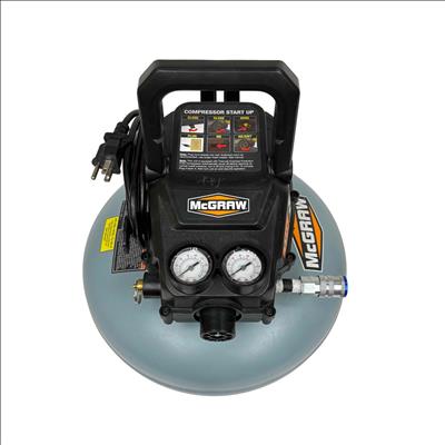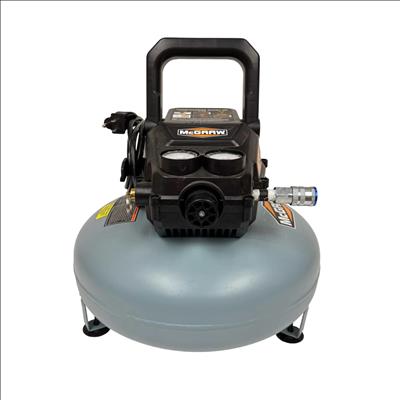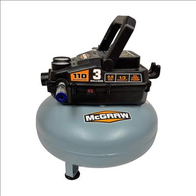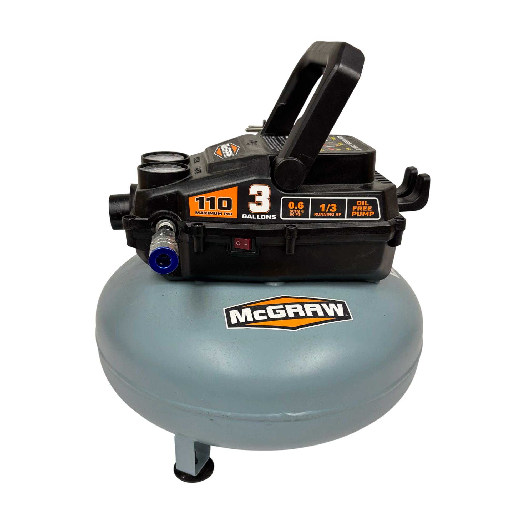 The McGRAW 3 Gallon 1/3 HP 110 PSI Oil-Free Pancake Air Compressor features a compact design with a durable grey cylinder and black handle, equipped with a top-mounted pressure gauge and dial for easy monitoring. This portable air compressor delivers an air flow of 0.6 SCFM at 90 PSI, operating at 120VAC and 60Hz, making it ideal for light-duty tasks in automotive and workshop settings. Its oil-free operation ensures low maintenance while providing reliable performance for inflating tires, powering air tools, and other compressed air needs.
