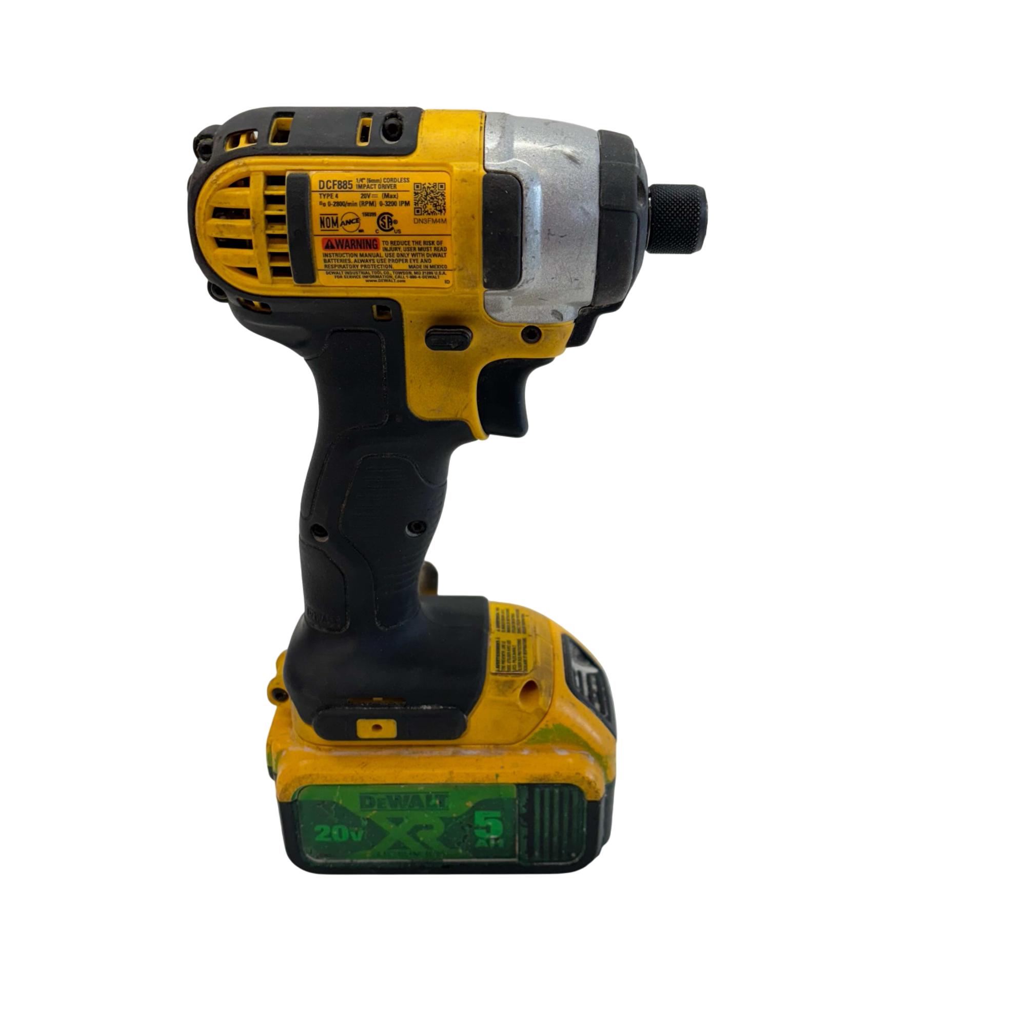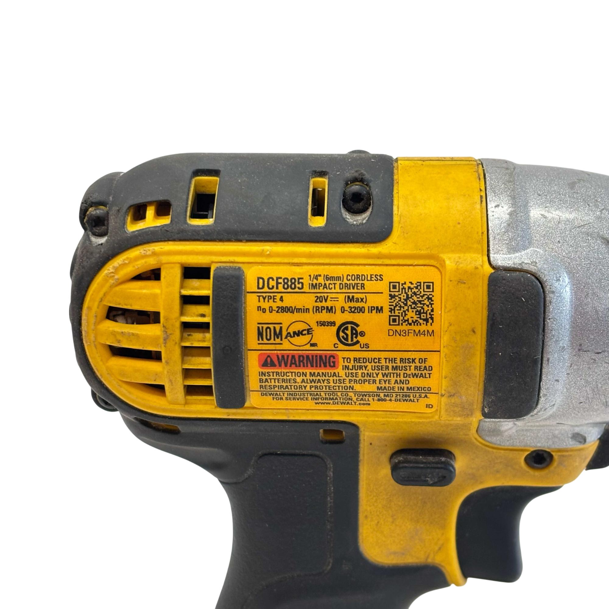 DeWalt DCF885 20V MAX 1/4" Cordless Impact Driver delivers powerful torque with a compact design ideal for fastening and drilling applications. Featuring a brushed motor capable of speeds up to 3200 IPM, it provides efficient performance for professional and DIY tasks. Its ergonomic black and yellow build ensures durability and comfort during extended use.