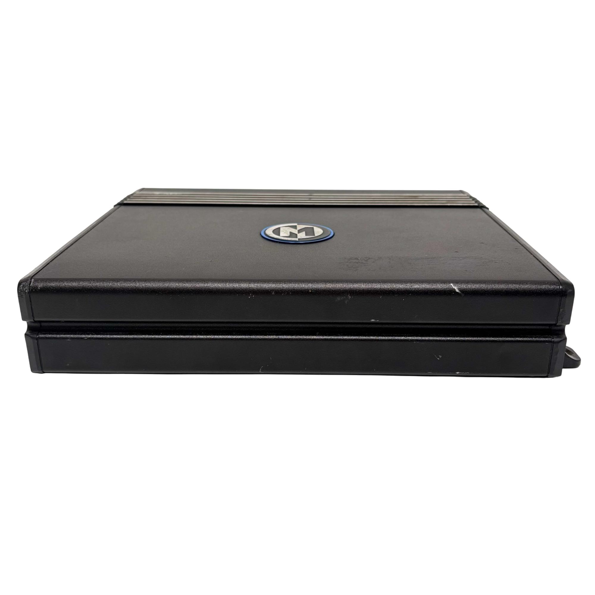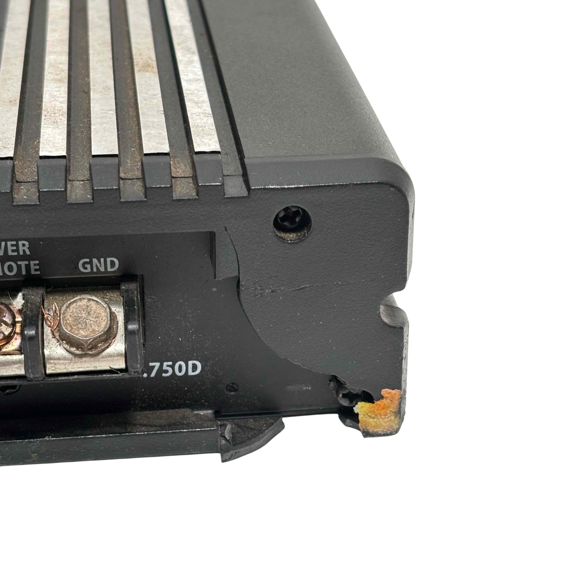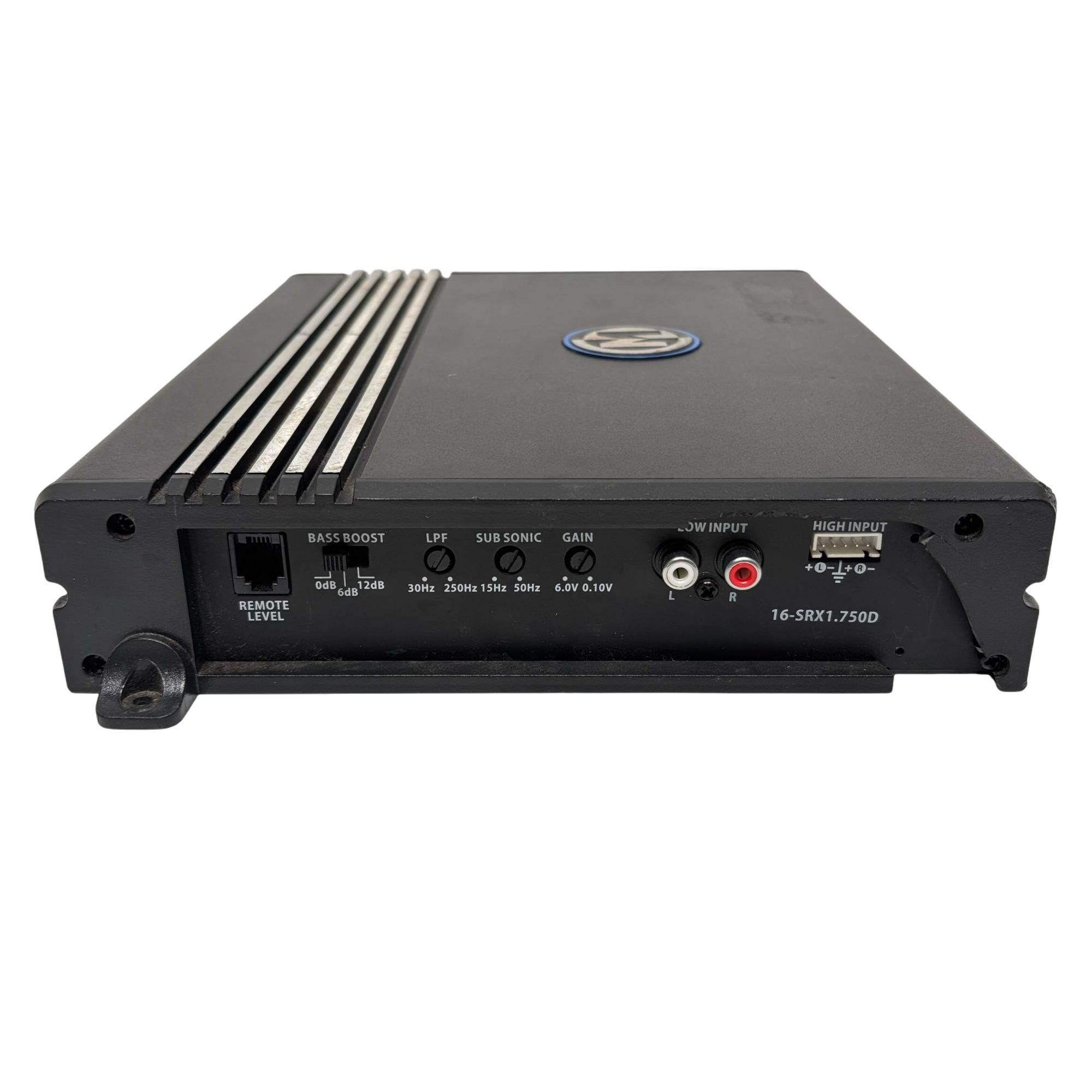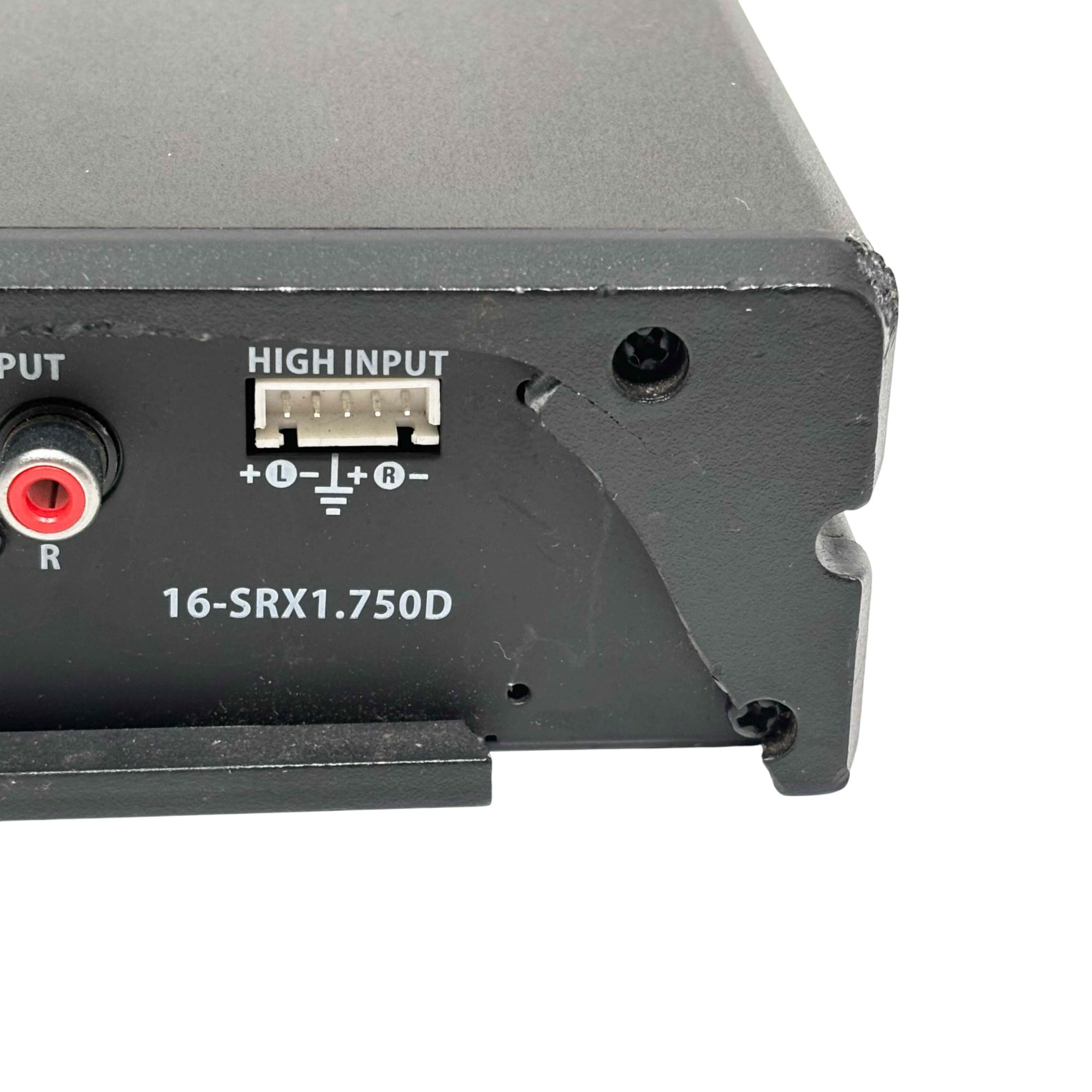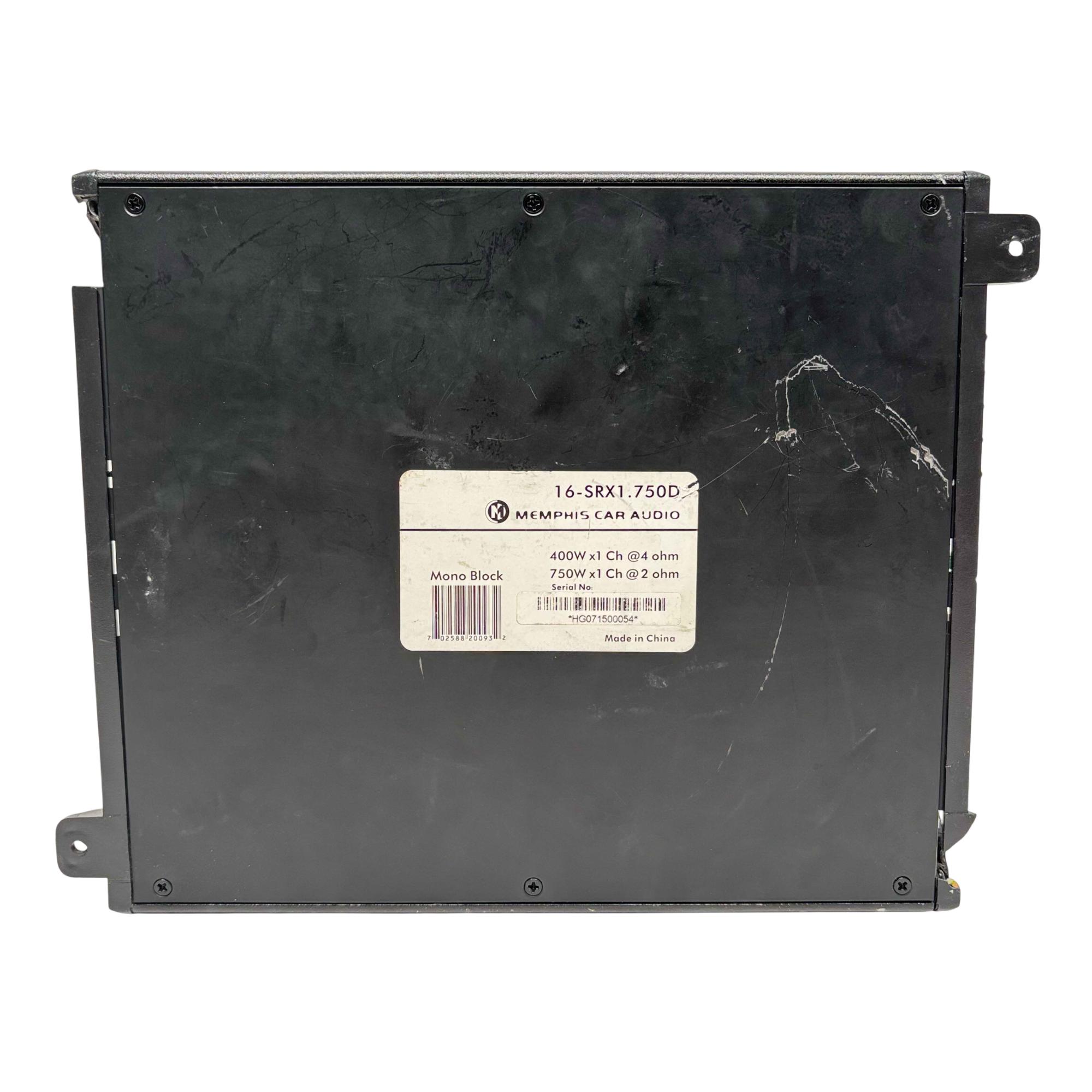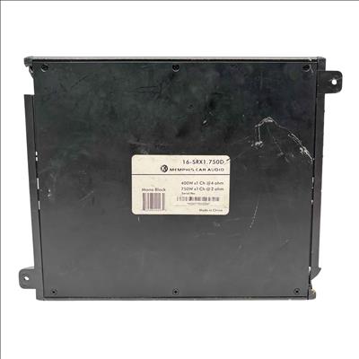 Memphis Car Audio 16-SRX1.750D Mono Block Amplifier 750W delivers powerful mono channel amplification with 400 watts at 4 ohms and 750 watts at 2 ohms, making it ideal for driving subwoofers in car audio systems. Featuring a compact black rectangular design with clear speaker output and power connection labels, this amplifier supports high input signals and offers reliable performance in automotive audio setups.