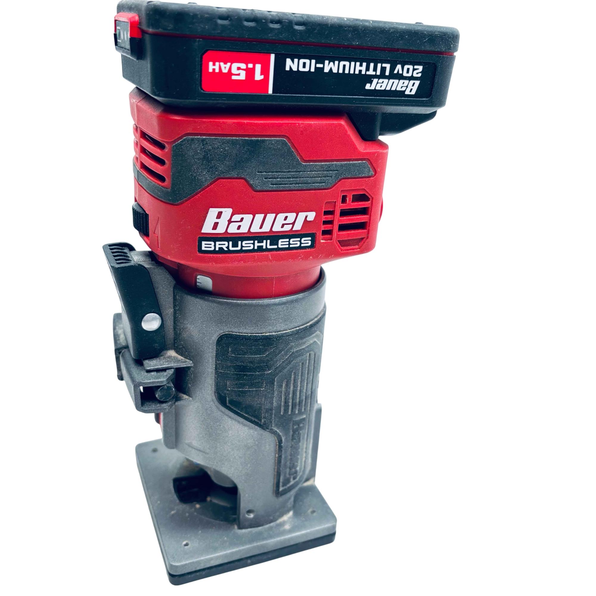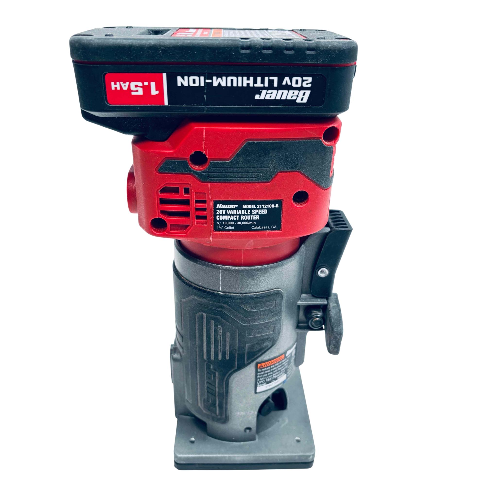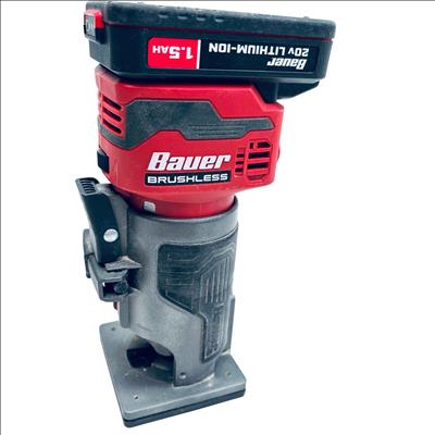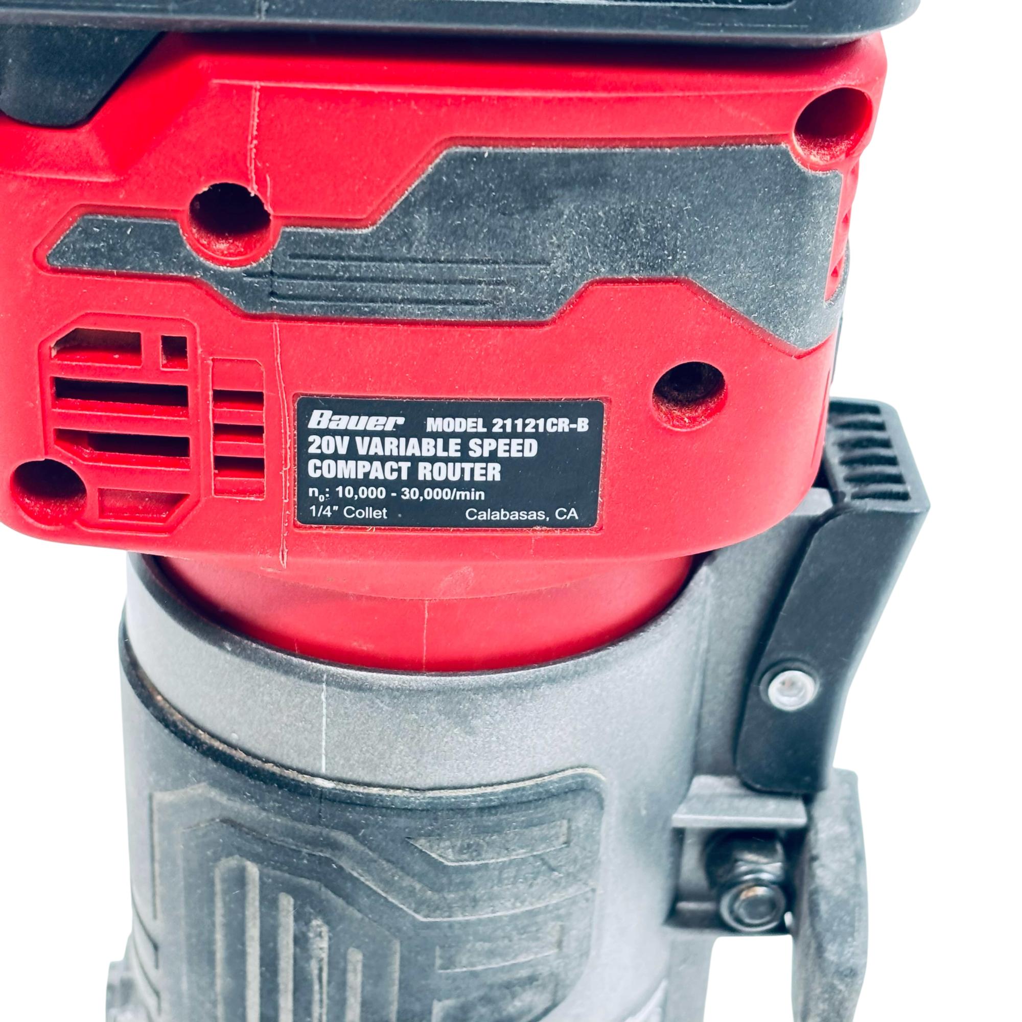 Bauer 20V Brushless Cordless Variable Speed Compact Router Model 21121CR-B offers versatile performance with a powerful brushless motor and variable speed control ranging from 10,000 to 30,000 RPM. This compact router features a 1/4 inch collet designed for precision and ease of use in woodworking and finishing tasks.
