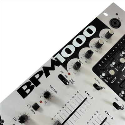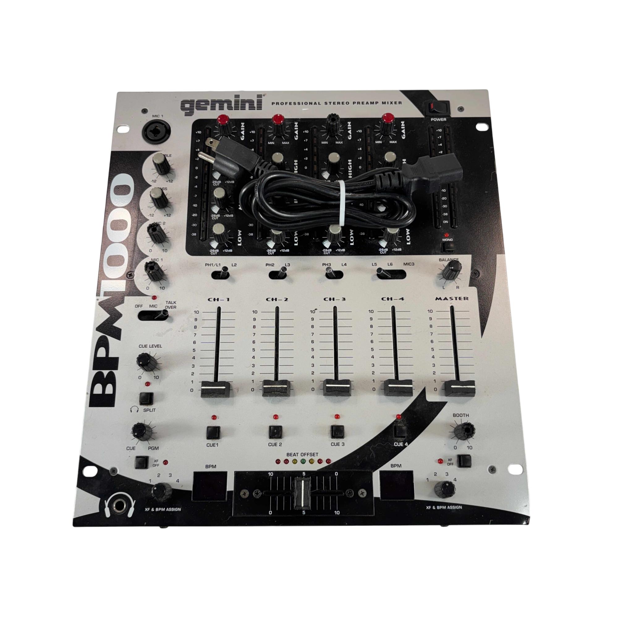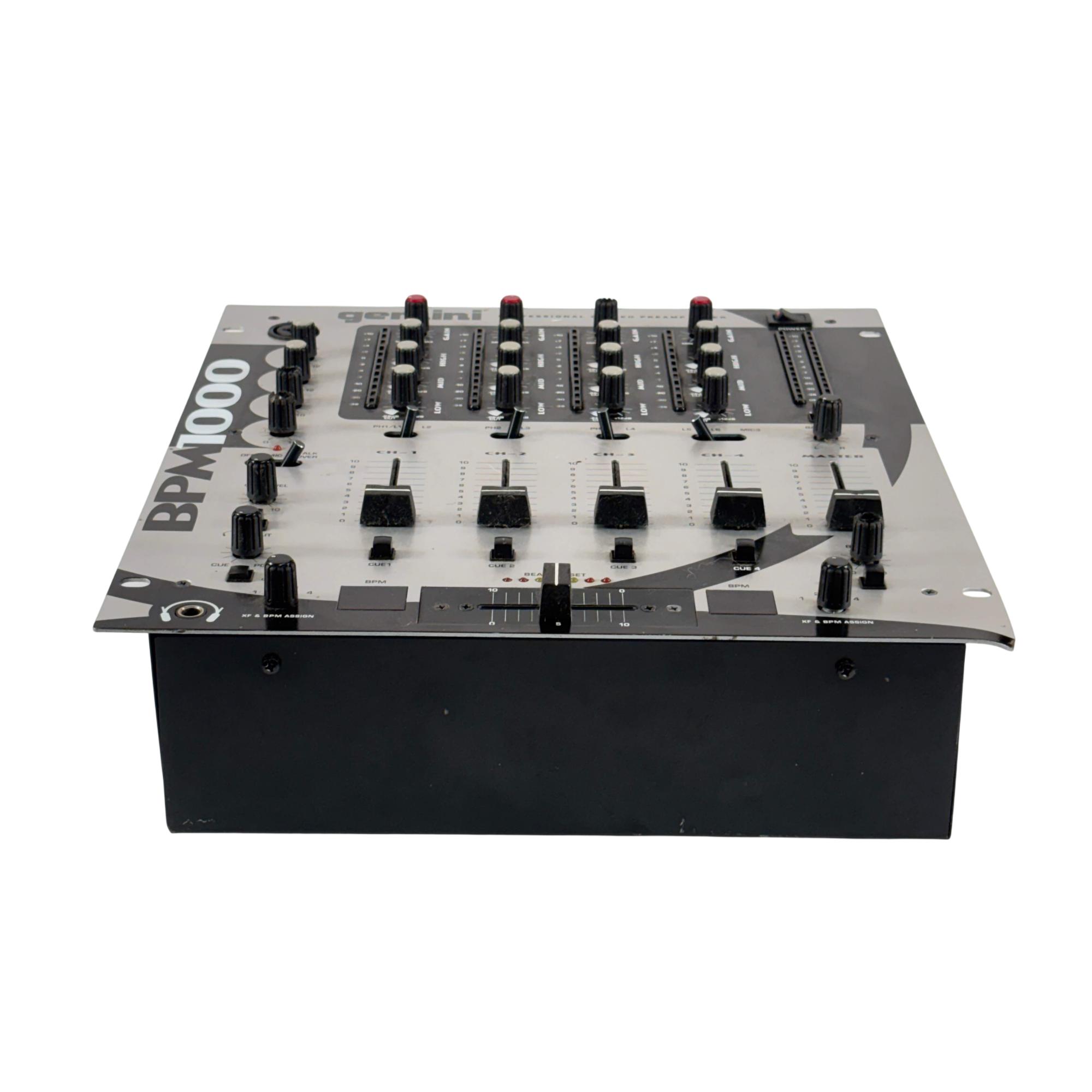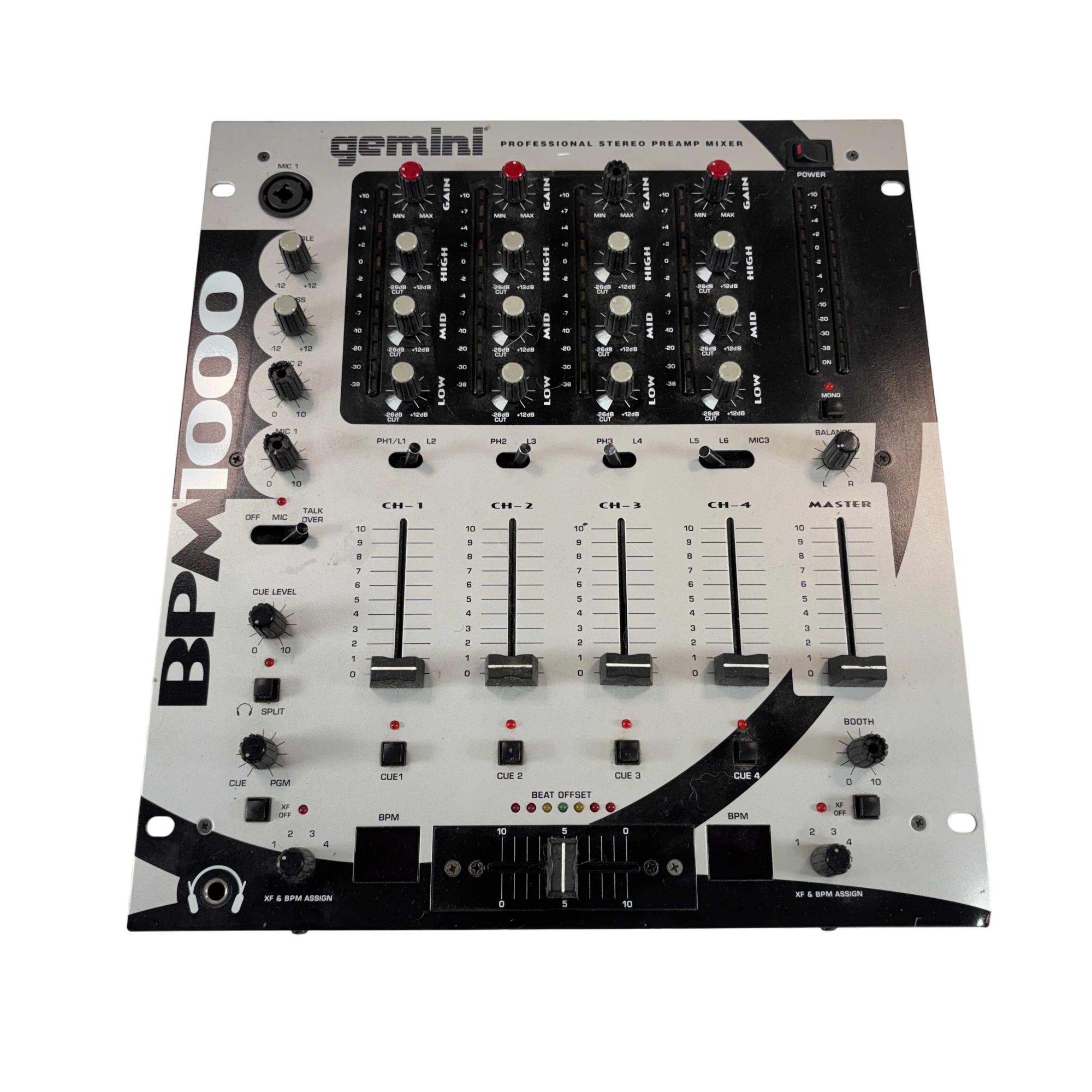 The Gemini BPM-1000 is a professional 4-channel stereo DJ mixer built for versatile setups, offering multiple phono, line, and mic inputs. It features BPM displays with beat offset indicators, detailed EQ control on each channel, and a removable, assignable crossfader. Balanced and unbalanced master outputs and clear level metering make it suitable for both live performance and booth use.