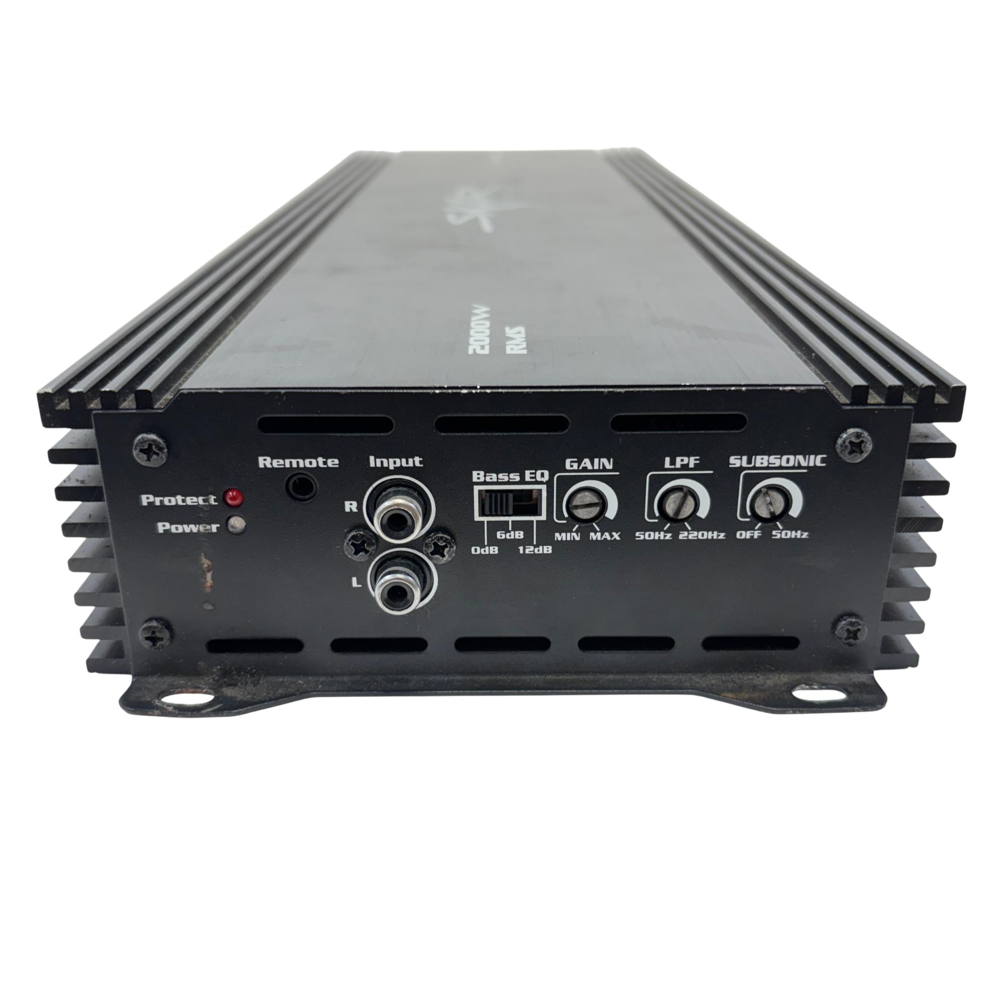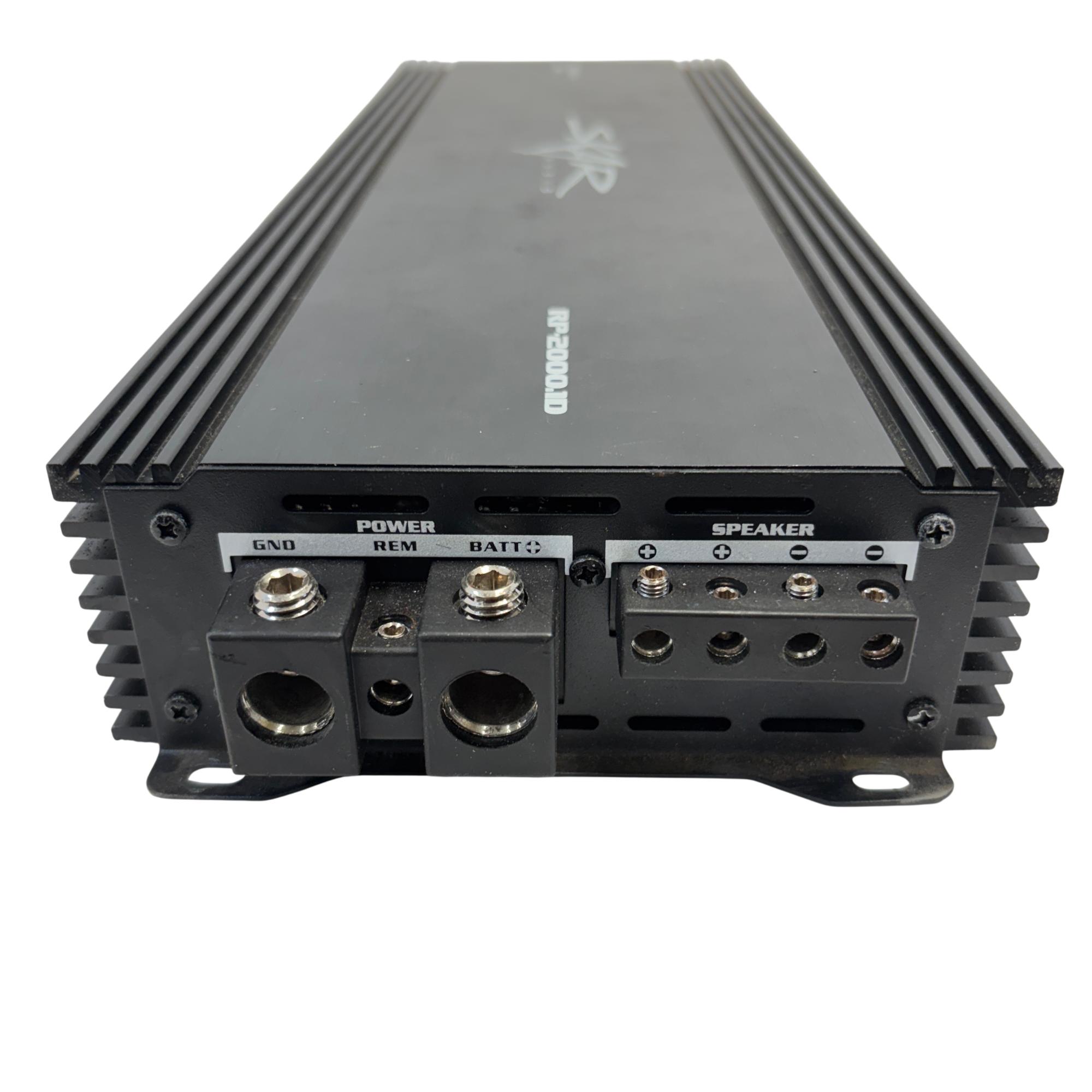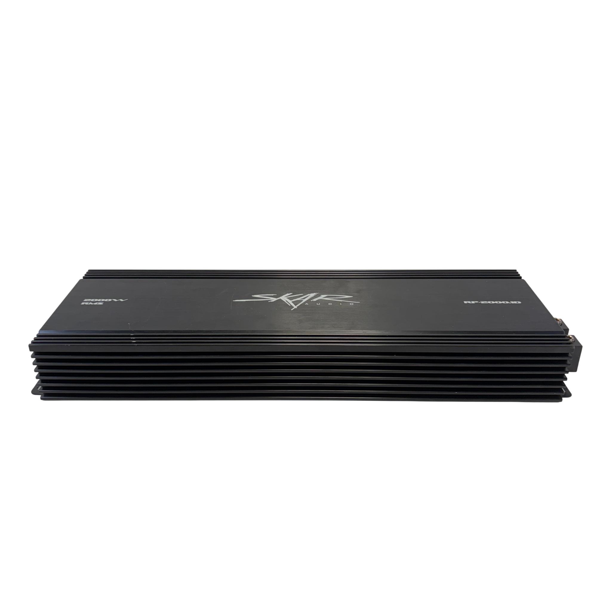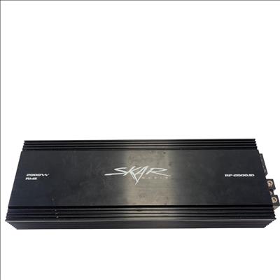 The Skar Audio RP-2000.1D Monoblock Class D 2000 Watt RMS Car Amplifier delivers high-power audio performance with efficient Class D technology, ensuring strong and clear sound output for car audio systems. This amplifier is designed with a durable black casing featuring multiple ports and wired connections to support seamless integration with various audio setups.